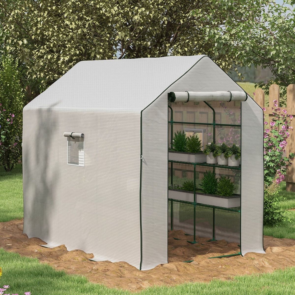 - Walk-in Greenhouse: A large zippered door gives you room to walk planters and tools into your winter greenhouse. Open it or the two mesh-protected windows to vent away heat and humidity, or seal them shut to swiftly to maintain an insulated barrier.
