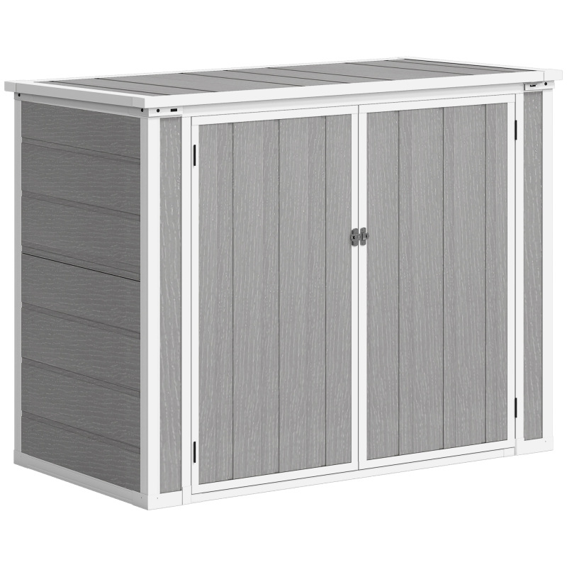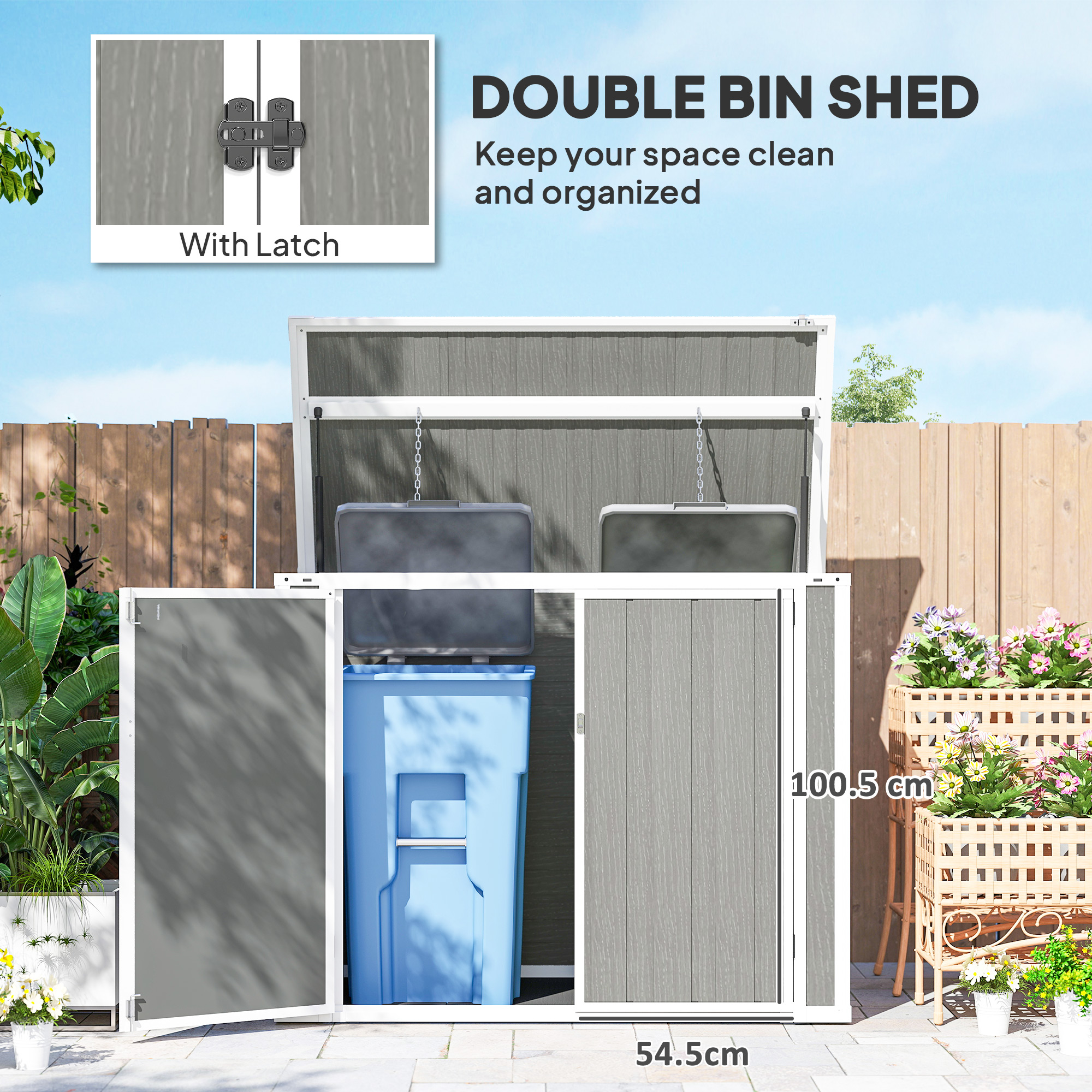 Maximise your outdoor space with the Bin Storage Shed, designed to neatly store two 240L rubbish bins, tools and more. Effortlessly dispose of waste with the pneumatic lifting lid and chain hook, while the lockable double doors keep your items secure. Built with a weatherproof polypropylene shell, this small shed offers both convenience and protection for your garden essentials!