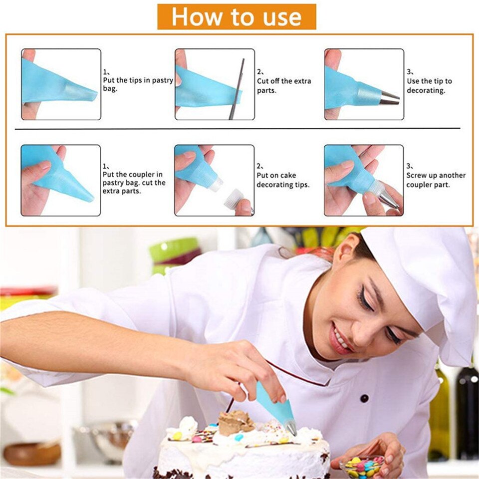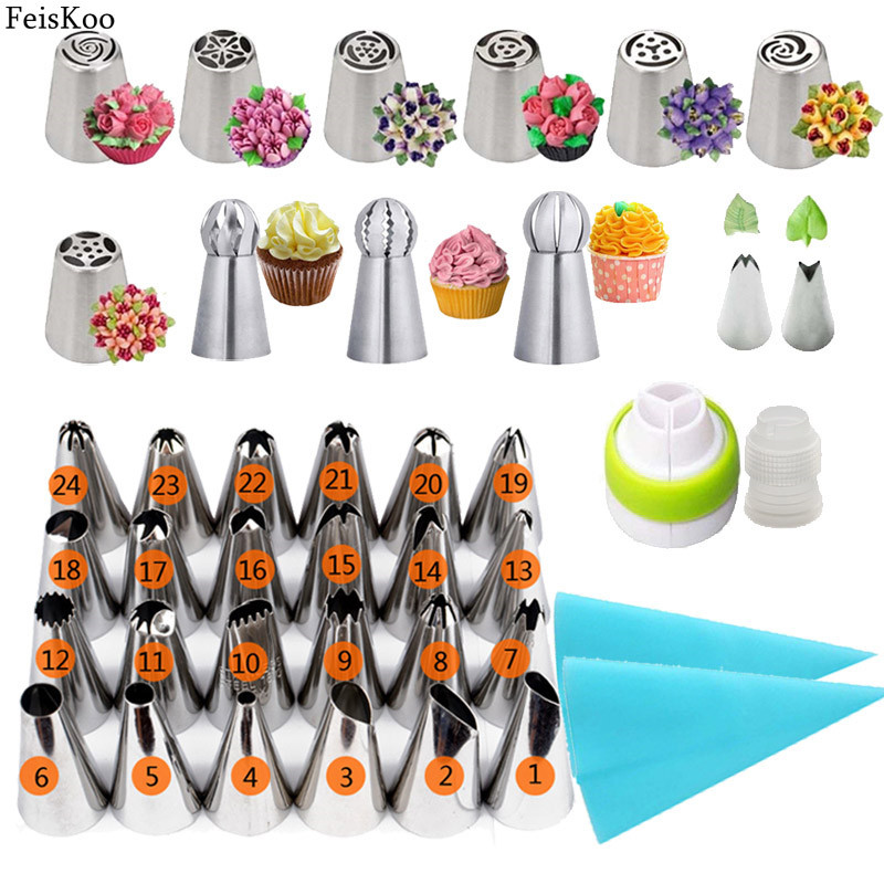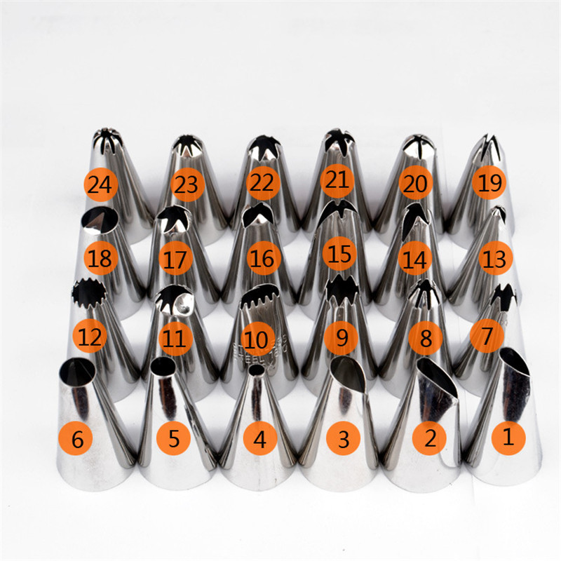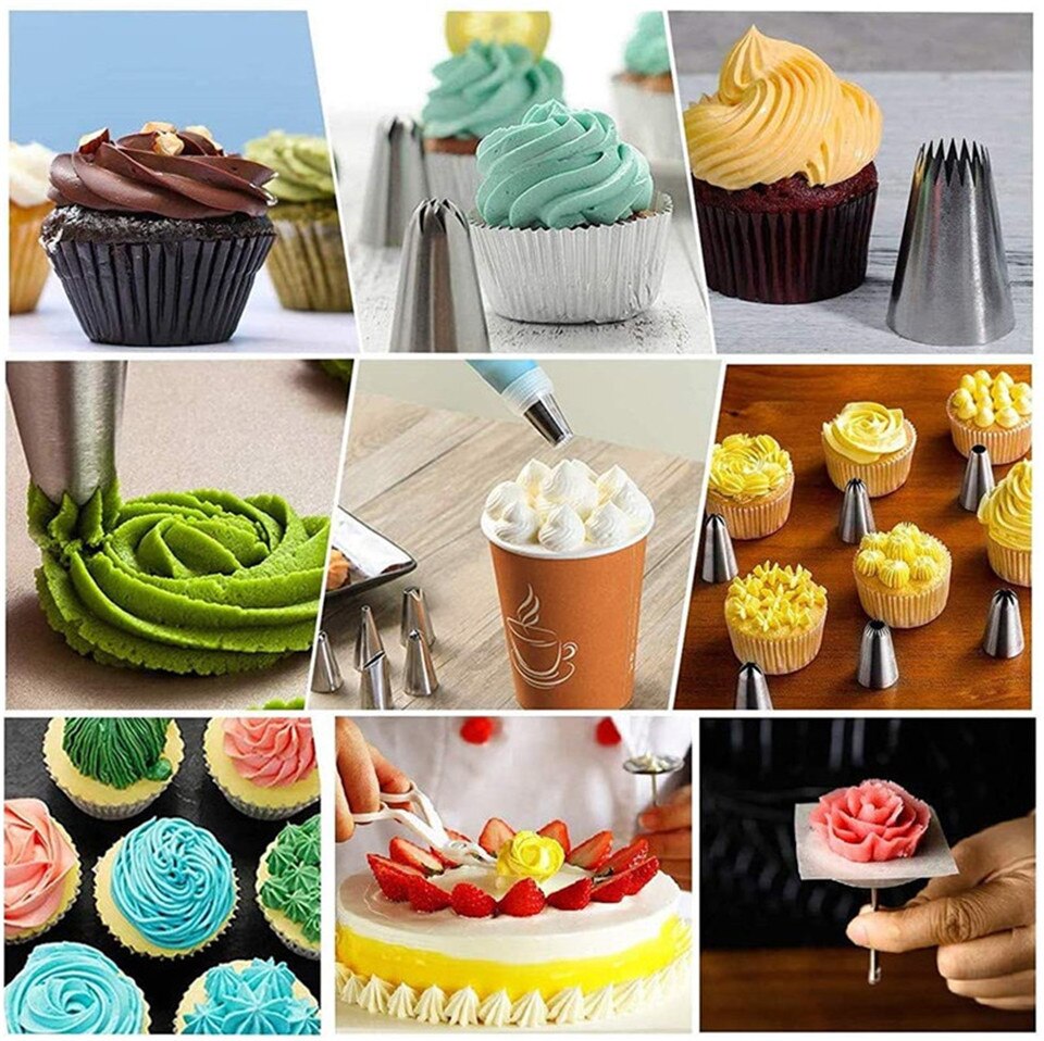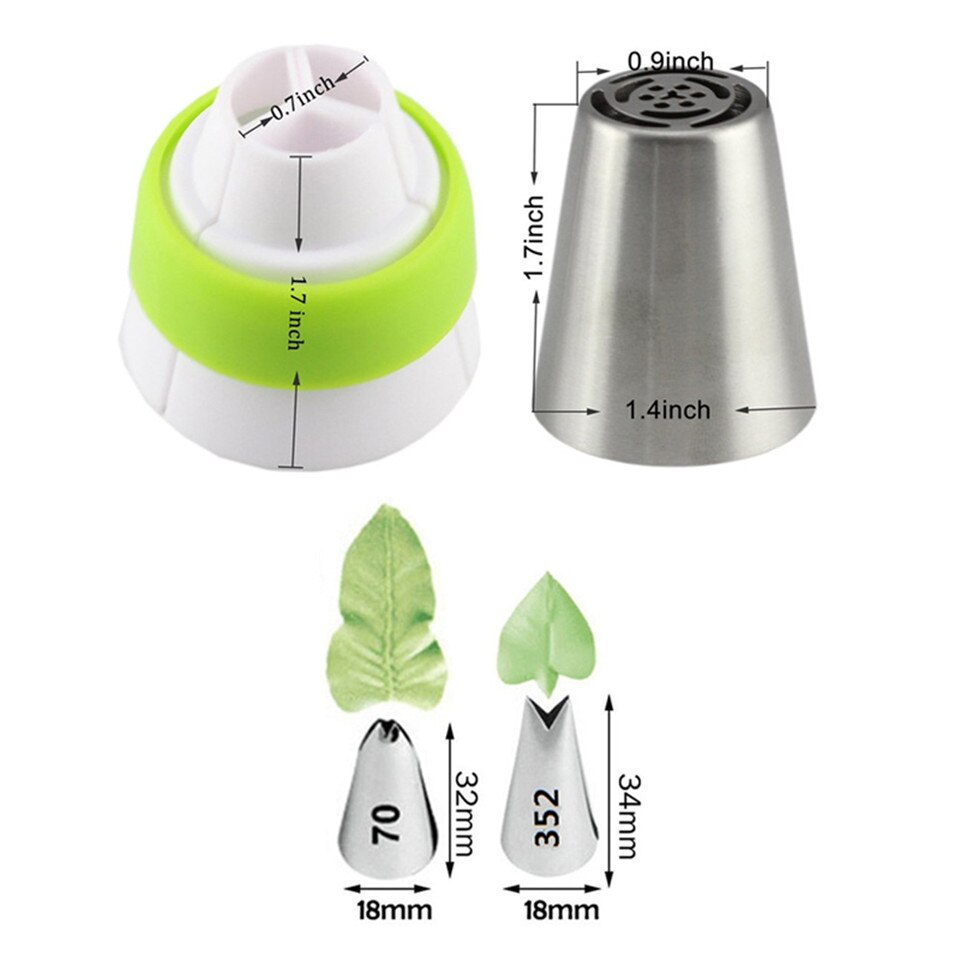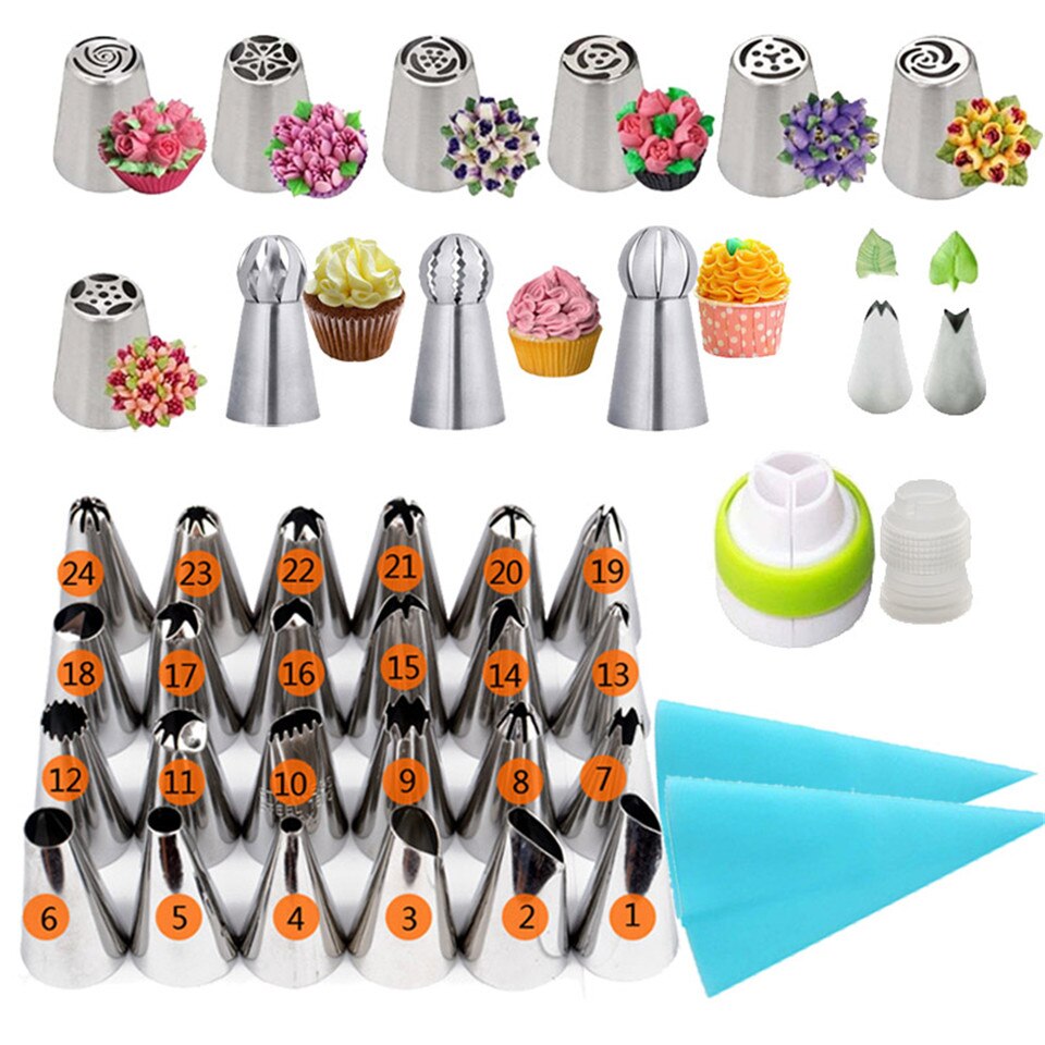 • Package Include: 1 set of cake tools (7 pcs russia nozzle + 3 pcs ball nozzle + 2 pcs leaf nozzle + 24 pcs small nozzle + 1pc large converter + 1pc small converter + 2 pcs silicone bag )