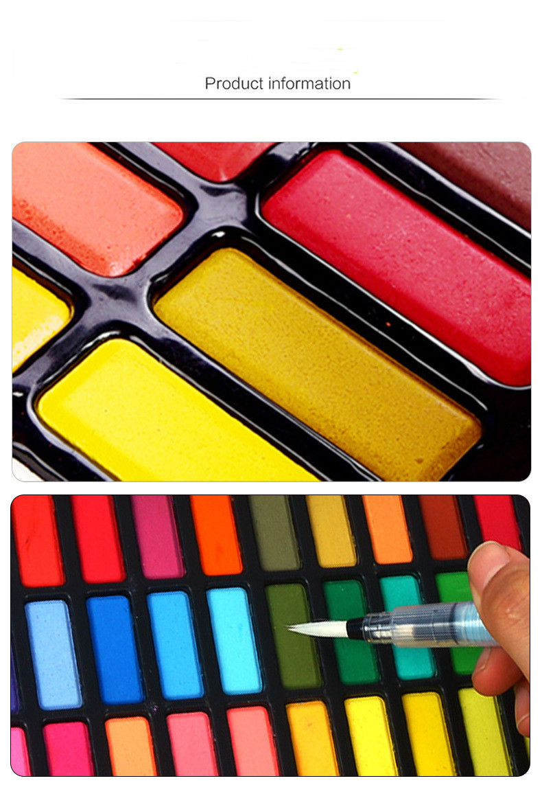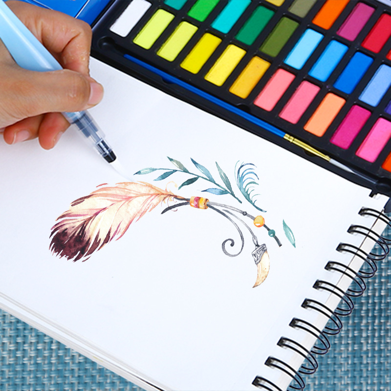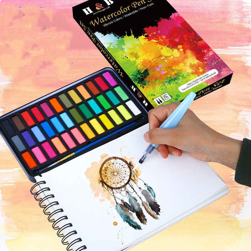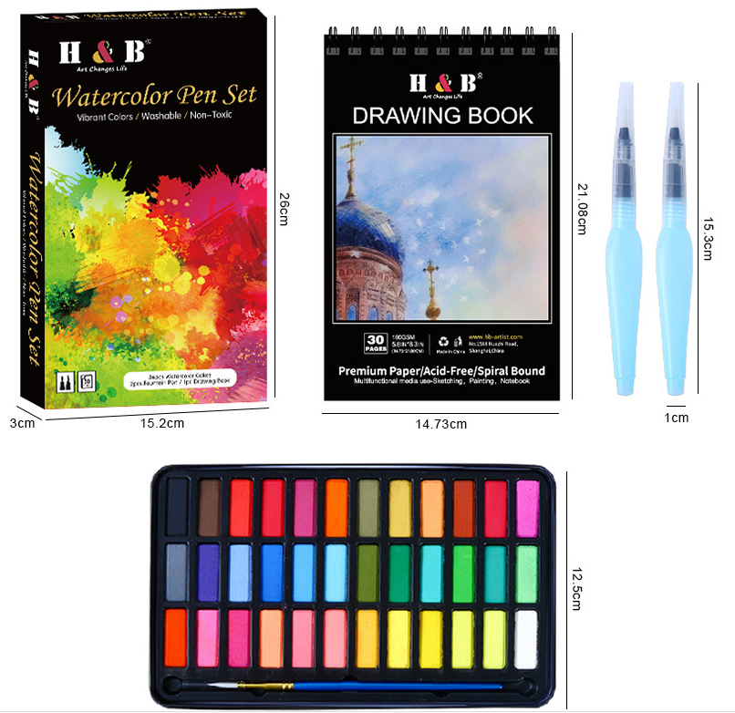 Material Content: 36 colors solid watercolor painting set, 2 fountain pen, 1 A5 drawing book, color box packaging.