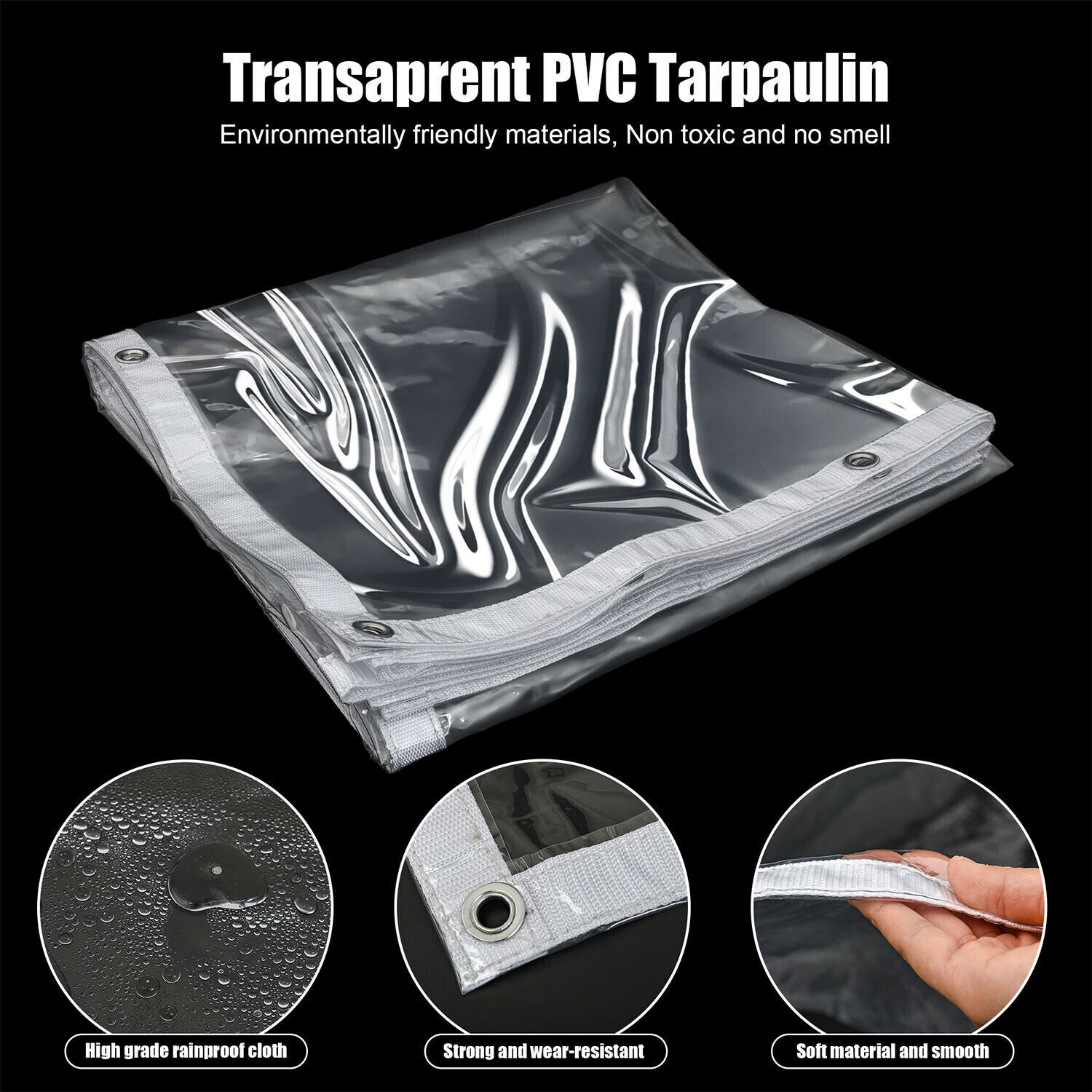 【DURABLE REINFORCED TRANSPARENT PVC PLASTIC TARPAULINS PROTECTIVE COVER 】Thick Material, High Temperature Heat-sealed Double-layer Edging, Firm, Tear-resistant, Durable. Transparency: 100%; Water Resistance Index: 100%; Thickness: About 0.3mm; weight: 400g/m².