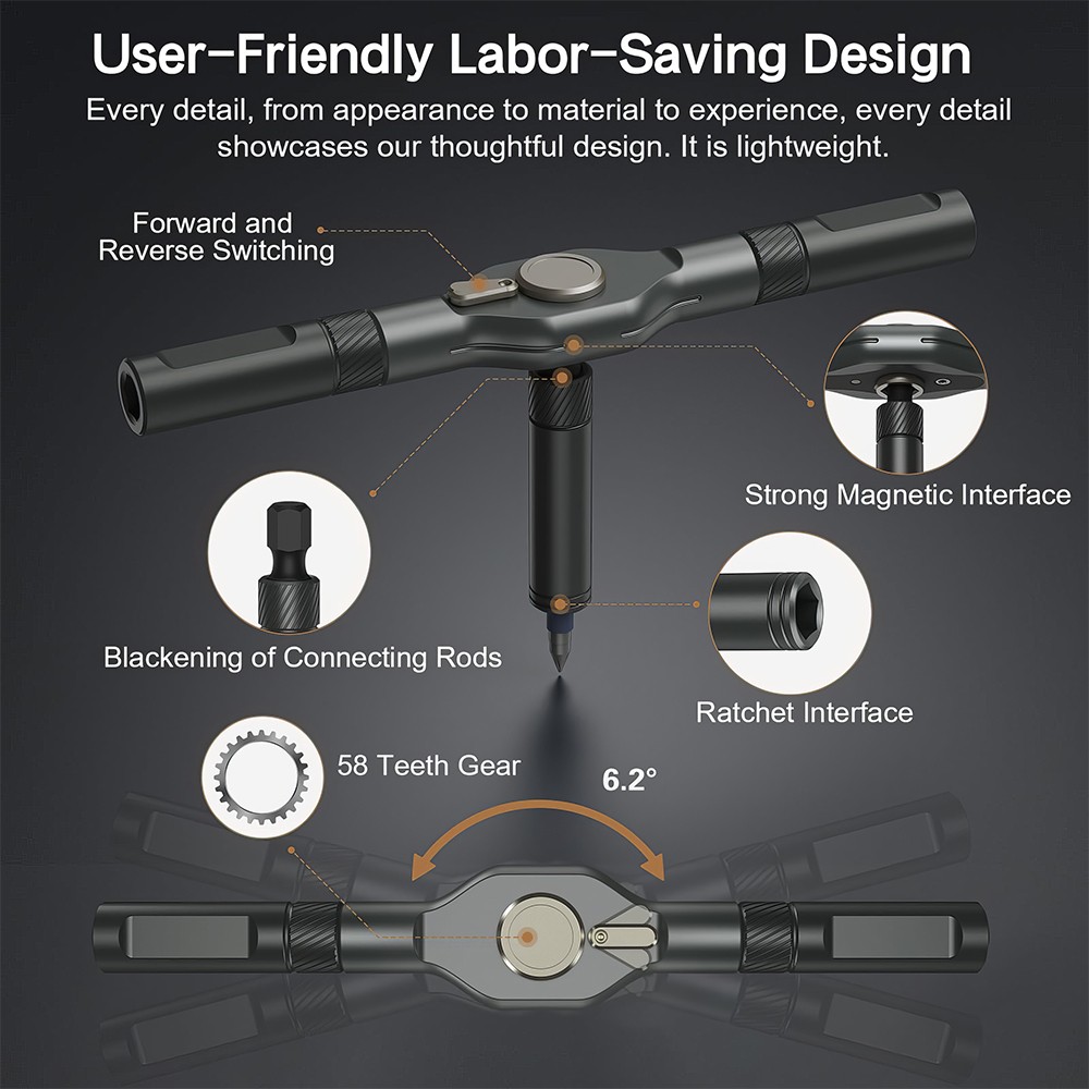 Effortless Ratcheting Mechanism: Equipped with a 6.2-degree ratchet and 58-tooth forward-reverse ratchet mechanism, offering 80% effort savings. With a 50N.m torque, ratcheting screwdriver set tool makes it simple to tighten or loosen screws without wrist adjustments, saving time and effort in every repair job.