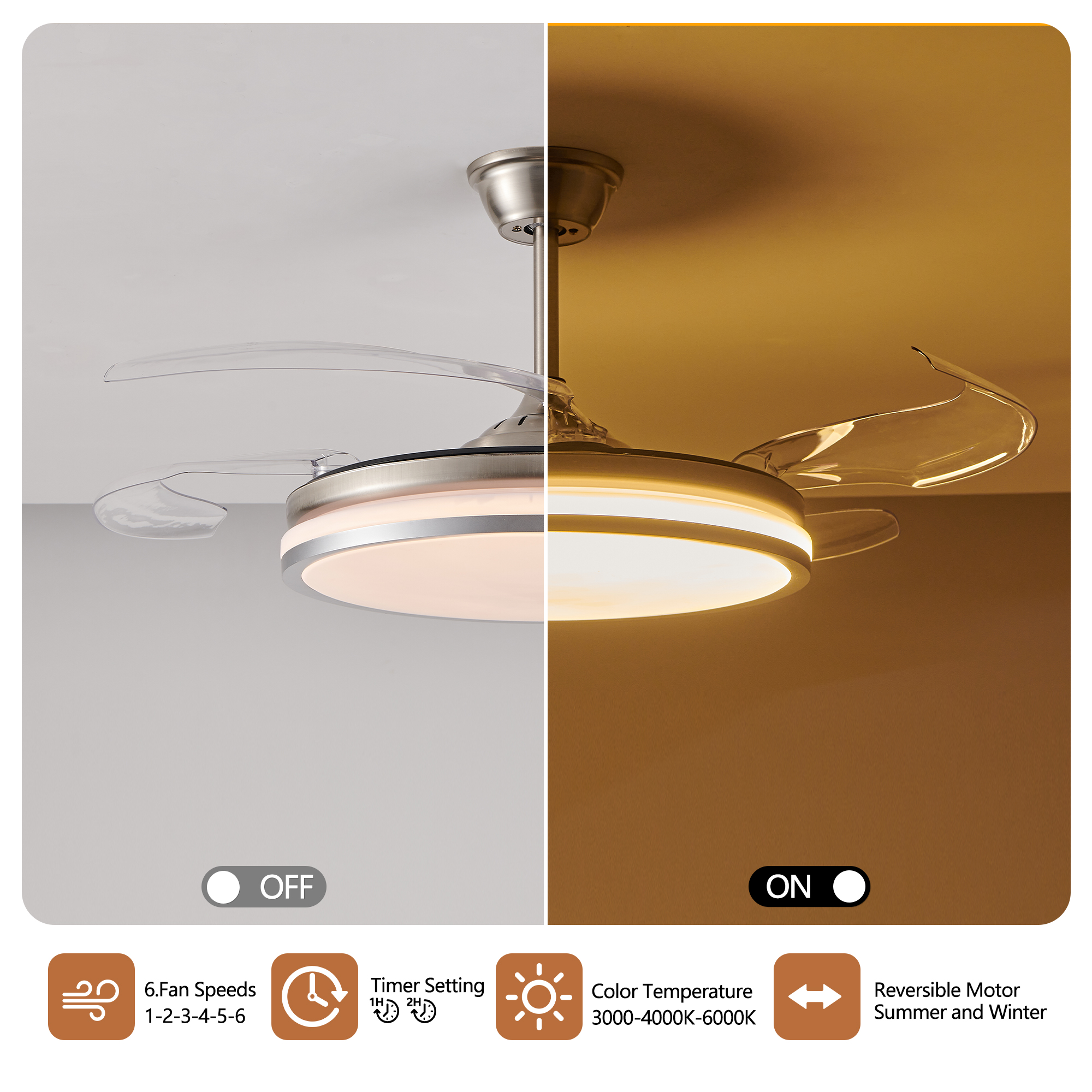 Modern Fashion Design: A design full of modernity, combined with streamlined ceiling fans and soft LED lighting, perfectly integrates into various home styles, enhancing the overall indoor atmosphere.Unique retractable blade design: Innovative retractable blade design that automatically unfolds during use, providing stronger air circulation effect; When not in use, the blades automatically retract to maintain a simple and stylish appearance, saving space.Remote control intelligent operation: Equipped with a remote control, users can easily adjust wind speed, light brightness, and fan mode, and operate comfortably without leaving their seat, making it convenient and practical.Multiple wind speeds and brightness adjustment: Provides multiple wind speed settings to meet the needs of different environments and adapt to various weather and seasonal changes; The brightness of the lighting can be adjusted, from bright work lights to soft leisure lighting, to meet various needs.Quiet and smooth operation: The high-quality motor ensures the smooth operation of the ceiling fan, with extremely low noise, suitable for bedrooms and spaces that require a quiet environment, allowing you to enjoy a peaceful and comfortable night.