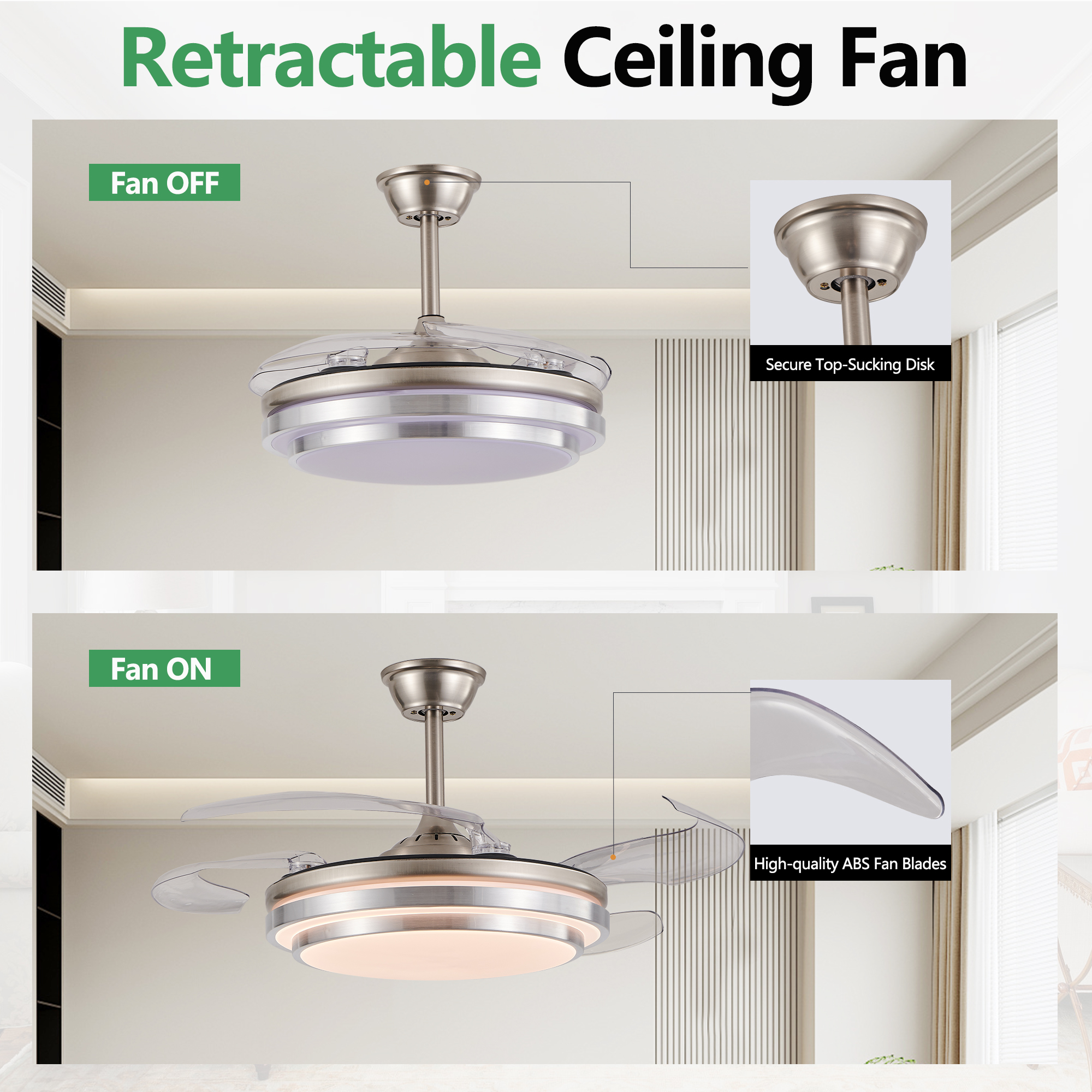 Modern Fashion Design: A design full of modernity, combined with streamlined ceiling fans and soft LED lighting, perfectly integrates into various home styles, enhancing the overall indoor atmosphere.Unique retractable blade design: Innovative retractable blade design that automatically unfolds during use, providing stronger air circulation effect; When not in use, the blades automatically retract to maintain a simple and stylish appearance, saving space.Remote control intelligent operation: Equipped with a remote control, users can easily adjust wind speed, light brightness, and fan mode, and operate comfortably without leaving their seat, making it convenient and practical.Multiple wind speeds and brightness adjustment: Provides multiple wind speed settings to meet the needs of different environments and adapt to various weather and seasonal changes; The brightness of the lighting can be adjusted, from bright work lights to soft leisure lighting, to meet various needs.Quiet and smooth operation: The high-quality motor ensures the smooth operation of the ceiling fan, with extremely low noise, suitable for bedrooms and spaces that require a quiet environment, allowing you to enjoy a peaceful and comfortable night.