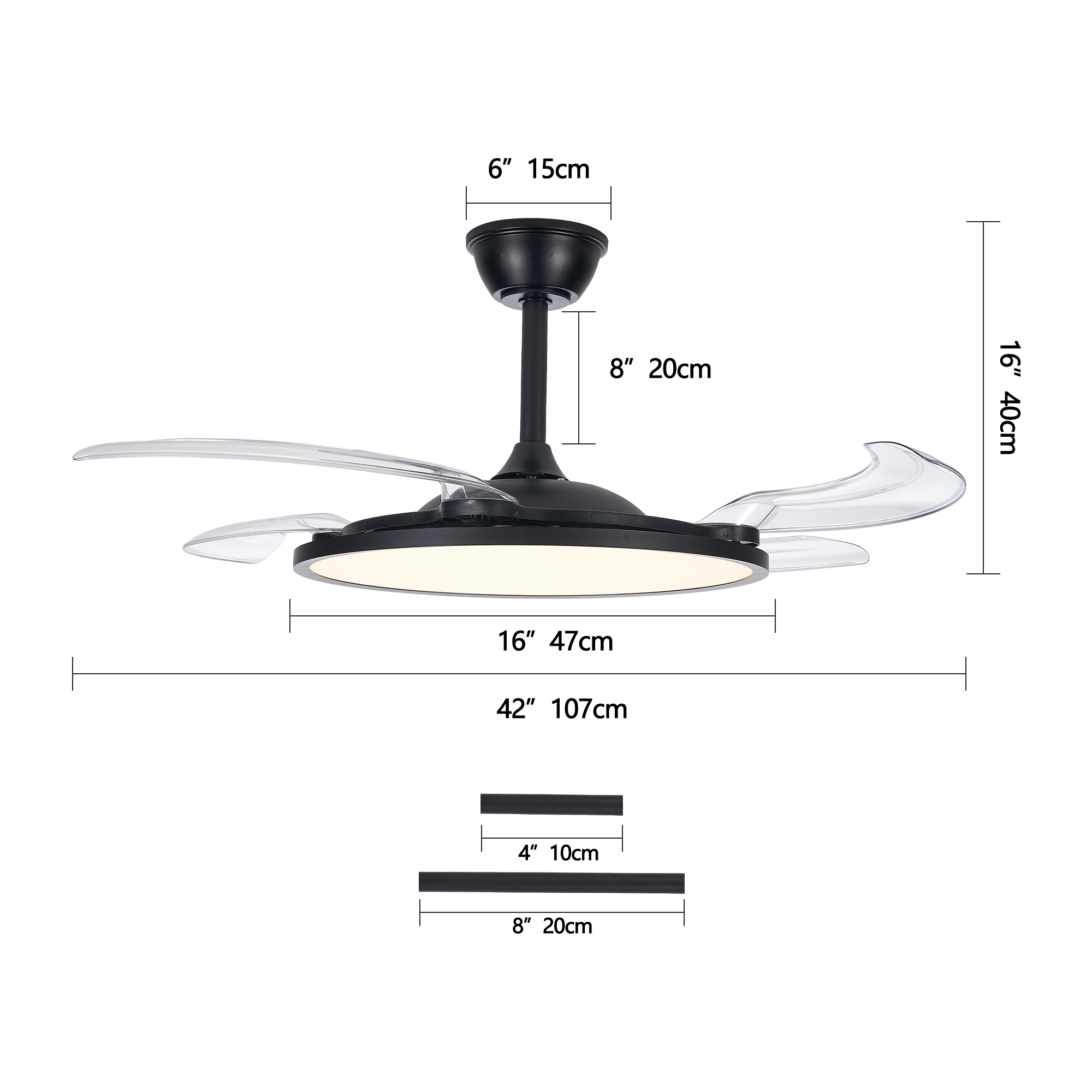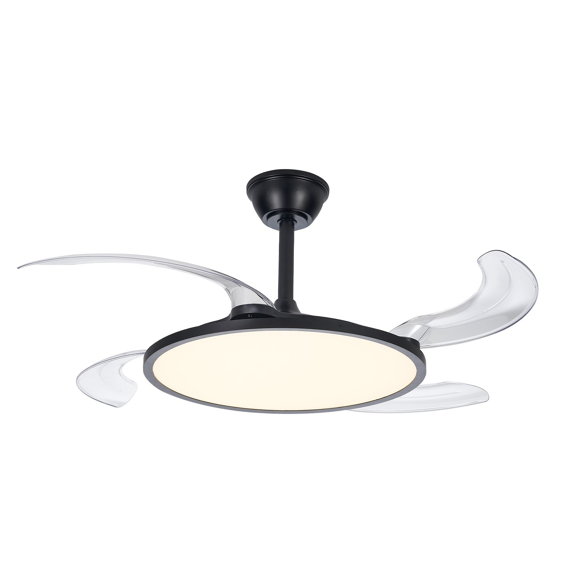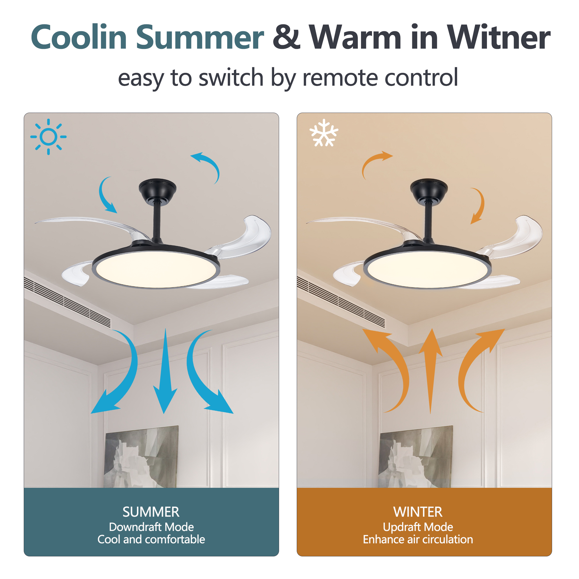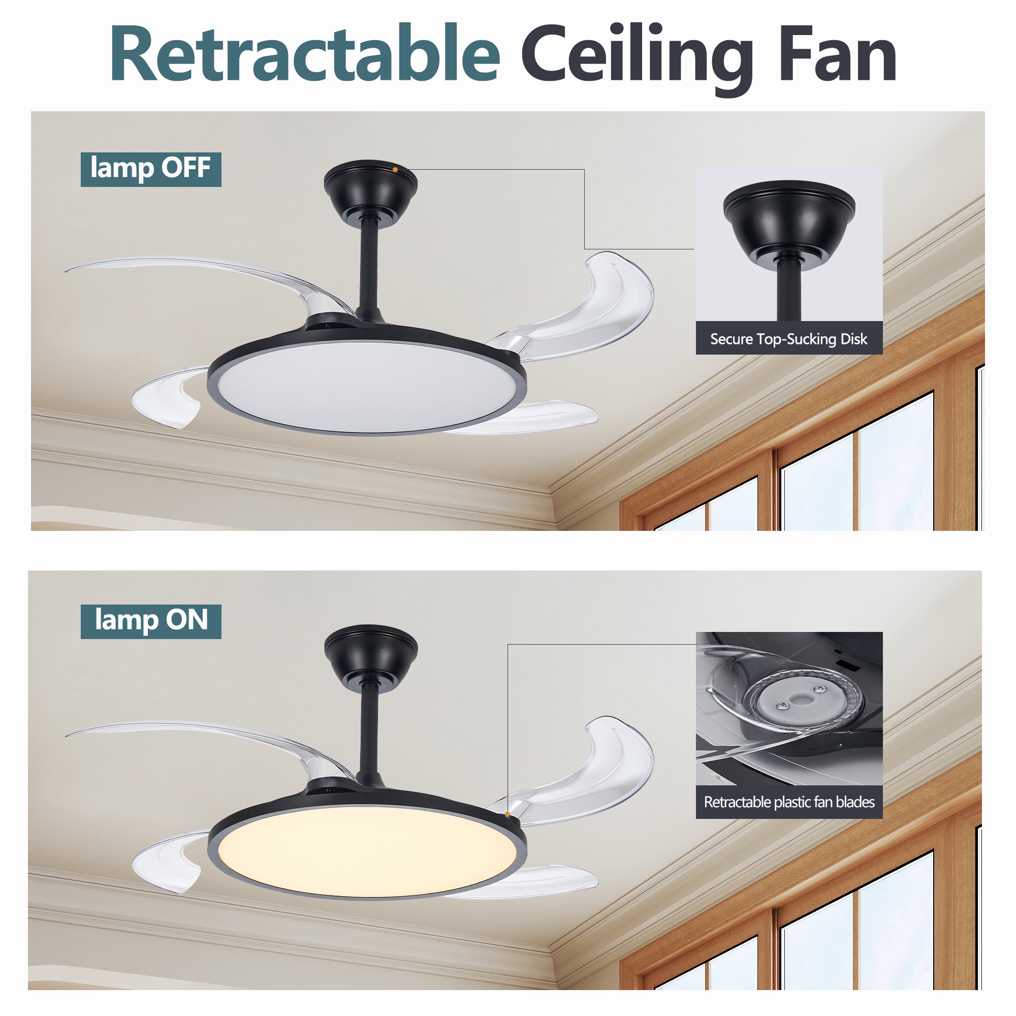 [Ultra-thin Retractable Ceiling Fan]Compact 7.87'' height for low ceilings. The ceiling light is 19.69'' in diameter when contracted, and the fan has retractable blades that extend up to 48'' when used to provide a powerful airflow.Easily integrates into a variety of indoor environments without taking up space and improving safety distance. Whether it is a living room,bedroom,children's room or dining room, it can be easily installed to enhance indoor comfort.[360° Surround Ceiling Fan with Lights]All-around encirclement air supply design,more comfortable to avoid cold wind blowing directly.6 wind speeds to meet your daily needs in different scenarios,whether it's a gentle breeze or a strong cool wind,can be easily controlled with the remote control/app.Silent motor with 2-hour timer shutdown function,let you sleep without worrying about forgetting to turn off the ceiling fan.[Full Spectrum Lighting for Eye Protection]Upgraded low profile ceiling fan with light uses full spectrum lighting technology to make up for the light waves that ordinary LED lack,closer to natural light, high CRI, more protective of your eyes.3 color temperatures are adjustable at will.Infinitely dimmable function,you can freely adjust the brightness according to your own preferences and needs.Smart memory function remembers your every choice,making life more convenient.[Smart APP/Remote Control]This modern ceiling fan with light can be turned on at the same time,and the fan and light can be controlled separately,both can be easily controlled with the app and remote control.Whether you are lying on the sofa or in bed,you can easily control the functions of the smart ceiling fan.
