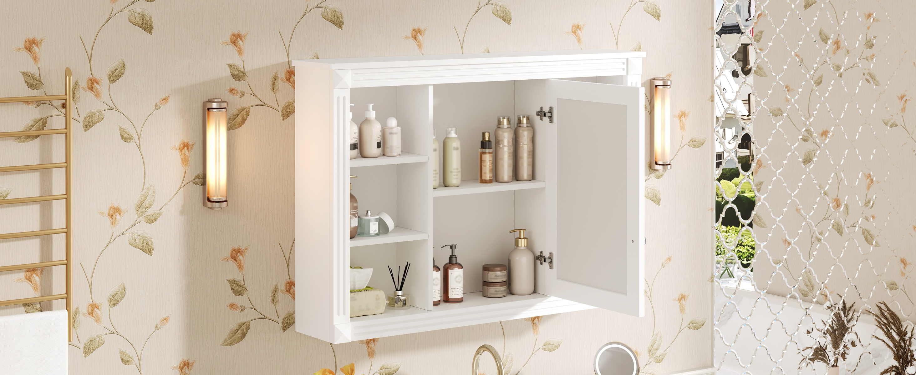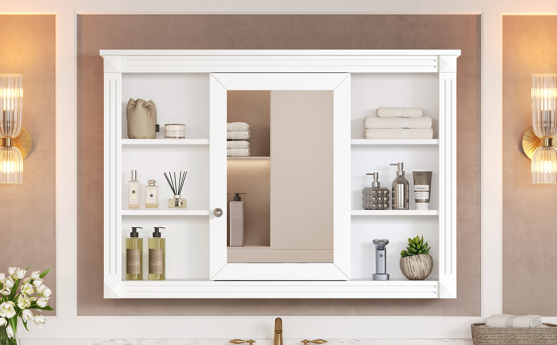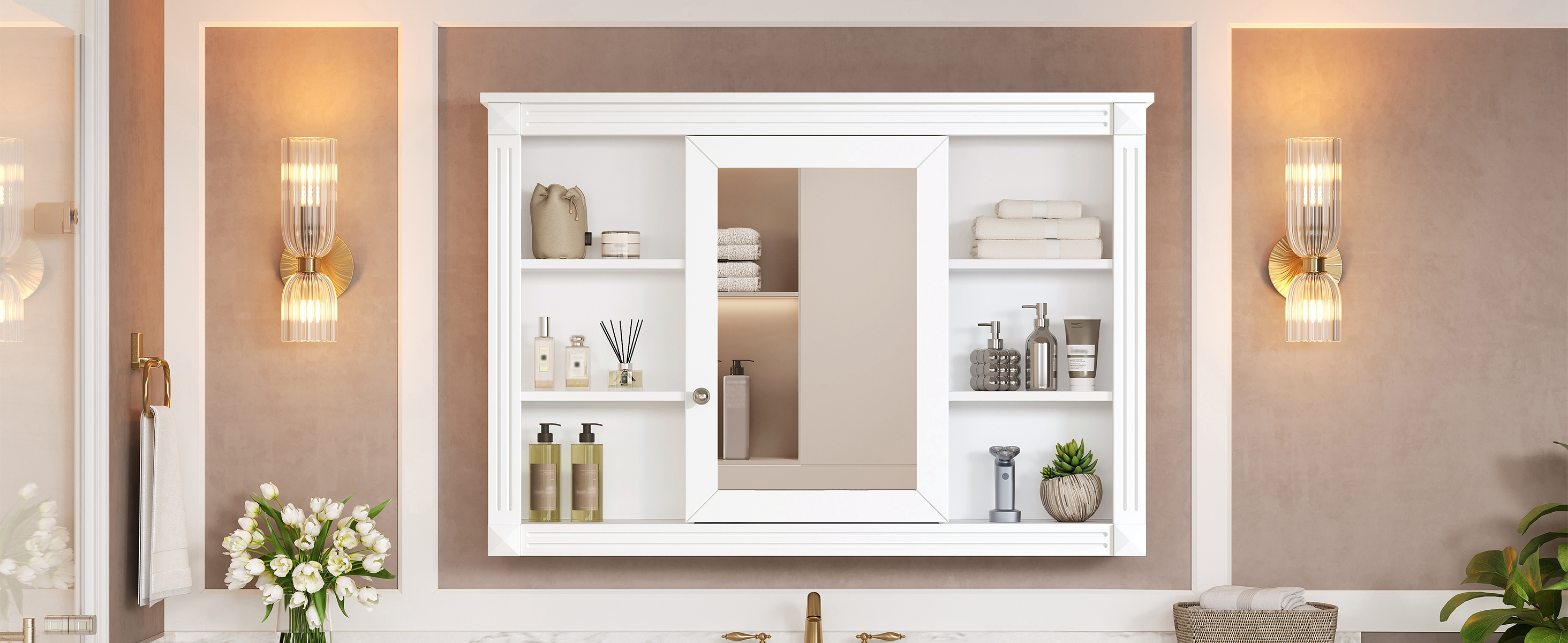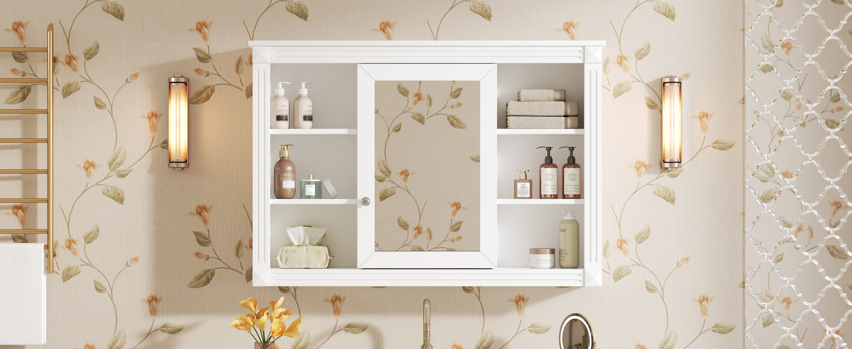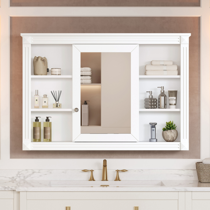 This wall-mounted mirror cabinet perfectly combines modern design with excellent functionality. It is made of high-quality MDF board, which is durable and environmentally friendly. The high-definition mirror provides clear reflections, making every use convenient and quick. The clever design combines hidden and open shelves to store personal items and keep the space tidy, while displaying commonly used items for easy access. Two built-in storage cabinets meet large-capacity storage needs and perfectly hide clutter. The three-layer adjustable storage board allows you to flexibly adjust the storage space according to your needs and adapt to the storage of different items. The included towel rod design allows you to easily hang towels or clothes, increasing the practicality and convenience of the bathroom. Whether it is the bathroom, bedroom or other space, this mirror cabinet can provide a neat, practical and beautiful storage solution to improve the quality of your home life.