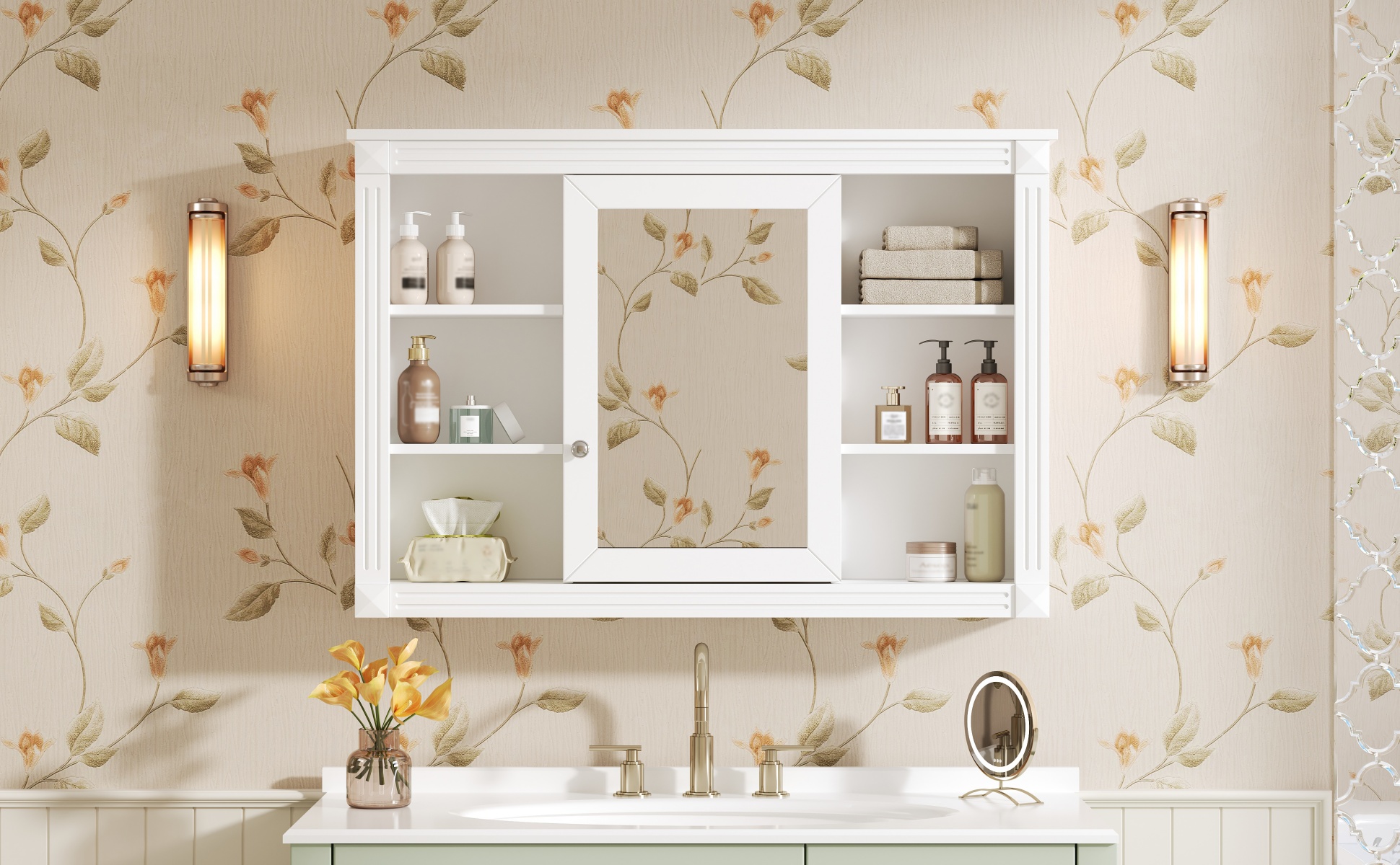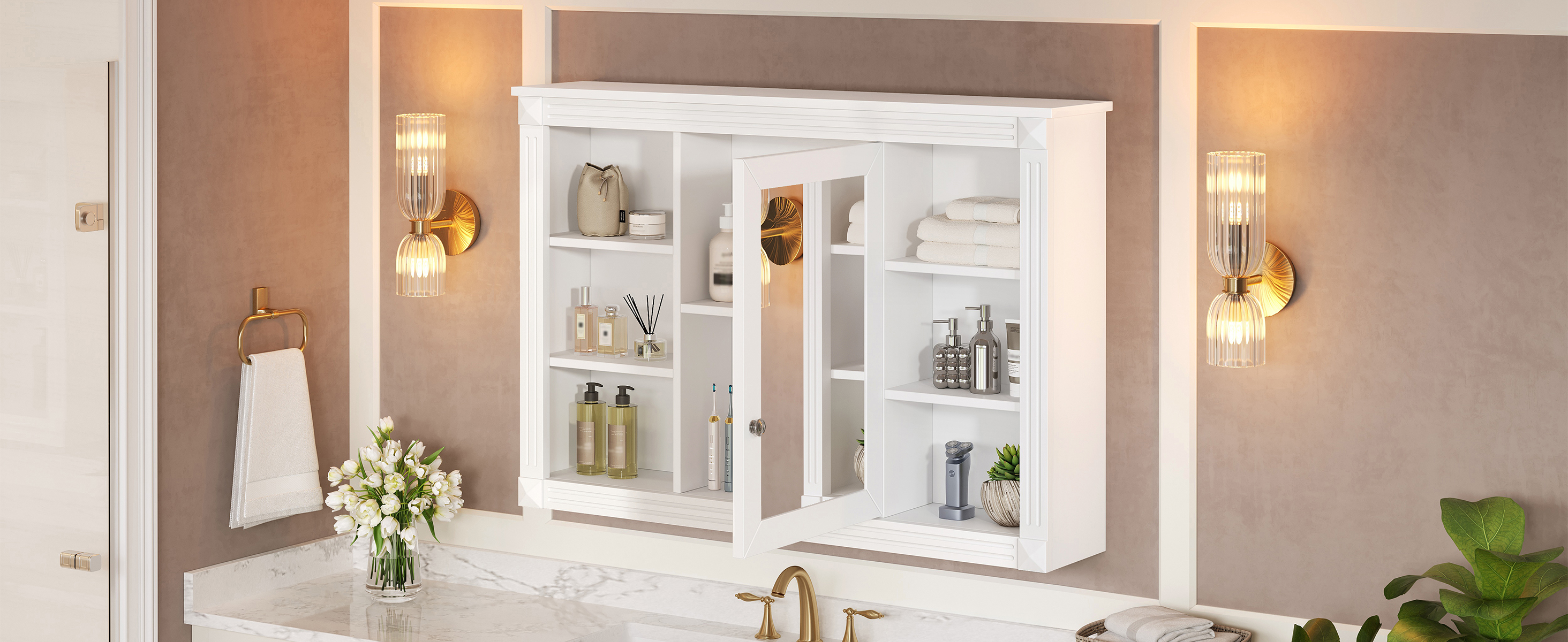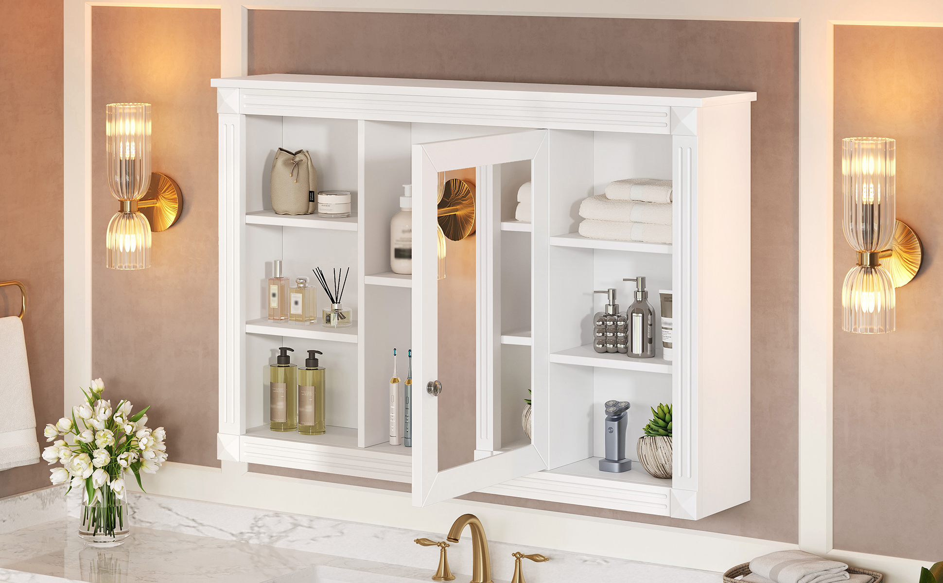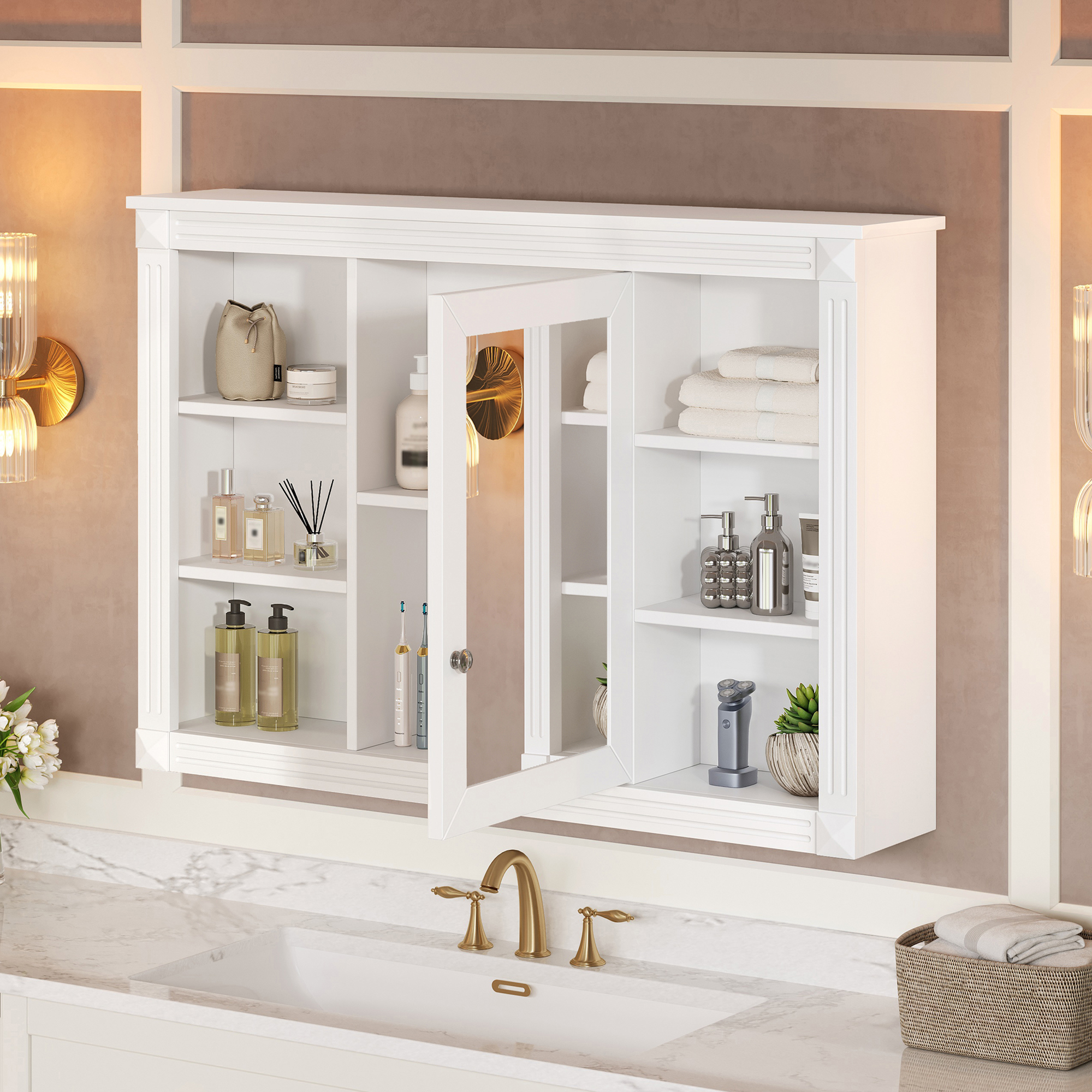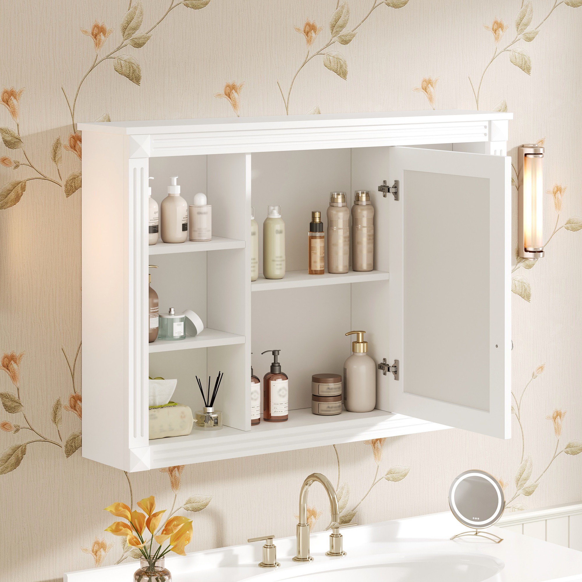 This wall-mounted mirror cabinet perfectly combines modern design with excellent functionality. It is made of high-quality MDF board, which is durable and environmentally friendly. The high-definition mirror provides clear reflections, making every use convenient and quick. The clever design combines hidden and open shelves to store personal items and keep the space tidy, while displaying commonly used items for easy access. Two built-in storage cabinets meet large-capacity storage needs and perfectly hide clutter. The three-layer adjustable storage board allows you to flexibly adjust the storage space according to your needs and adapt to the storage of different items. The included towel rod design allows you to easily hang towels or clothes, increasing the practicality and convenience of the bathroom. Whether it is the bathroom, bedroom or other space, this mirror cabinet can provide a neat, practical and beautiful storage solution to improve the quality of your home life.