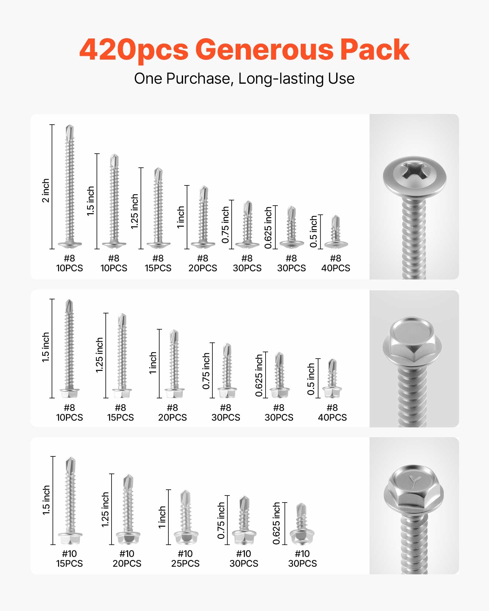 Well-Stocked Assortment: This stainless screw assortment includes 420 screws in 18 carefully planned sizes, covering common #8 and #10 specifications with both Phillips washer and hex head types. Extra quantities are provided for frequently used sizes. Whether for bulk use in large projects or occasional repairs, it ensures reliable supply without material shortages