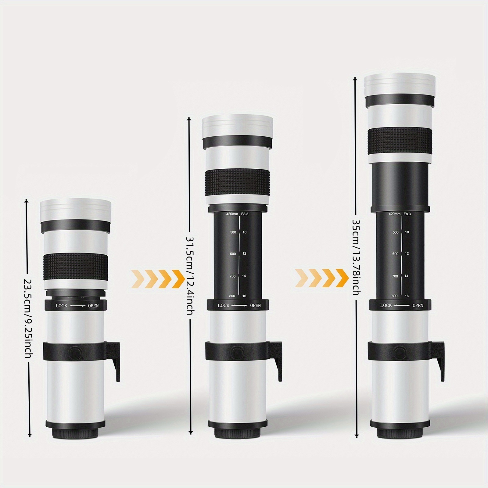 Product information:Color: White Zoom range: 420–800mm Compatible cameras: Sony, Nikon, Canon
