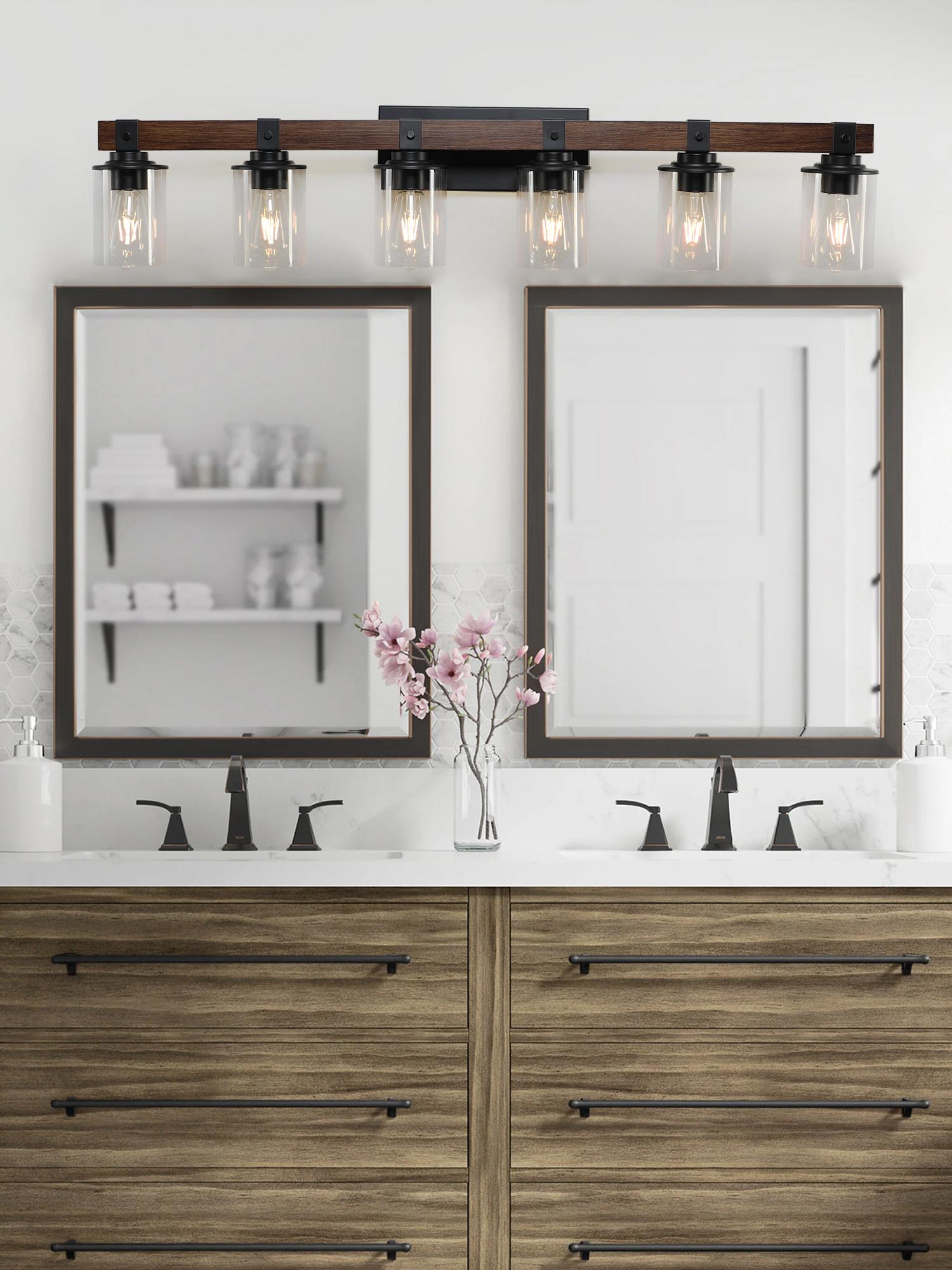 Rustic & Farmhouse Design:A combination of black and wood design brings modernity and rustic style, which shows a simple and pure atmosphere and perfectly suits for your home decoration.Premium Material:Our bathroom light fixture is made of high quality metal and wood, compatible with incandescent, LED, CFL and other bulbs of E26 standard medium base .Maximum power 60W, (Bulbs NOT Included).Applicable Scenarios:This 6-light bathroom light fixture perfectly transforms a bathroom into a romantic, rustic relaxing atmosphere for any bathroom and vanity setting in a farmhouse, urban industrial or vintage electric interior.Easy to install:All mounting hardware for quick and easy installation are included in the package.