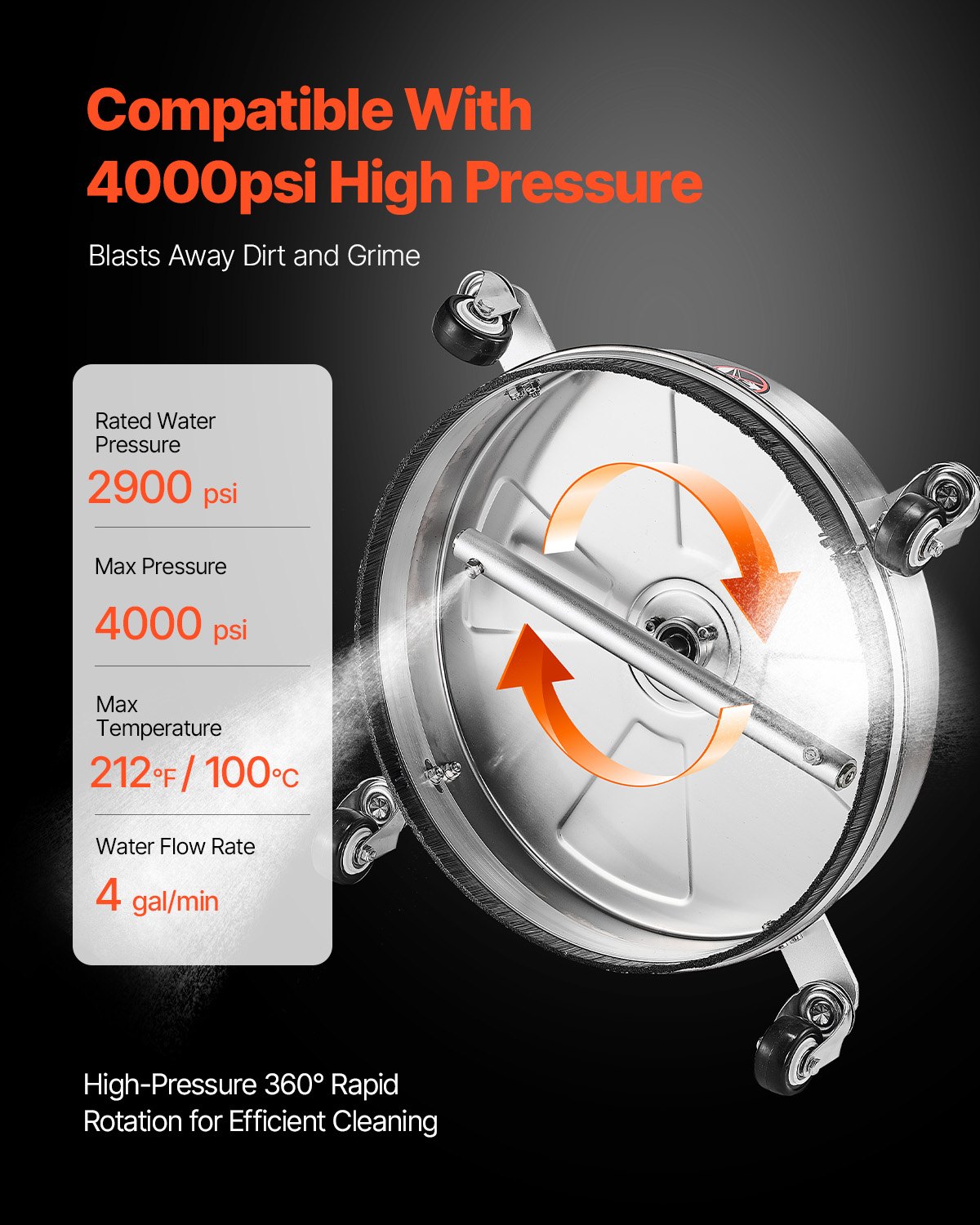 VEVOR 430 mm Hochdruckreiniger-Oberflächenreiniger, Flächenreiniger aus Edelstahl mit 4 Rädern, max. 4000 PSI, 1/4 Zoll Schnellanschluss, 2 Sprühdüsen, 2 verlängerte Stäbe für Beton, Terrasse, Deck
