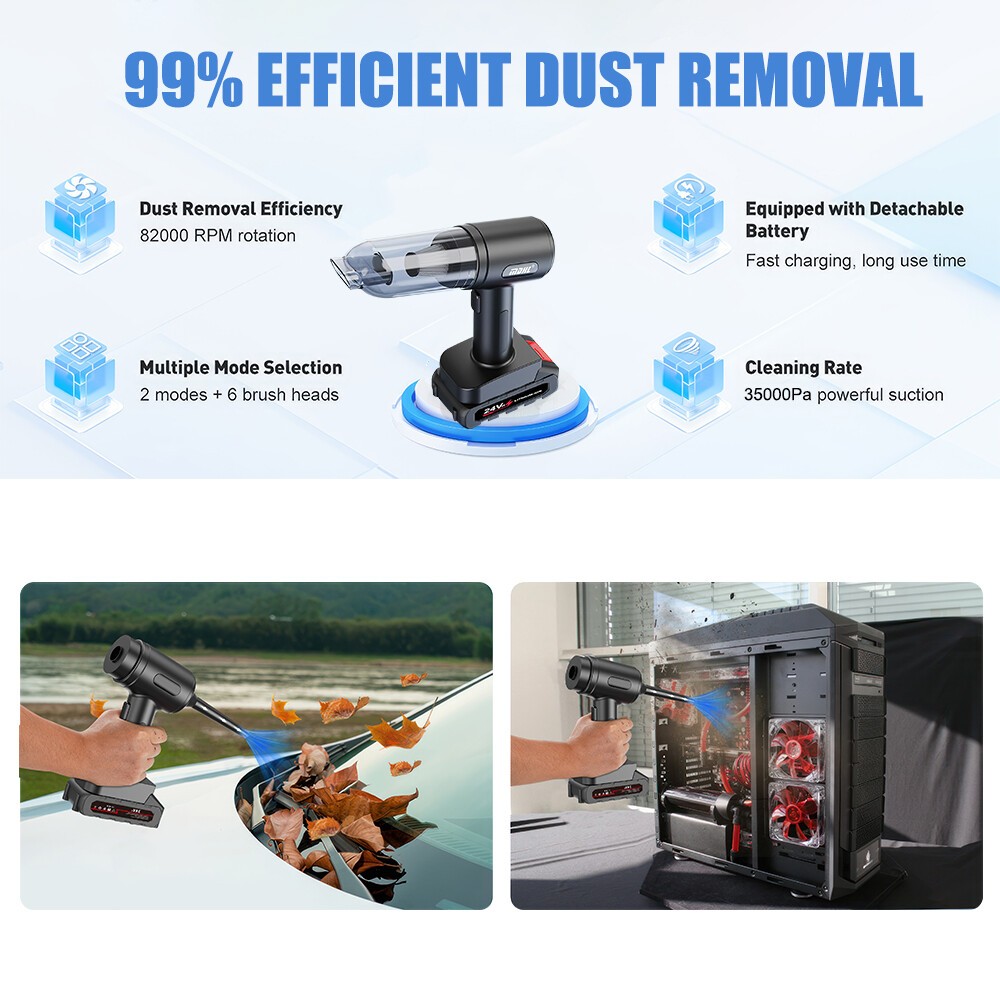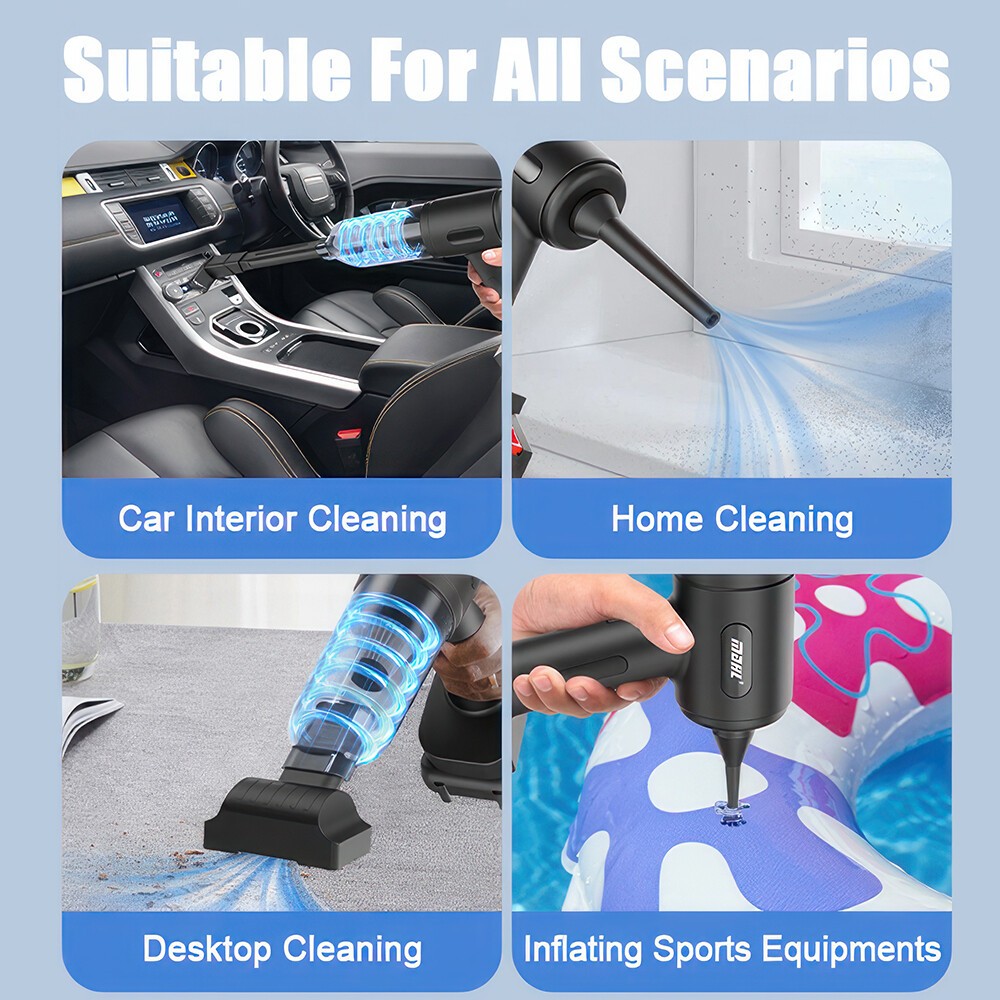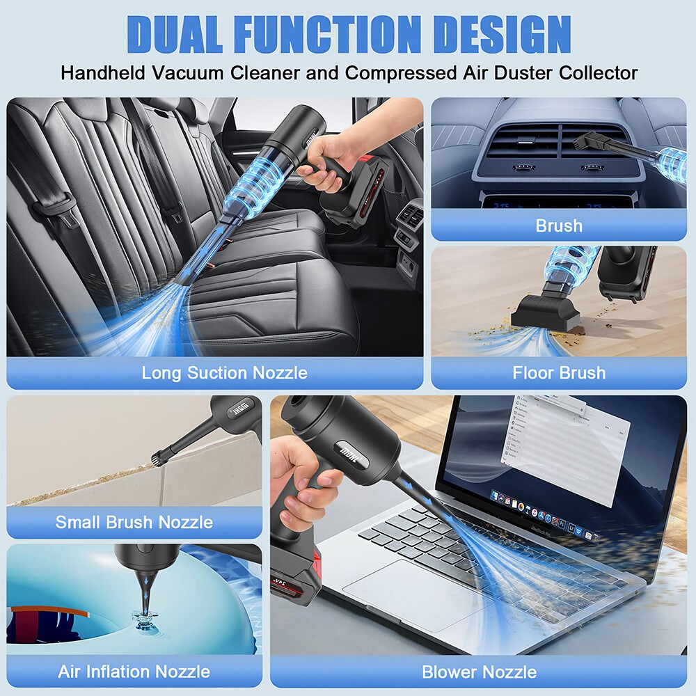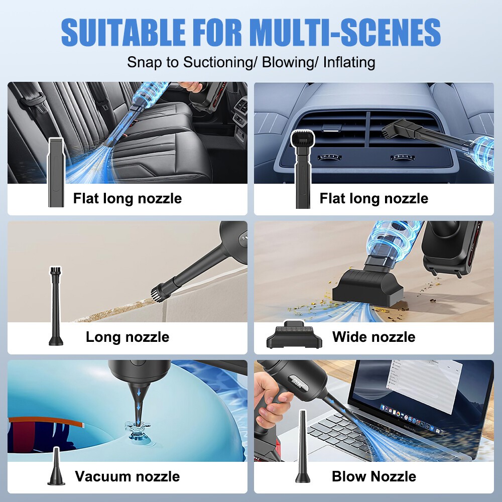 【2-IN-1 Car Vacuum Cleaner】This handheld vacuum cleaner features multiple working modes (suction, blowing, and inflation) and can be used for various cleaning tasks. Floor brushes and nozzle brushes can easily remove dirt and debris, while blowers can clear dust from narrow Spaces such as keyboards. The quick inflation function is perfect for items like swimming rings, enhancing family fun and outdoor activities.