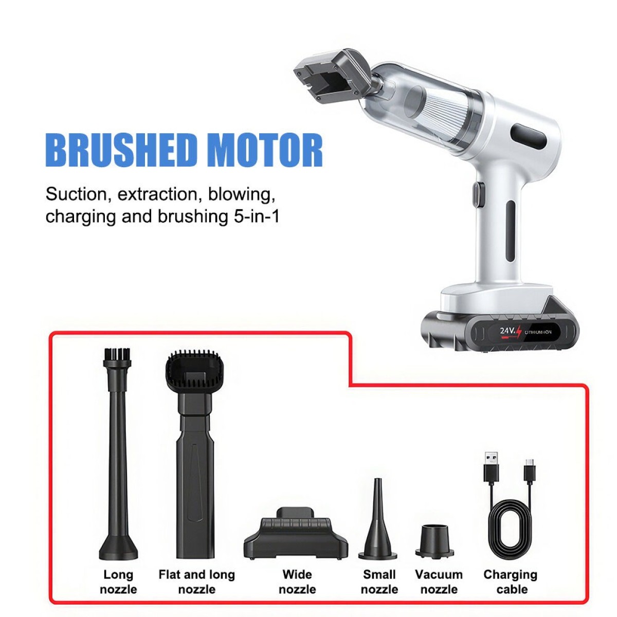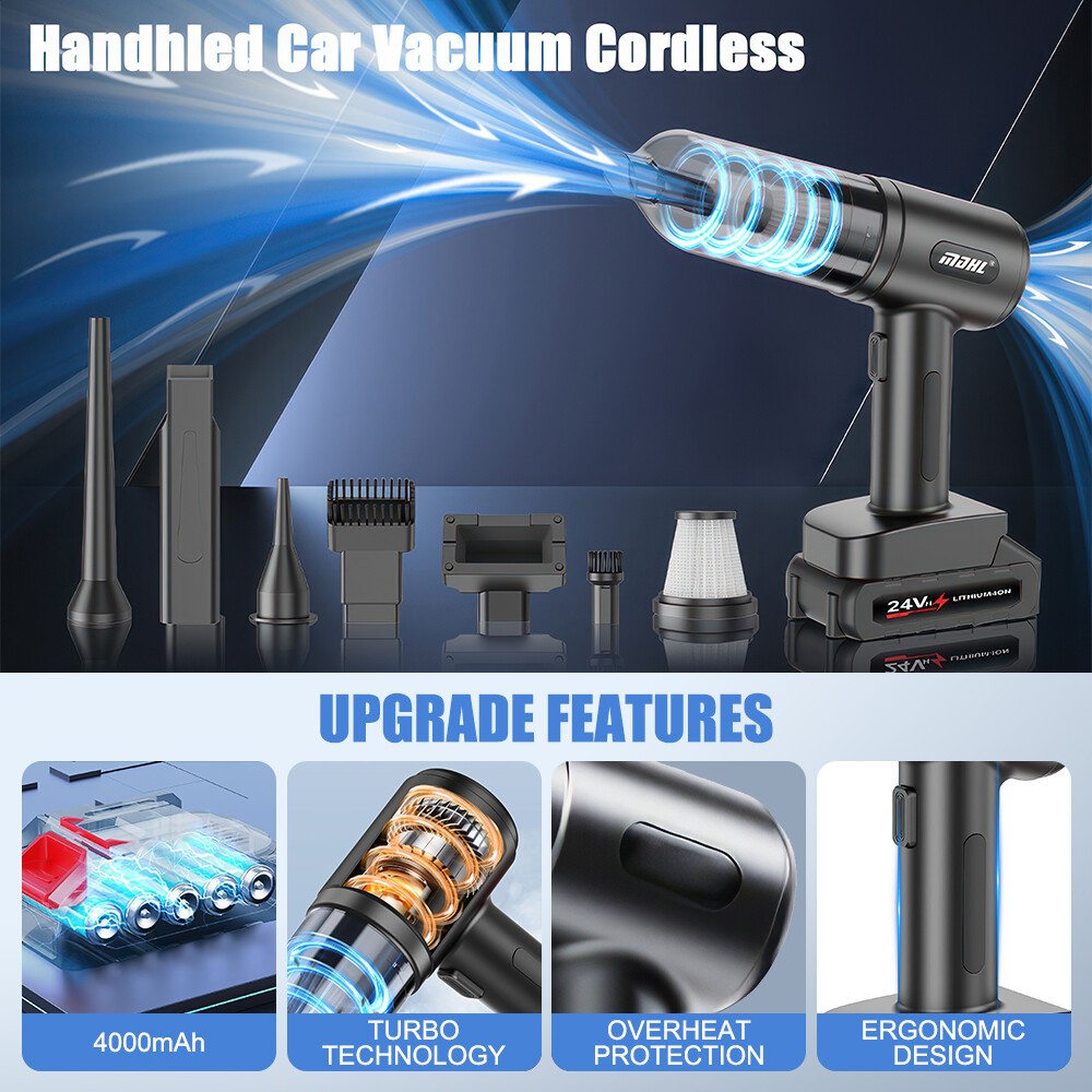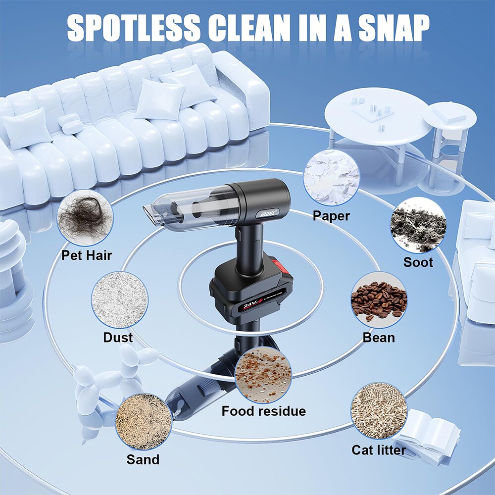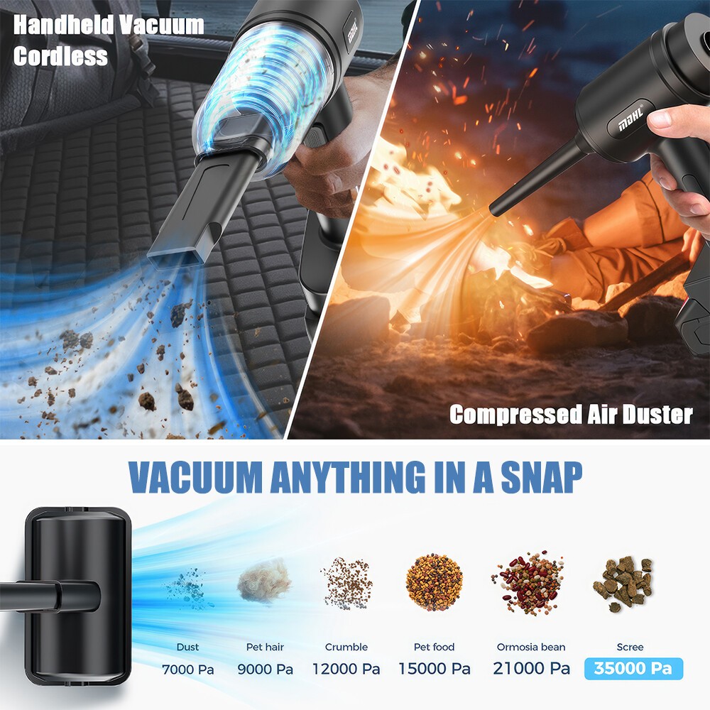 【2-IN-1 Car Vacuum Cleaner】This handheld vacuum cleaner features multiple working modes (suction, blowing, and inflation) and can be used for various cleaning tasks. Floor brushes and nozzle brushes can easily remove dirt and debris, while blowers can clear dust from narrow Spaces such as keyboards. The quick inflation function is perfect for items like swimming rings, enhancing family fun and outdoor activities.