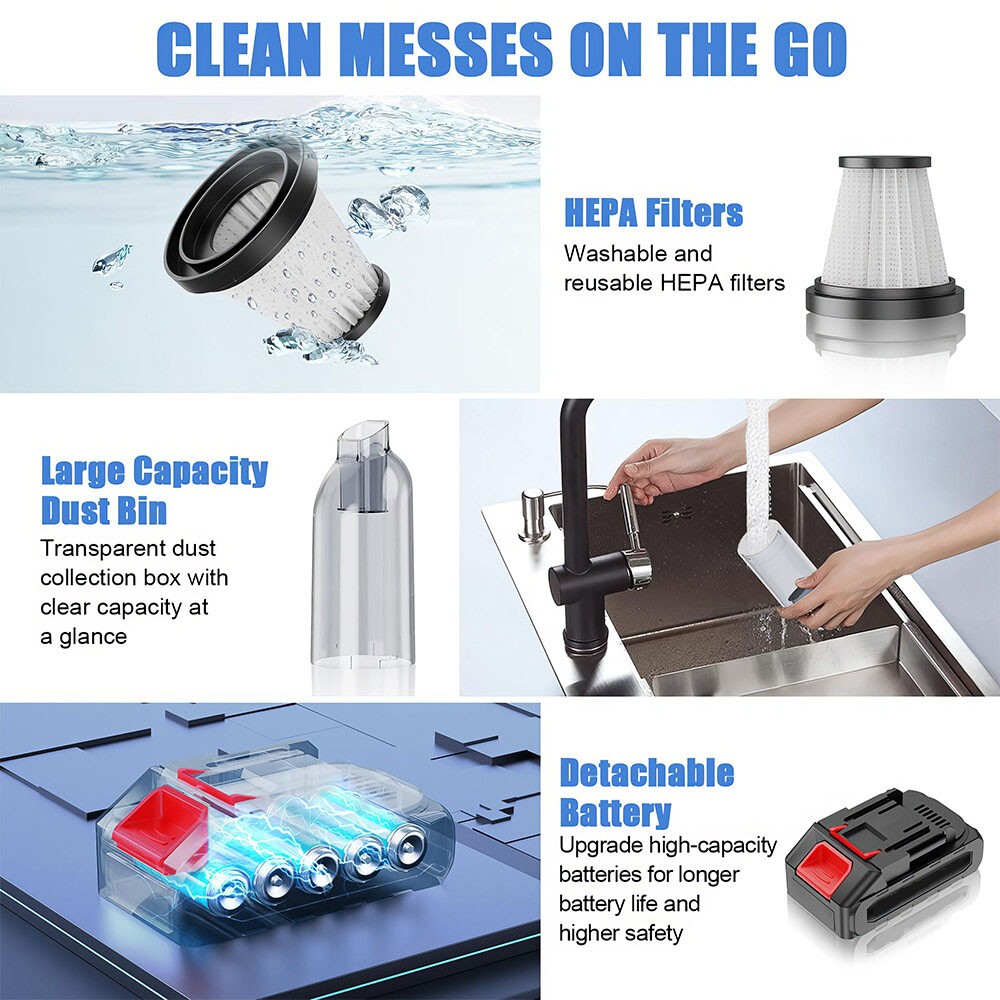【Portable and Cordless Design】This handheld cordless vacuum cleaner bids farewell to tangled cables. It weighs only 0.4 kilograms, is very light and easy to carry. Compact in size, it is convenient to store in a narrow space. It is very suitable for cleaning cars, living rooms or preparing for outdoor activities, and can effectively clean mattresses, sofas and pet hair.