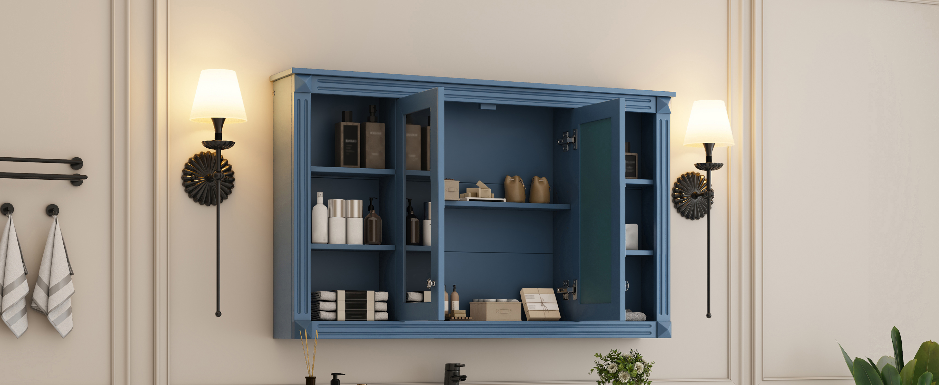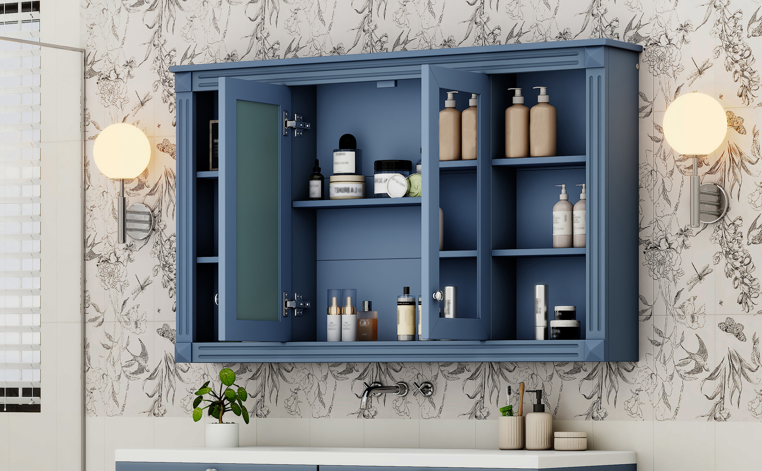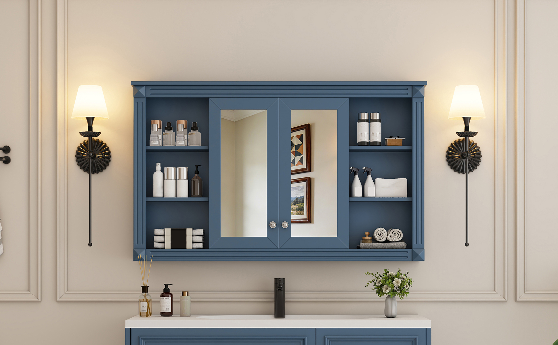 This elegant wall-mounted mirror cabinet masterfully combines intelligent storage with refined design, making it a versatile addition to any room. It features a spacious concealed compartment behind a crystal-clear mirror, complete with an adjustable shelf that offer three different height settings for complete customization. The design also incorporates accessible open shelving for frequently used items. Finished with delicate sculpted details and high-quality hardware, it provides a perfect blend of practicality, durability, and timeless style for your bathroom, bedroom, or living area.