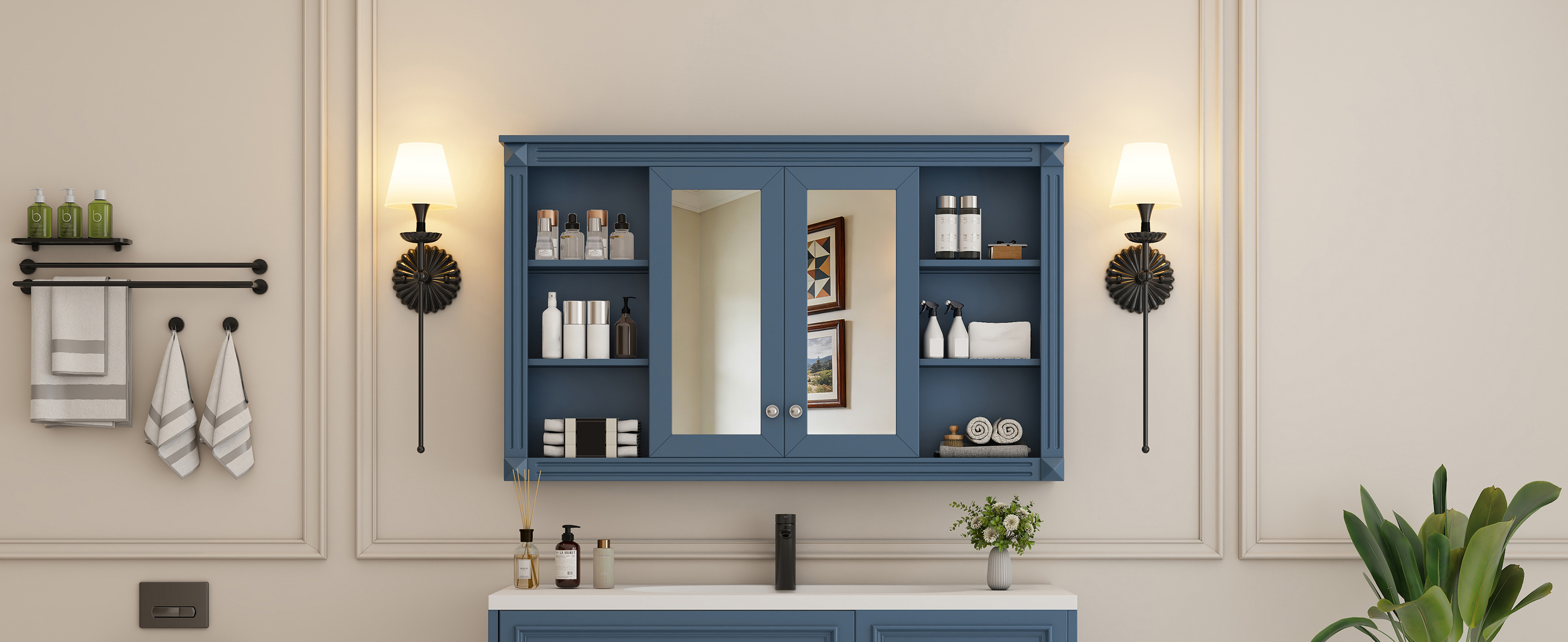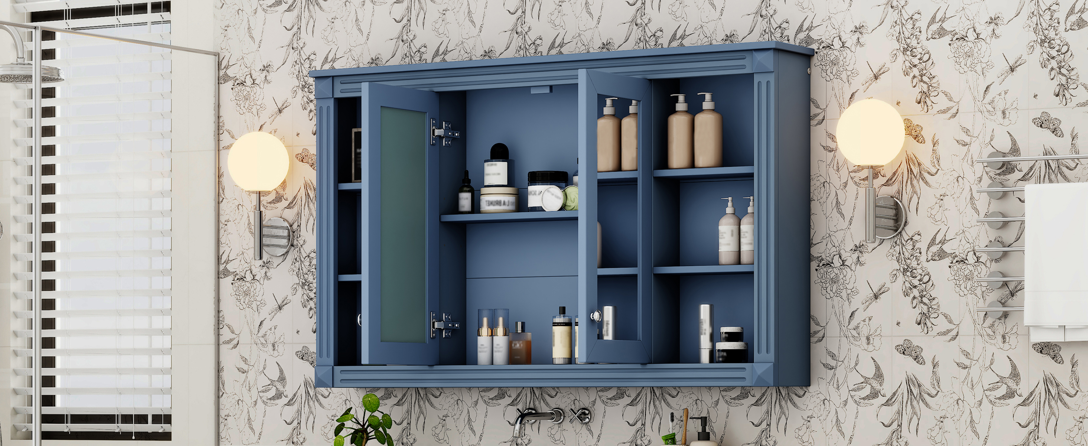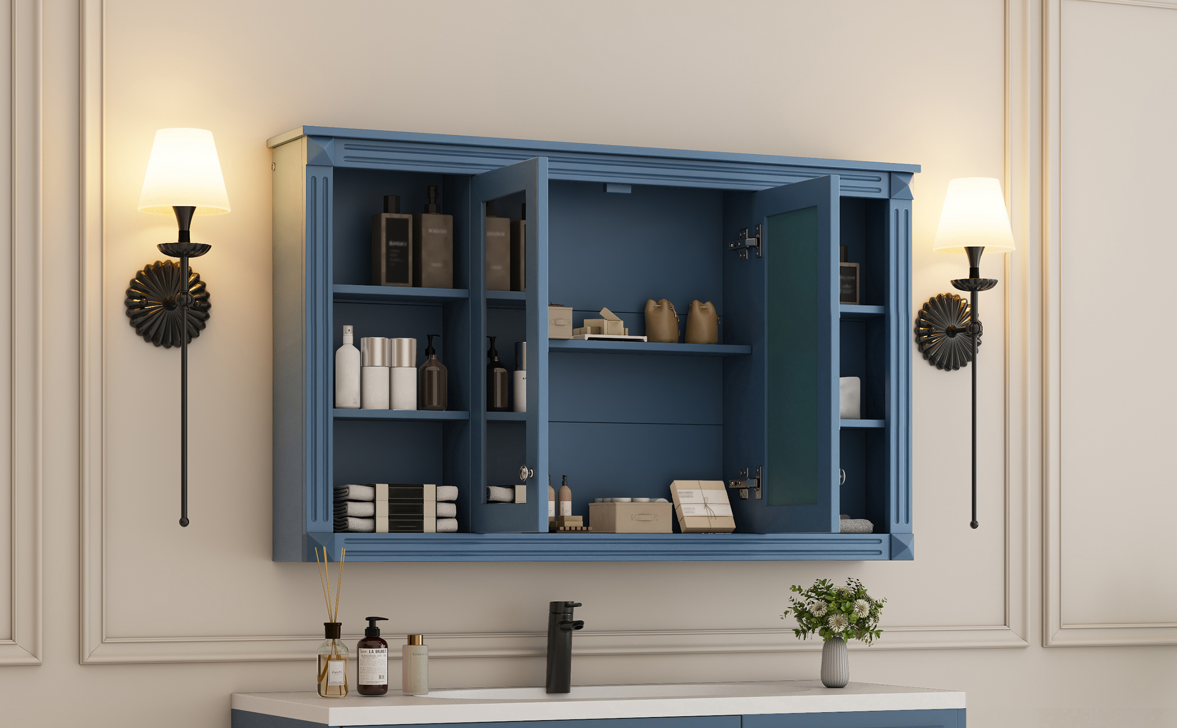 This elegant wall-mounted mirror cabinet masterfully combines intelligent storage with refined design, making it a versatile addition to any room. It features a spacious concealed compartment behind a crystal-clear mirror, complete with an adjustable shelf that offer three different height settings for complete customization. The design also incorporates accessible open shelving for frequently used items. Finished with delicate sculpted details and high-quality hardware, it provides a perfect blend of practicality, durability, and timeless style for your bathroom, bedroom, or living area.