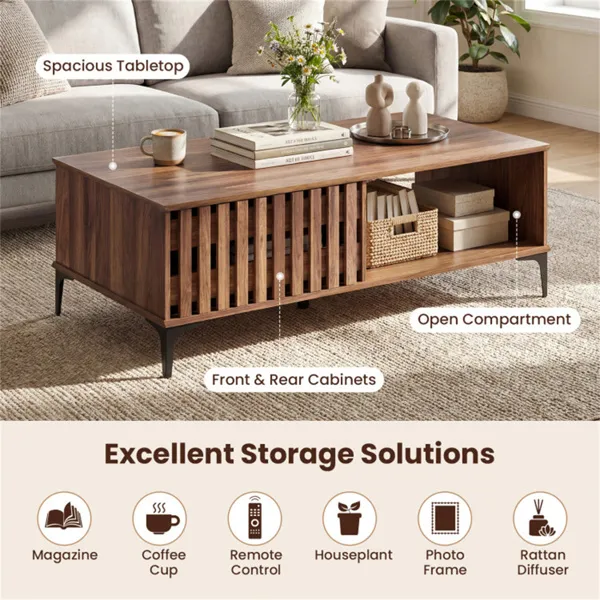 47 Inch Mid-Century Coffee Table With Storage Cabinets & Open Compartment, Walnut Wooden Look Accent Table With Heavy-Duty Metal Legs For Living Room