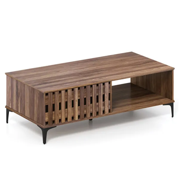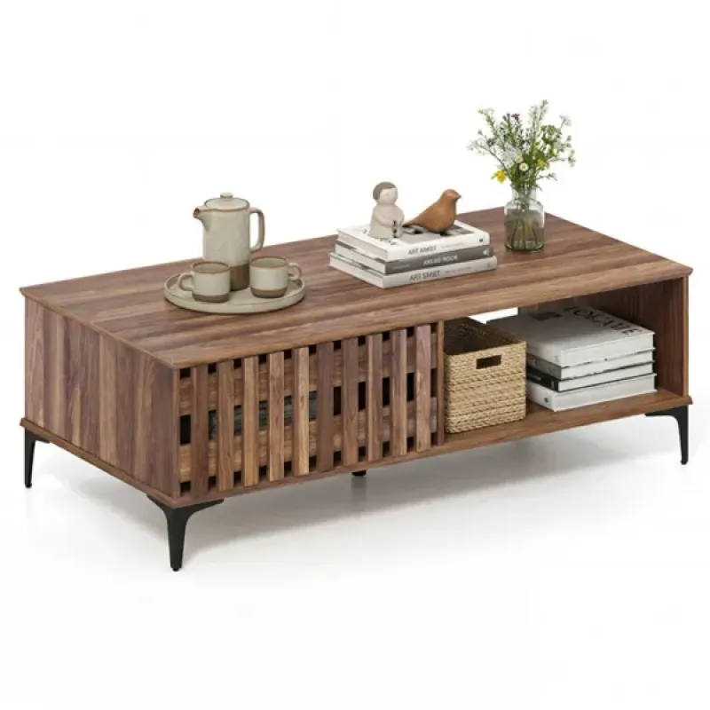 • Aesthetics & Utility Combined: This 47" mid-century coffee table not only elevates the room with its wood-like surface and natural aesthetic but also seamlessly blends functionality with style. The elevated and sturdy legs enhance the ease of cleaning underneath, thus simplifying home maintenance while offering a chic and airy look. • Excellent Storage Solutions: The farmhouse wooden center table includes an open compartment, perfect for storing magazines and photo frames, as well as front and rear cabinets for additional discreet storage. Each section is crafted to keep your living area both organized and stylish, making it easier to maintain a tidy living space. • Heavy-Duty Metal Construction: Equipped with 5 heavy-duty metal legs, this modern dining table provides excellent support for heavier items without sacrificing style. Meanwhile, the solid connections of the frame ensure long-lasting use, making it a worthwhile investment for your dining area or living room environments. • Exquisitely Made Details: From the premium metal hinges that facilitate door operations to the elegant fence doors that add a visual appeal, every part of the accent table is designed for convenience and enduring style. Plus, the inclusion of a door stopper minimizes the impact on the table and placed items, ensuring longevity. • Multi-Scenario Practicality: The vintage tea table offers multifunctional usability that extends beyond the living room, perfectly suitable for use in hallways, bedrooms and home offices. Whether it's used for coffee breaks, displaying decorations or extra storage, this modern table adapts to a variety of home settings and uses.