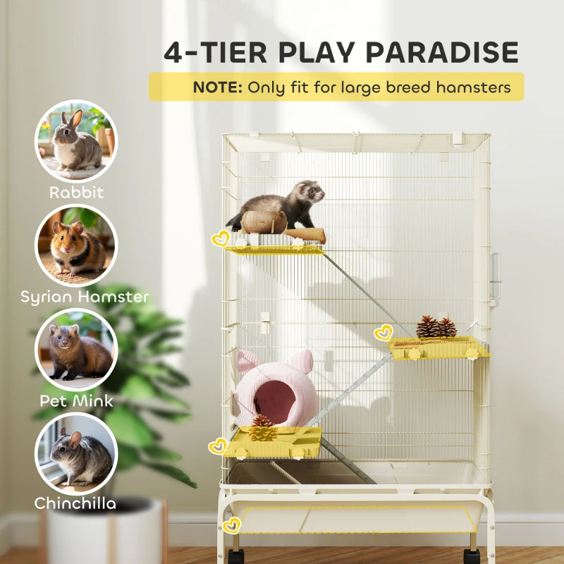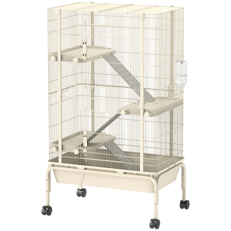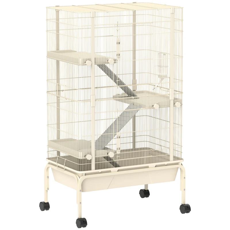 47inch Small Animal Cage, 4 Levels Large Rolling Metal Ferret Cage W 5.9Deep Tray, Ramps, Water Bottle, Food Dish, Beige