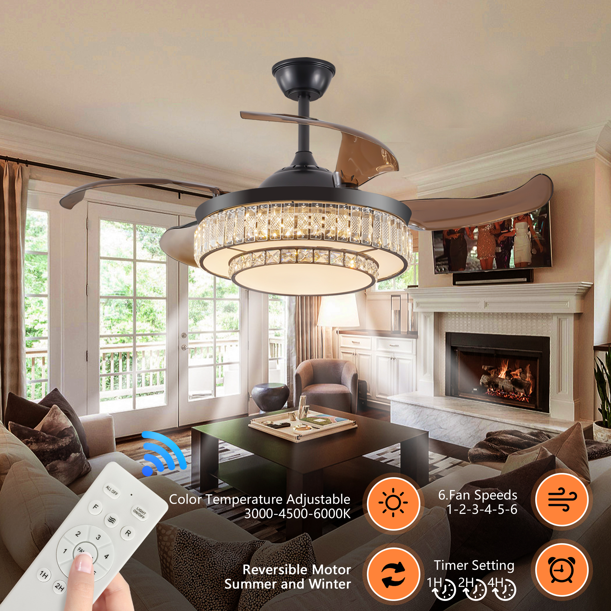 The retractable ceiling fan light uses a simple modern design, the fan blades automatically retracted when not in use, to maintain the overall beauty of the lamp, suitable for a variety of home and office places.The retractable ceiling fan has a good airflow to keep you cool and get rid of the summer heat. Retractable fan allow you to change the direction from downdraft mode during the summer to updraft mode during the winter. It will keep you to stay comfortable throughout the year.The retractable ceiling fan comes with 4 brown transparent blades which looks modern and metallic. Blades is automatically retracted or invisible when fan off. Our motor is made of thickened silicon steel sheet, thickened copper wire and precision double bearings, which not only has strong wind speed and quiet performance, but also long life. Beautiful, practical, and timeless classic appearance.The retractable ceiling fan offers six different speed options, allowing you to choose the ideal airflow intensity for your comfort needs. Additionally, modern ceiling fan operates with minimal noise, ensuring a peaceful and quiet environment. Whether you prefer a gentle breeze or a stronger airflow, flush mount ceiling fan provides versatile speed settings while keeping noise disturbance to a minimum.