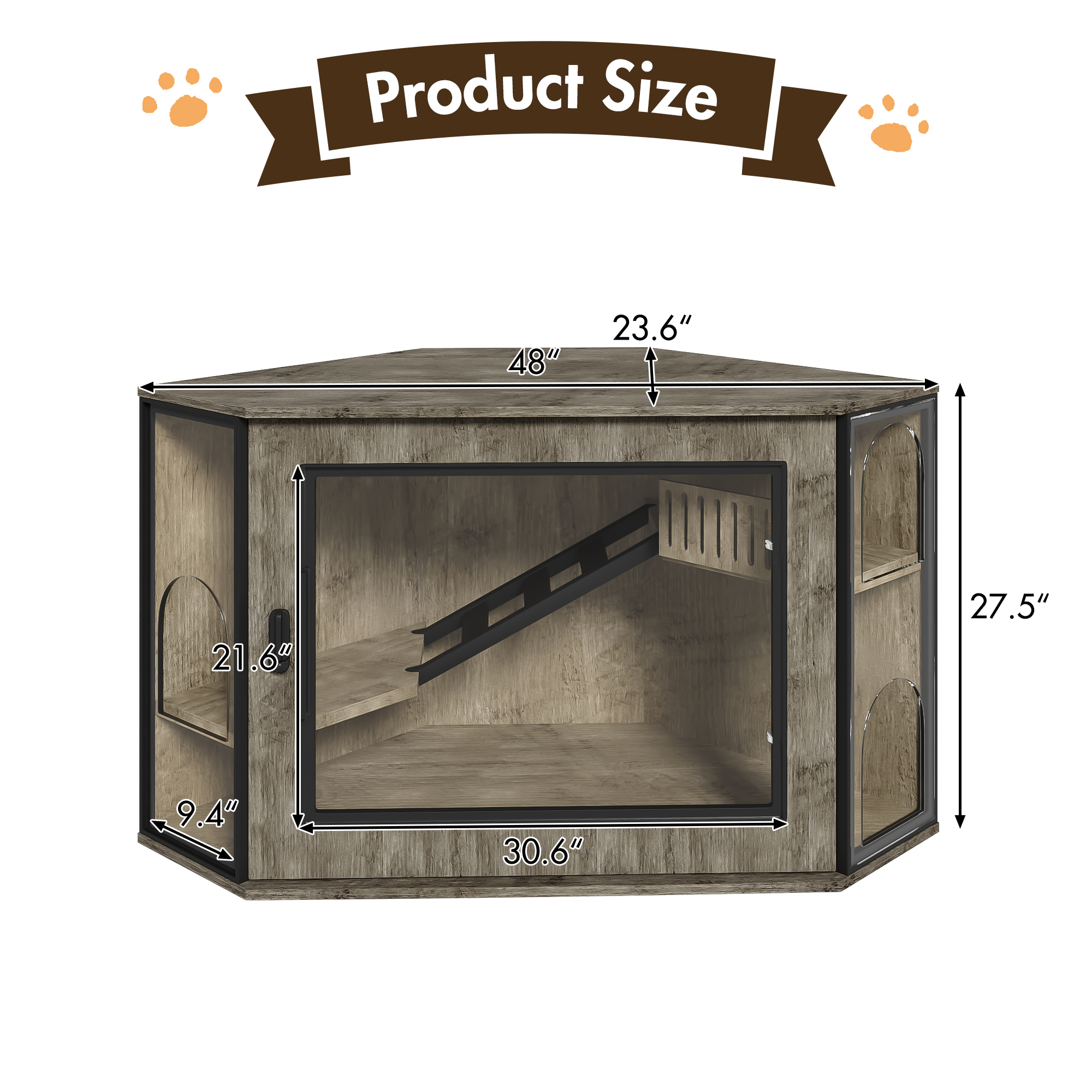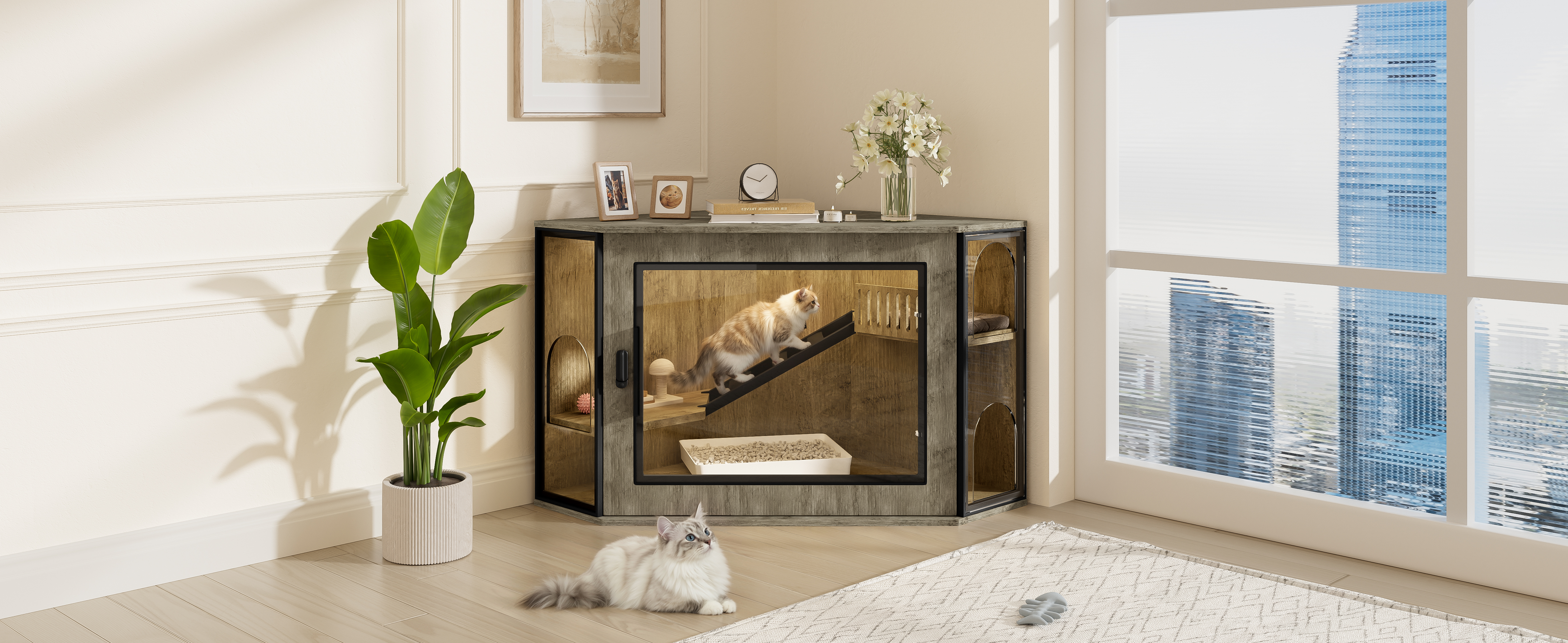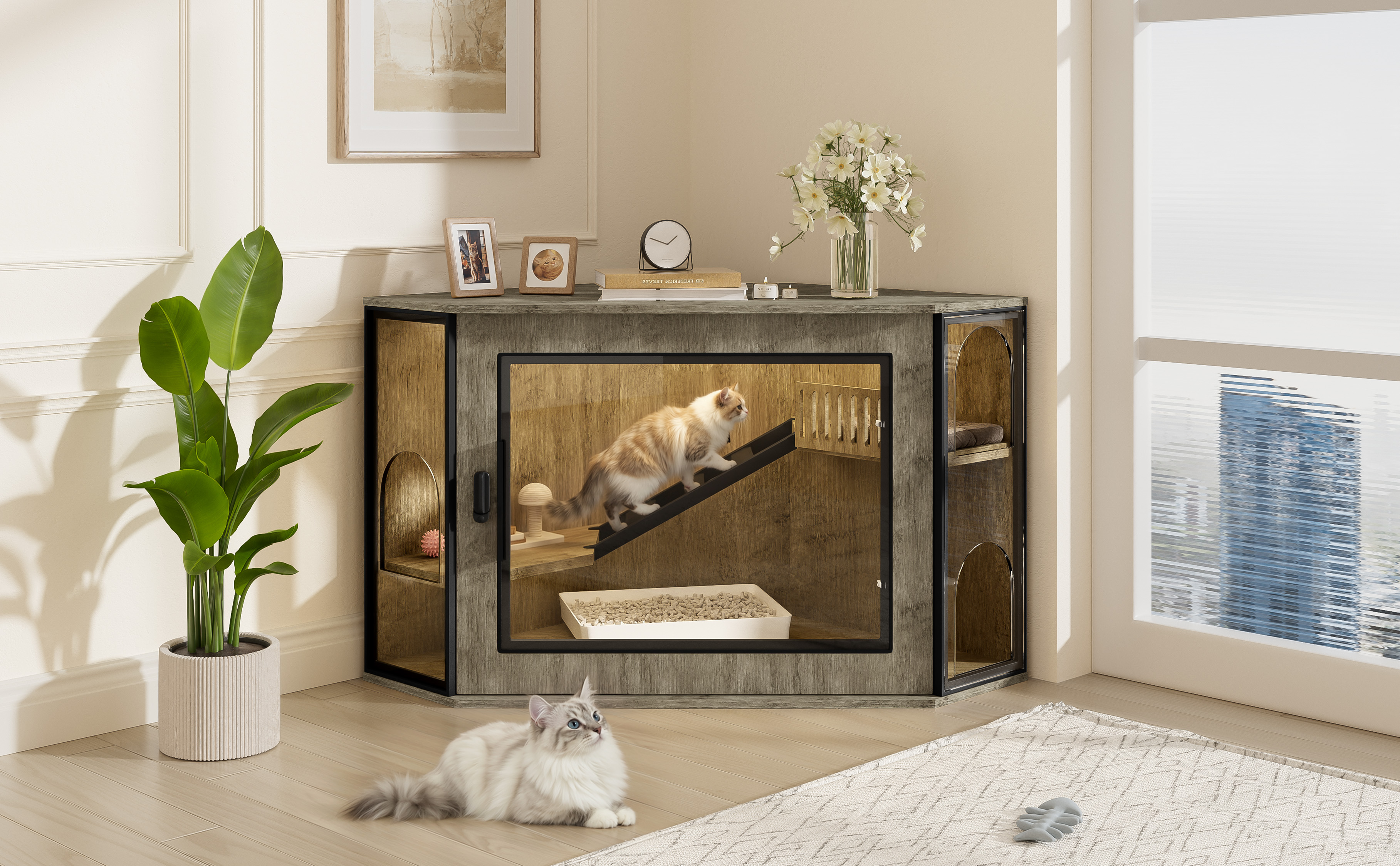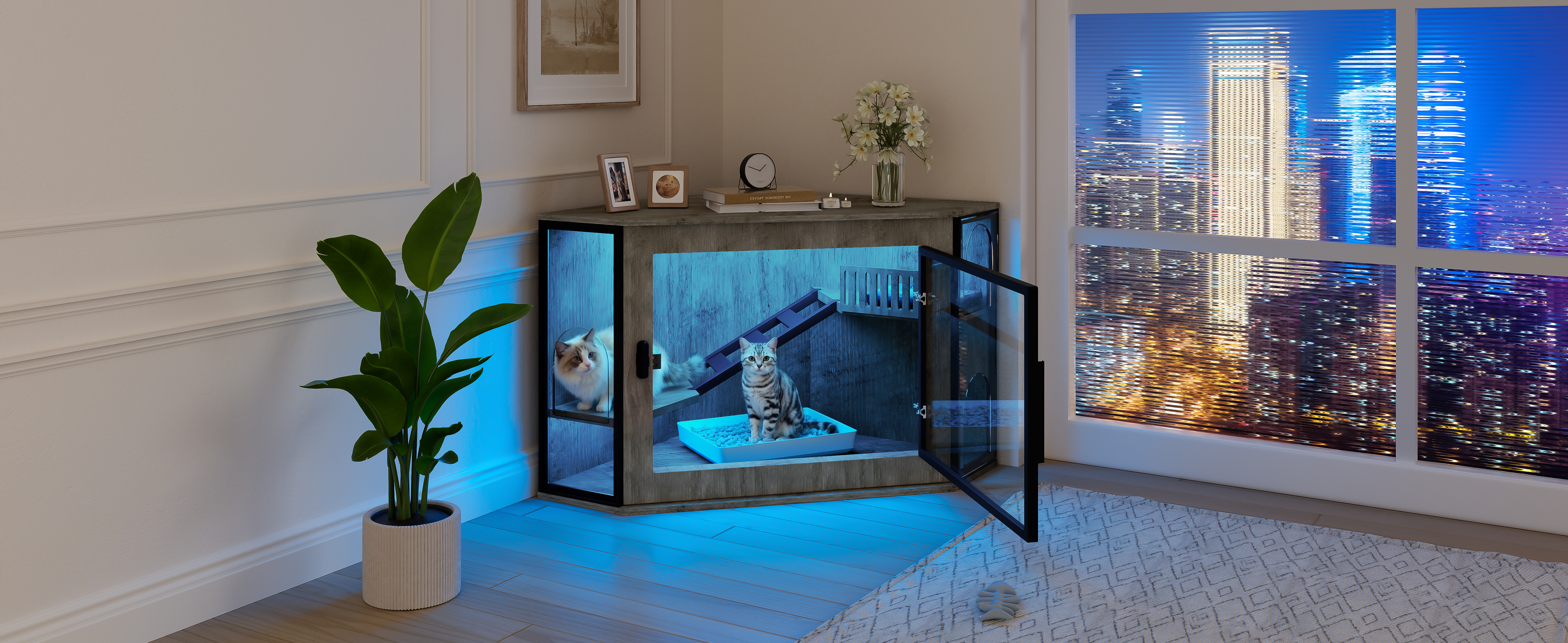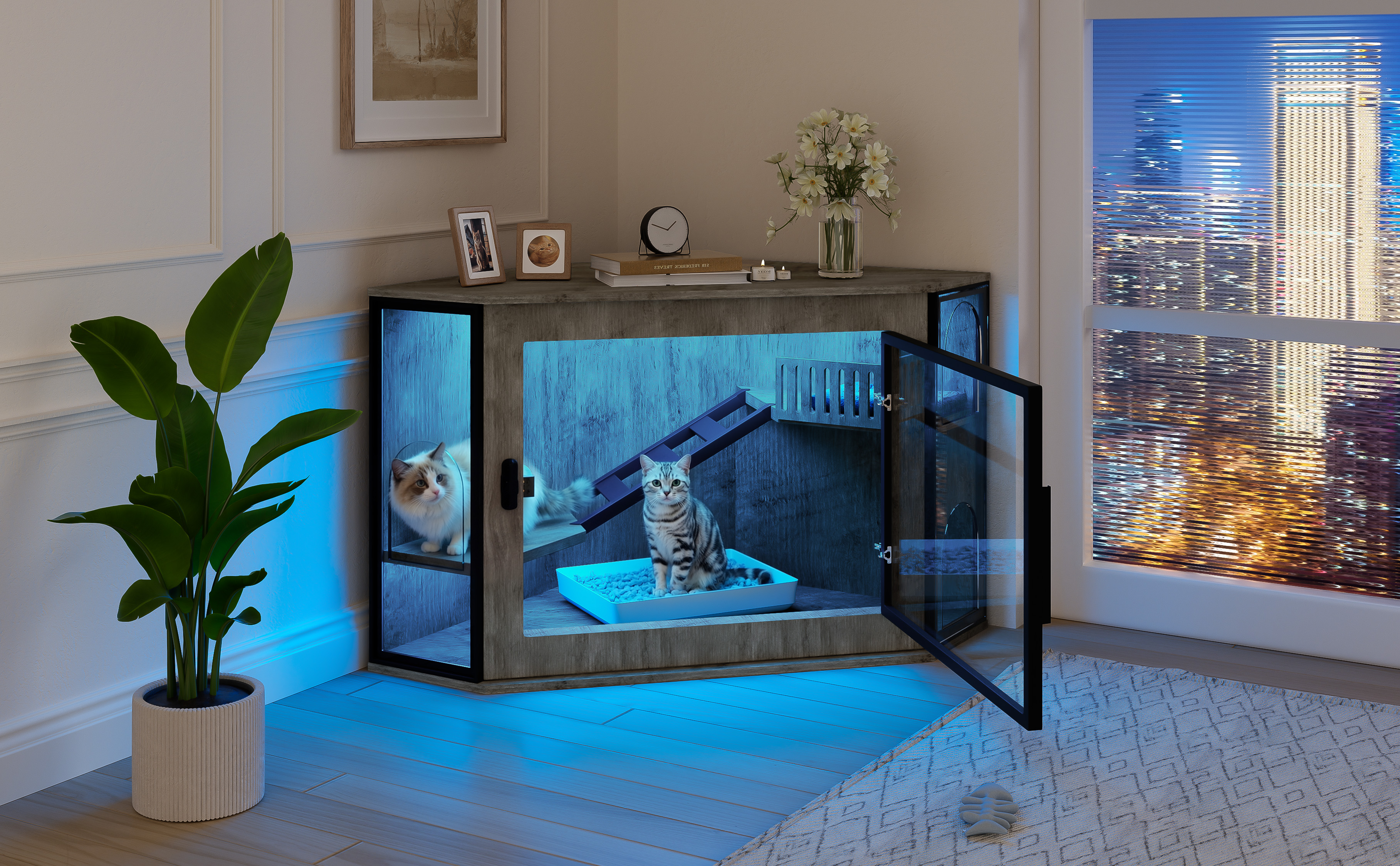 Product Name:48" Corner Cat Litter Box Enclosure, Modern Hidden Litter Box Corner Cabinet with Acrylic Door and LED Light, Cat House with Playground and Stairs, Grey