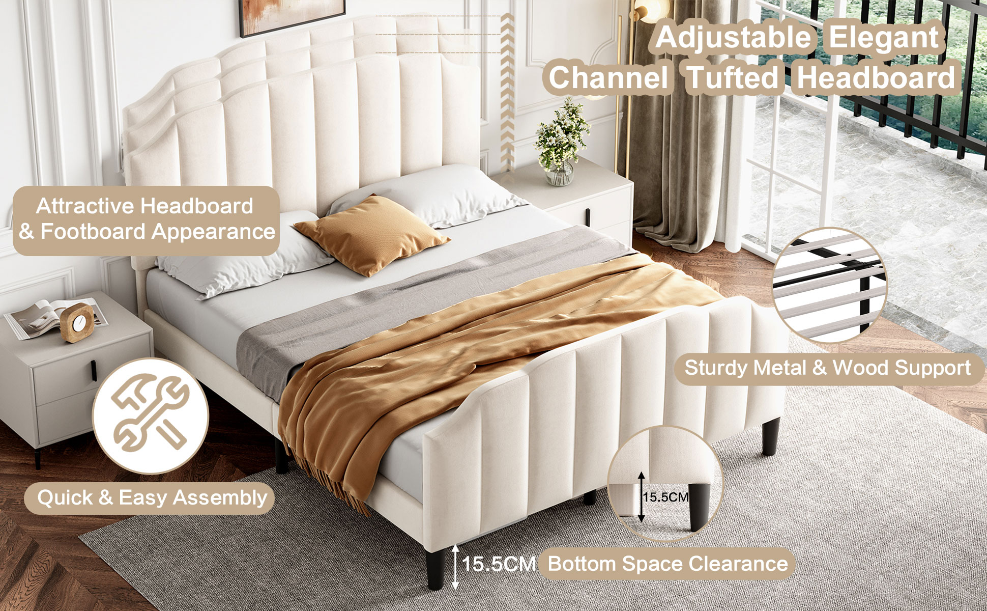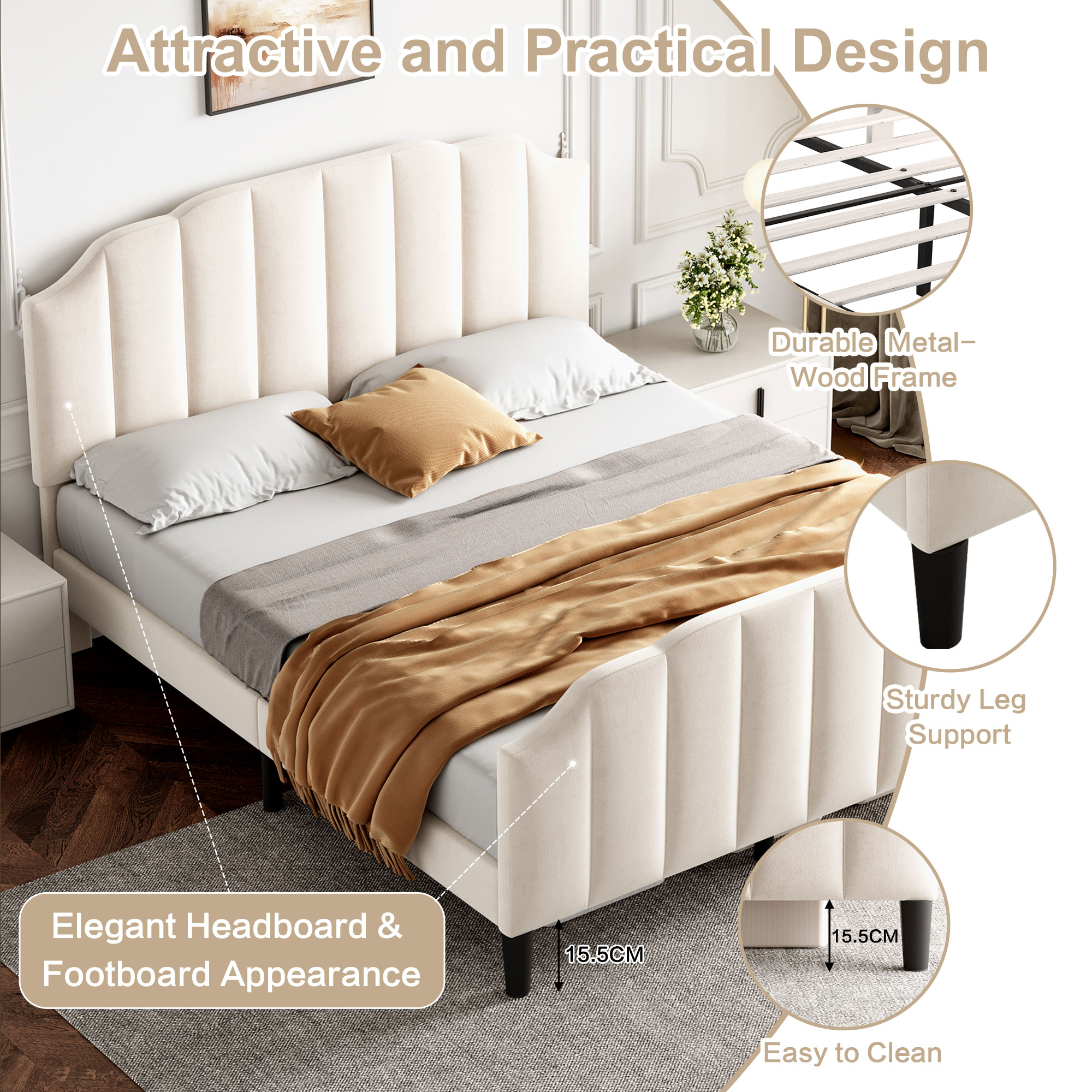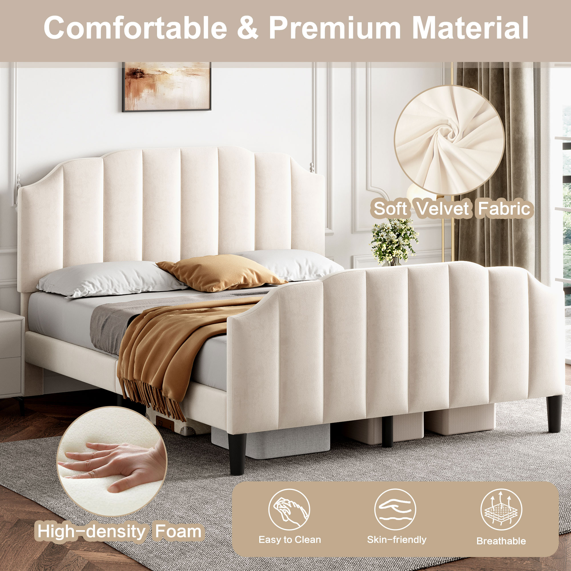 Product Name:4ft6 Double Upholstered Bed Frame with Adjustable Chic Channel-Tufted Headboard, Velvet Platform Bed Frame with Solid Wood Slat and Mute Foam, No Box Spring Needed, Easy Assembly, Beige (No Mattress)