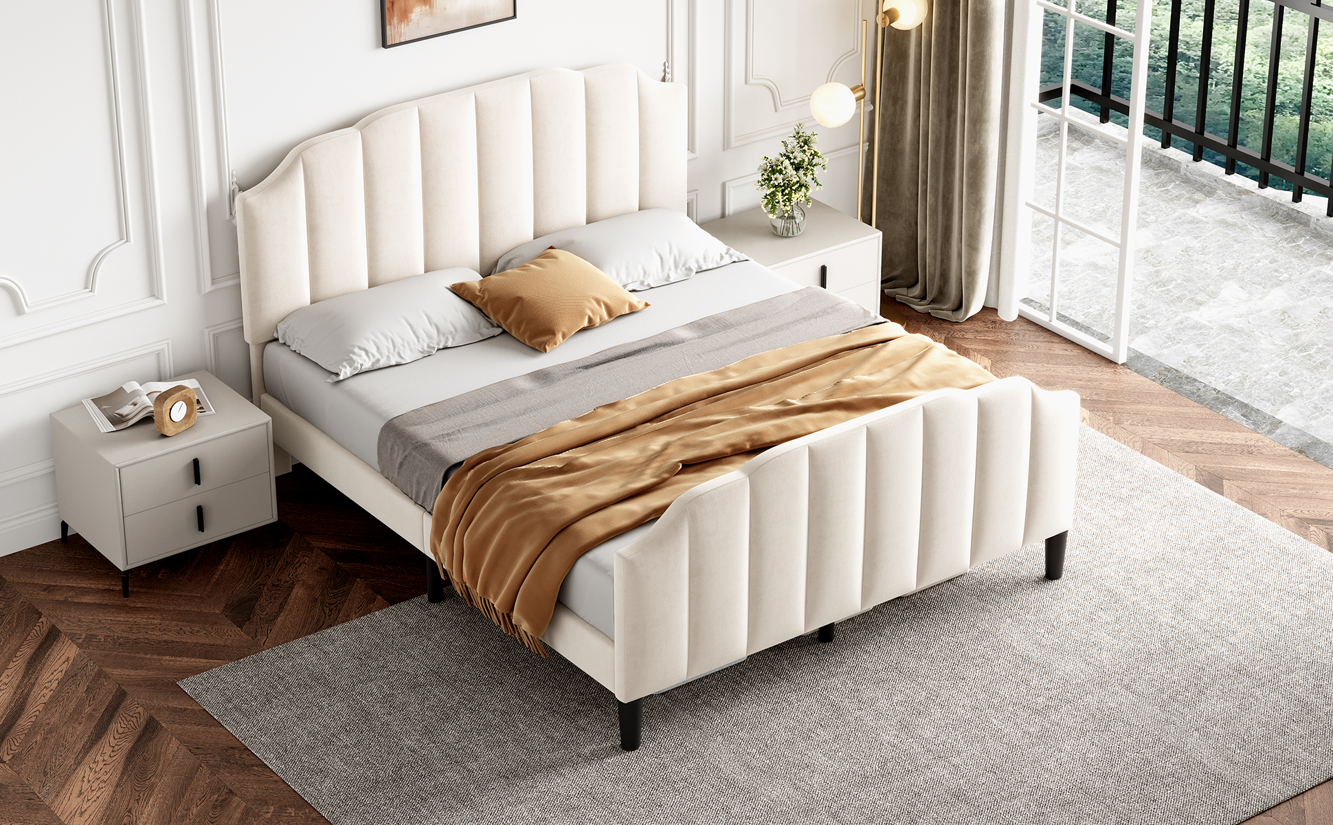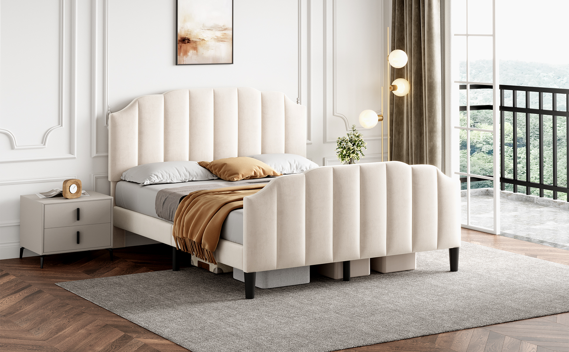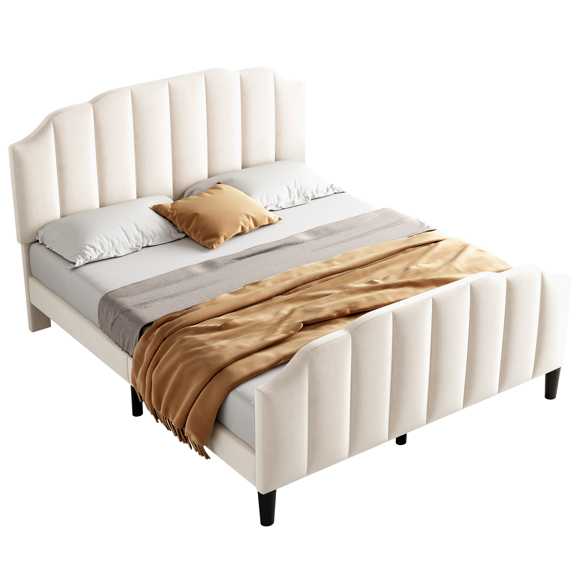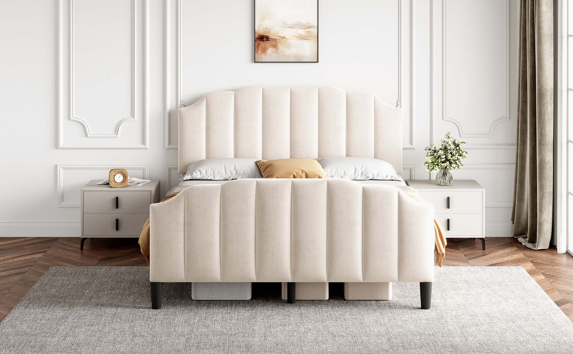 Product Name:4ft6 Double Upholstered Bed Frame with Adjustable Chic Channel-Tufted Headboard, Velvet Platform Bed Frame with Solid Wood Slat and Mute Foam, No Box Spring Needed, Easy Assembly, Beige (No Mattress)