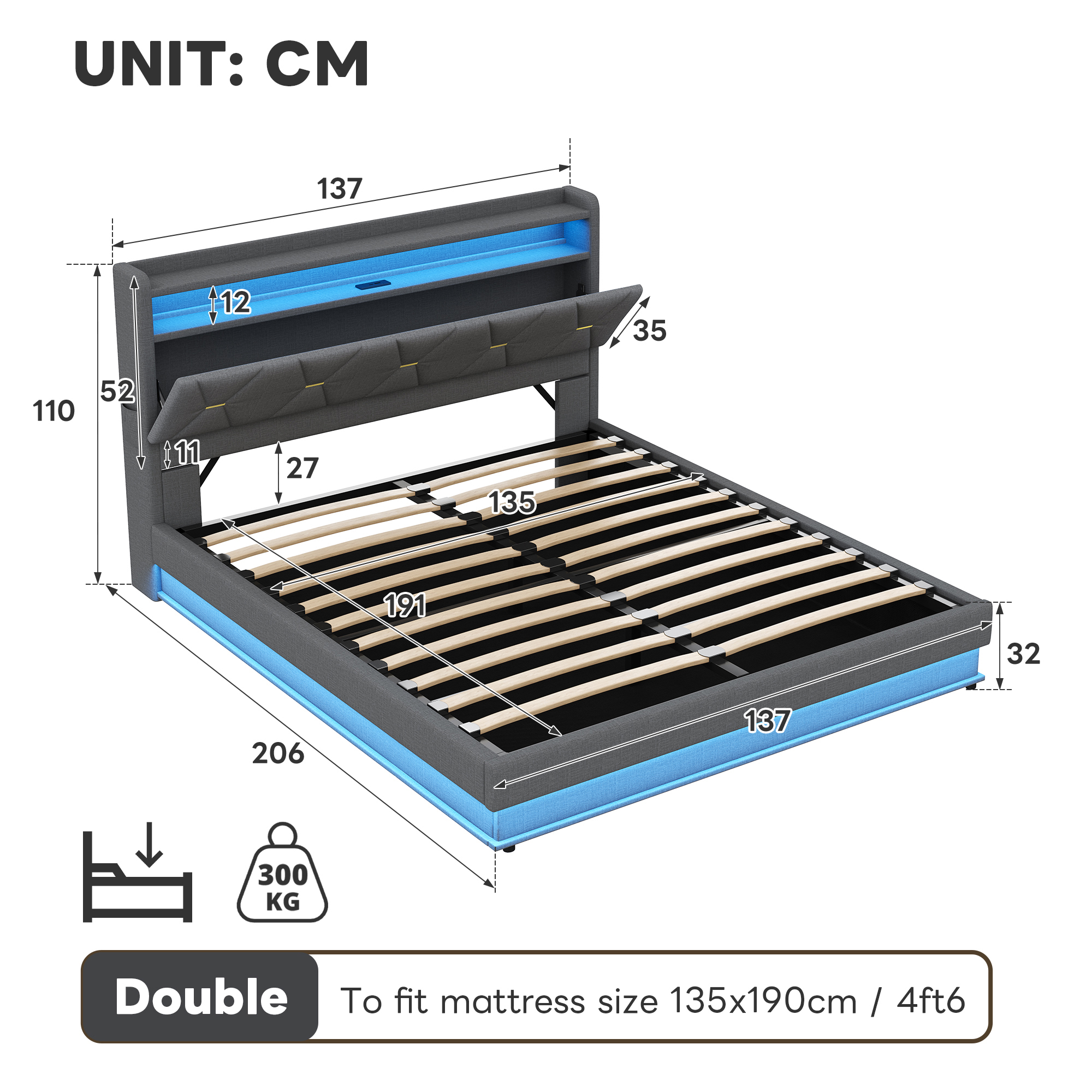 Product Name:4ft6 Double Upholstered Bed Frame with Hydraulic Storage, LED Headboard with Charging Station and Concealed Headboard Storage, USB and Type - C Ports, Linen, No Box Spring Needed, Grey (No Mattress)