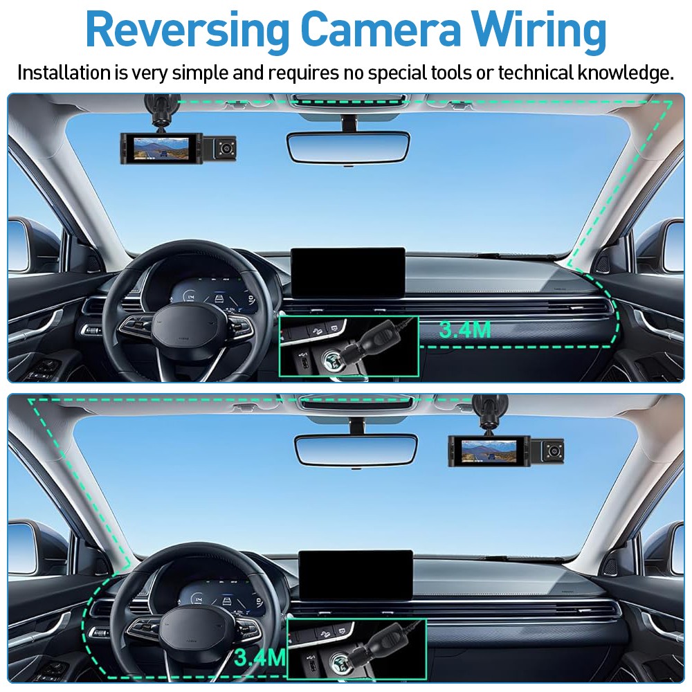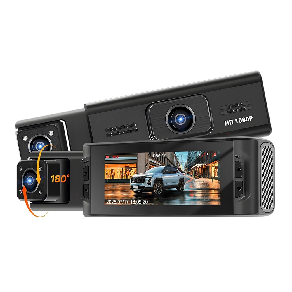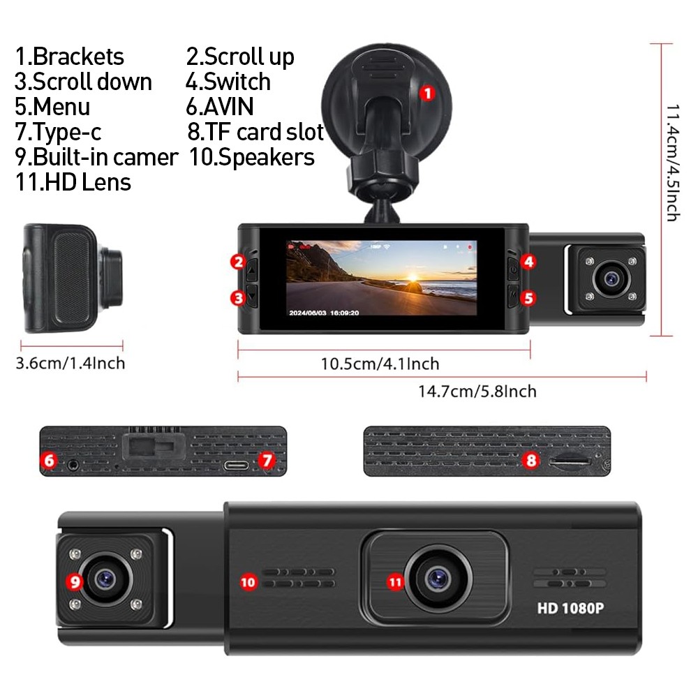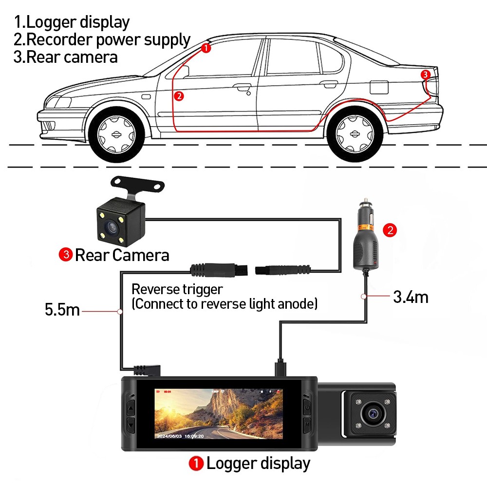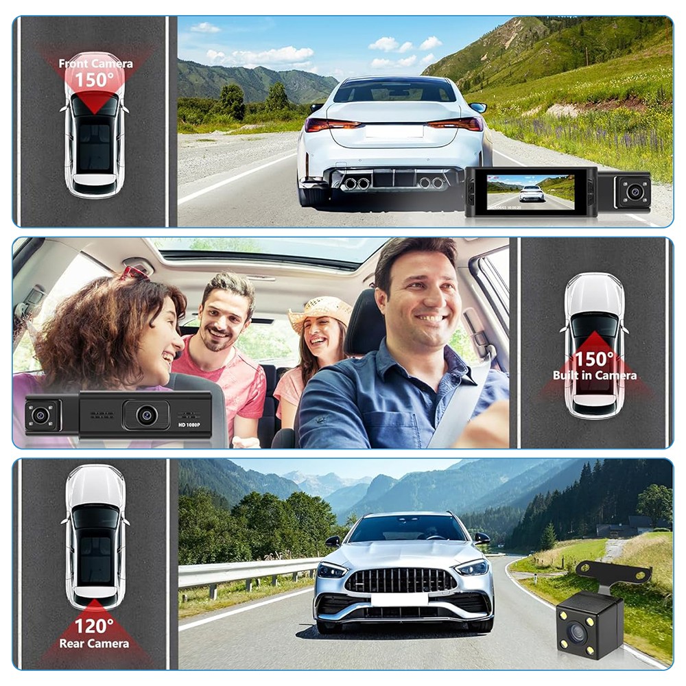 1.Triple Camera Recording. Equipped with three cameras, recording the driving process in all directions, which can easily help you get effective information and provide relevant evidence to protect your car in case of emergency.
