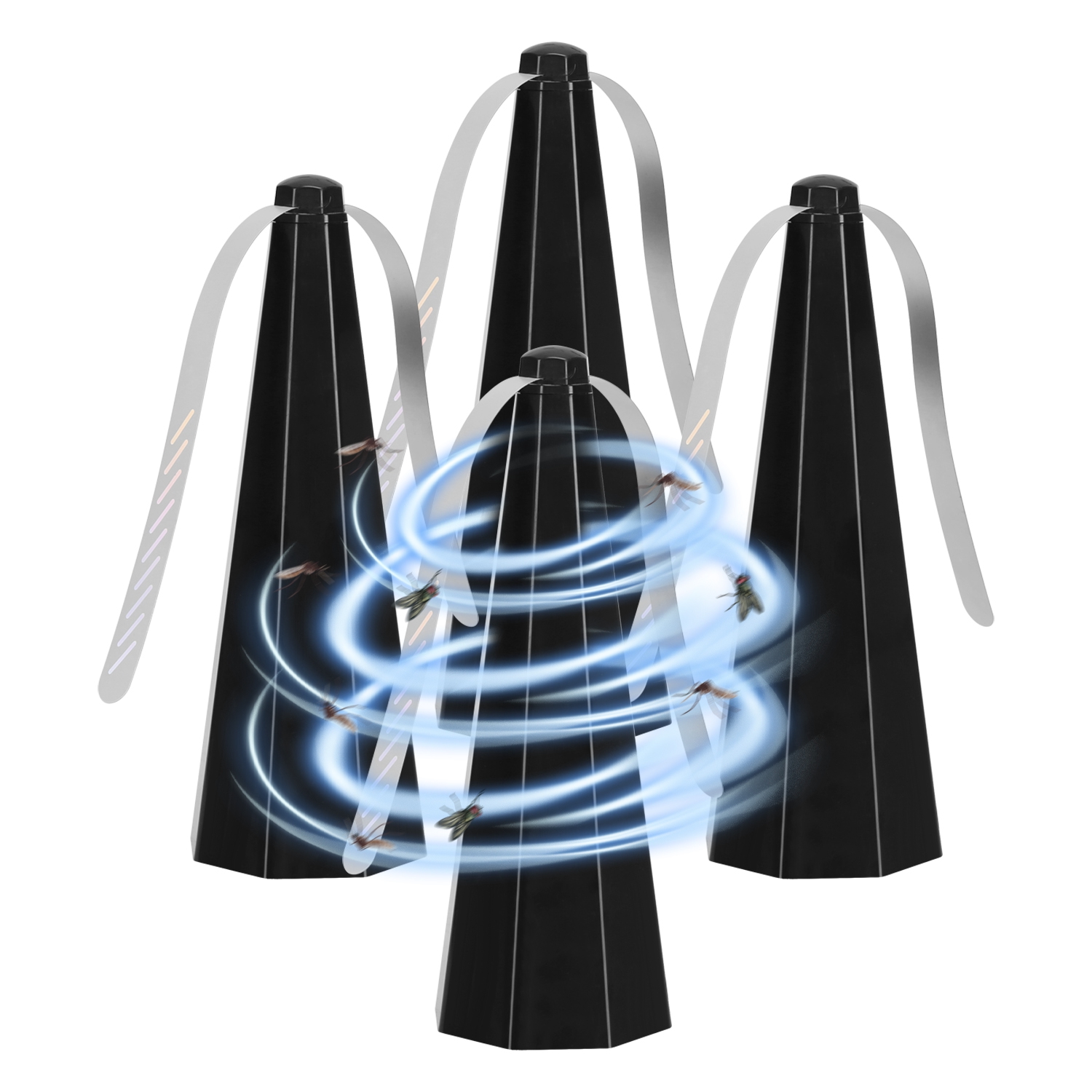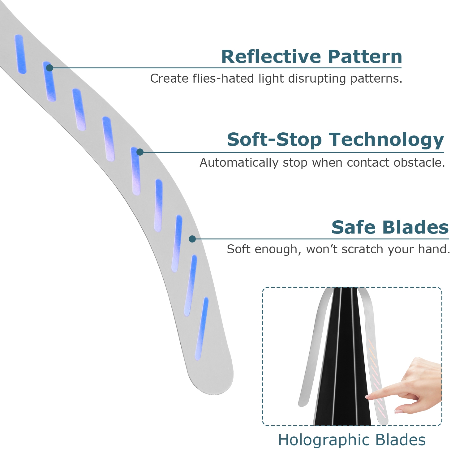 *Holographic & Reflective*:Flies are sensitive to light and sudden changes in their visual environment. The holographic blades with reflective patterns are more noticeable to flies from a distance. Serve as a strong visual deterrent and prevent flies from getting close.