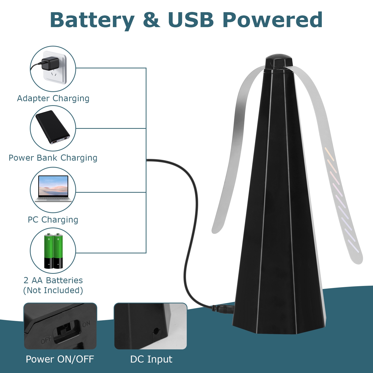 *Dual Power Supply Methods*:Our fly table fan can be powered not only by 2 AA batteries(Not Included),but also by DC USB cable. You can charge it with any device with a USB port,such as a power bank,PC,adapter etc..