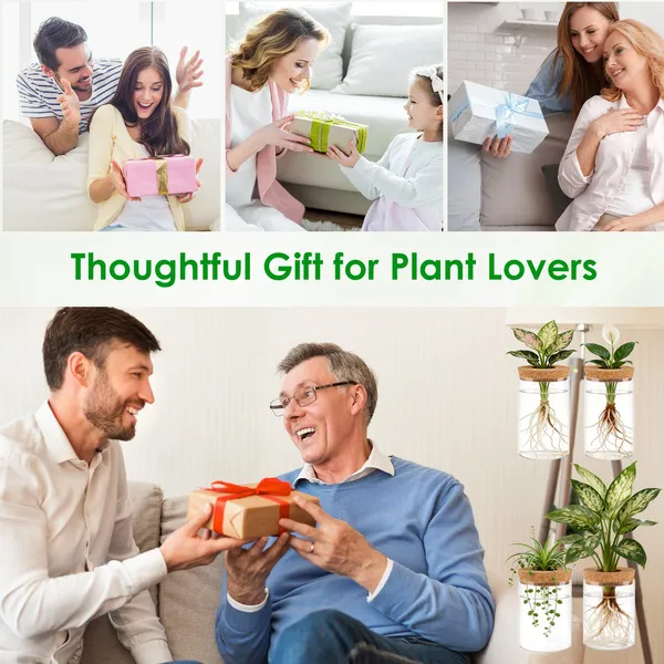 *High Borosilicate Glass Material*:Made from high borosilicate glass with wood cork lids,These glass propagation stations for plants offers excellent heat and cold resistance for long-lasting,year-round use. *Clear Root Growth Visibility*:Crystal-clear glass design allows easy monitoring of root development,helping you track plant health and propagation progress at a glance. *Ideal for Hydroponic Propagation*:Perfect for water-grown plants,cuttings,and flower arrangements—supports healthy rooting for pothos,philodendrons,herbs,and more. *Minimalist Home Decor Accent*:Clean,modern design complements any interior style and works beautifully as a tabletop planter,flower vase,or standalone decorative piece. Perfect for homes,offices,kitchens,restaurants,cafes,or even as a unique holiday decoration. *Thoughtful Gift for Plant Lovers*:This propagation glass vases set is a stylish and practical gift choice for Valentine’s Day,Mother’s Day,Father’s Day,birthdays,housewarmings,and other special occasions.