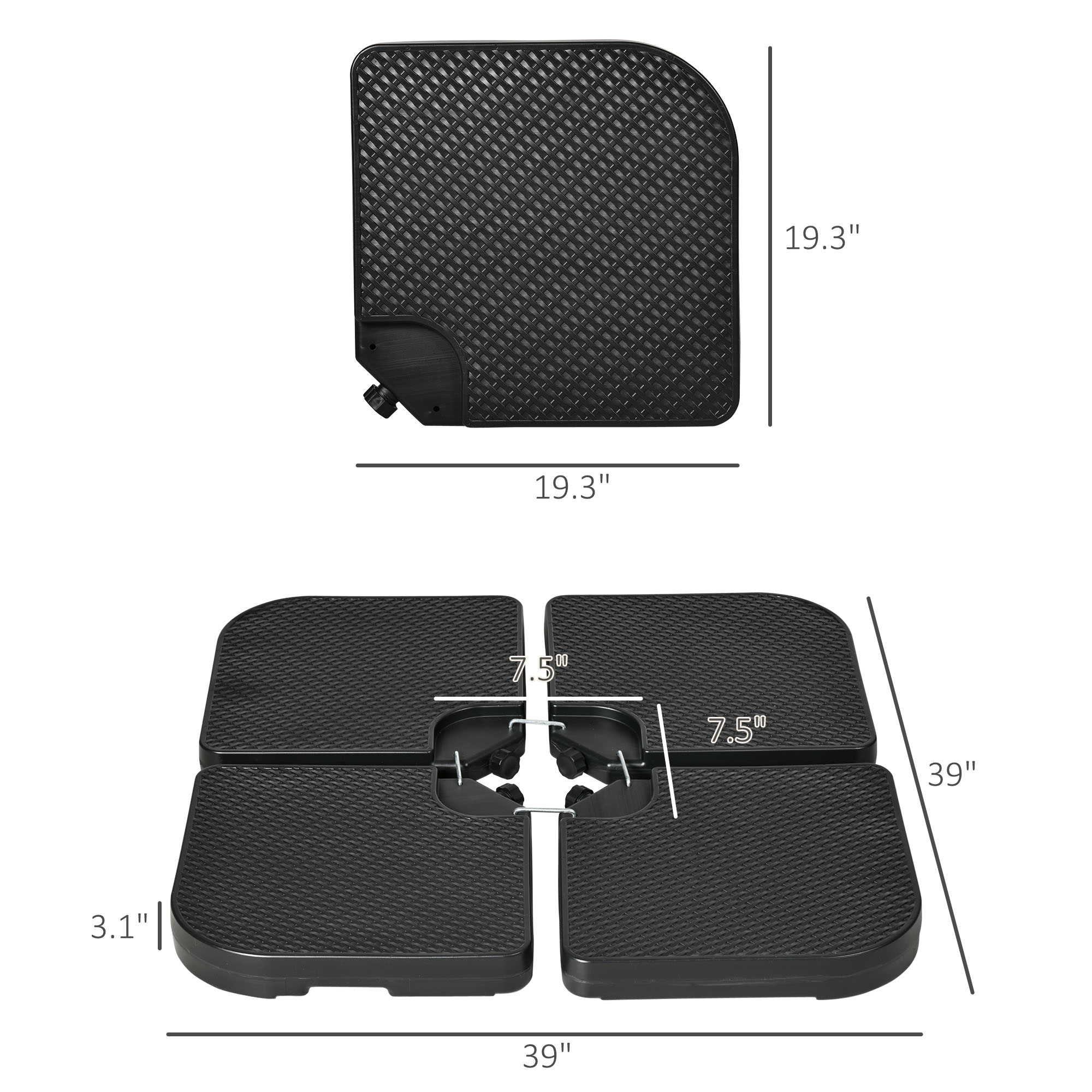 - Wicker-like Umbrella Weight Info: Overall Dimensions: 39.25" L x 39.25" W x 3.25" H. Single plate: 19.75" L x 19.75" W x 3.25" H. Please measure in advance to ensure our weight can fit well. Suitable [BRAND NAME] Offset Parasol Models (SKUs: X-84D-187, X-84D-161), please consult customer service for help identifying the following product lines.