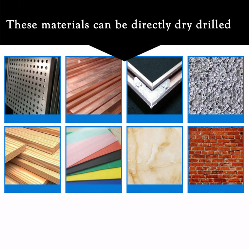 These materials can be directly dry drilled: iron/copper/aluminum alloy/wood/plastic/red brick, etc.