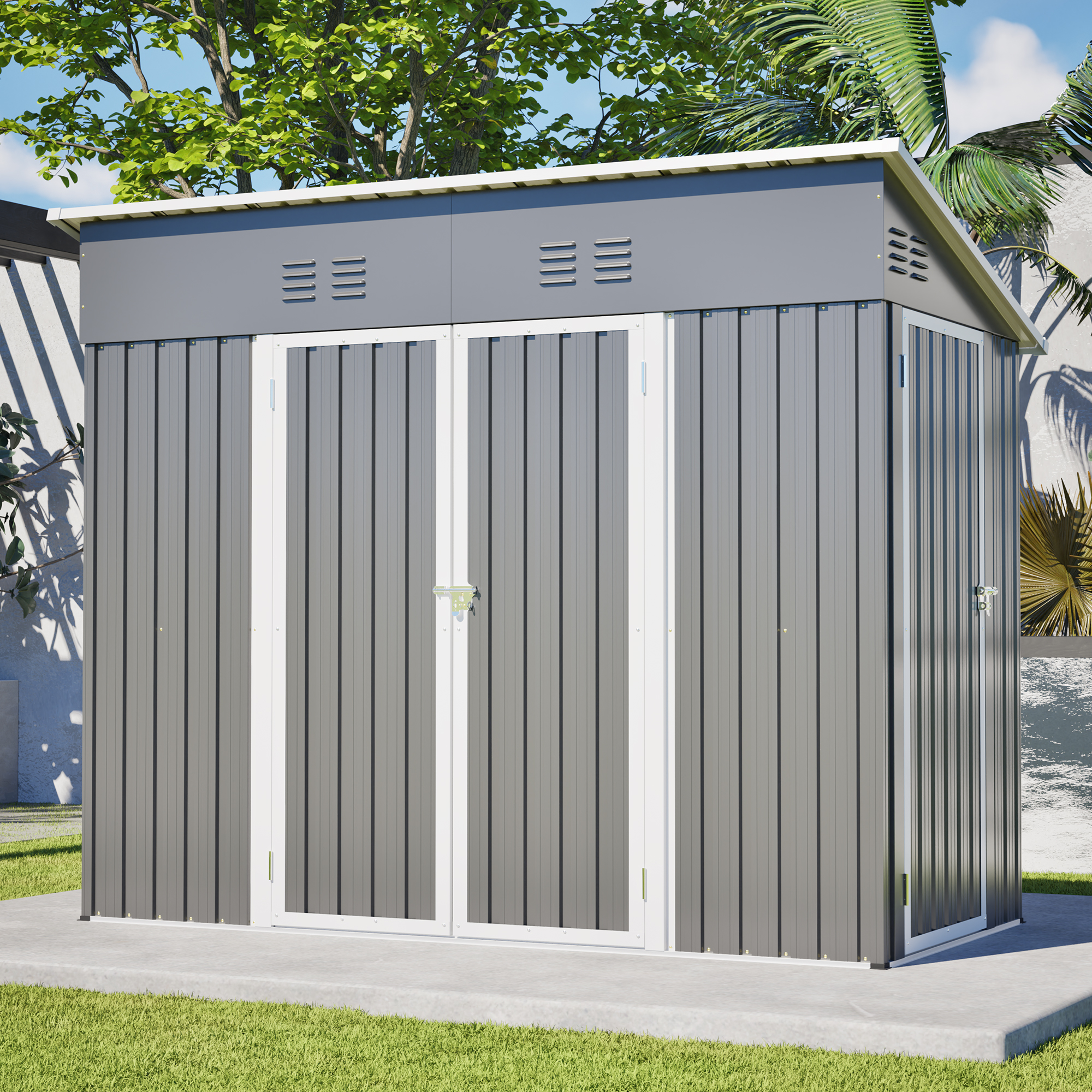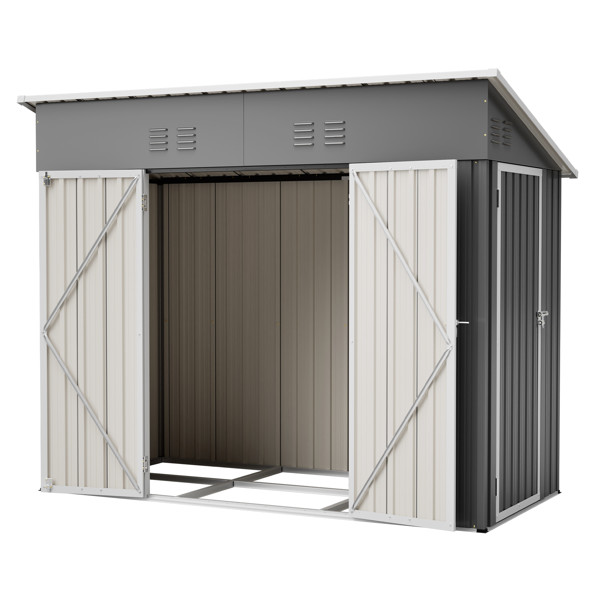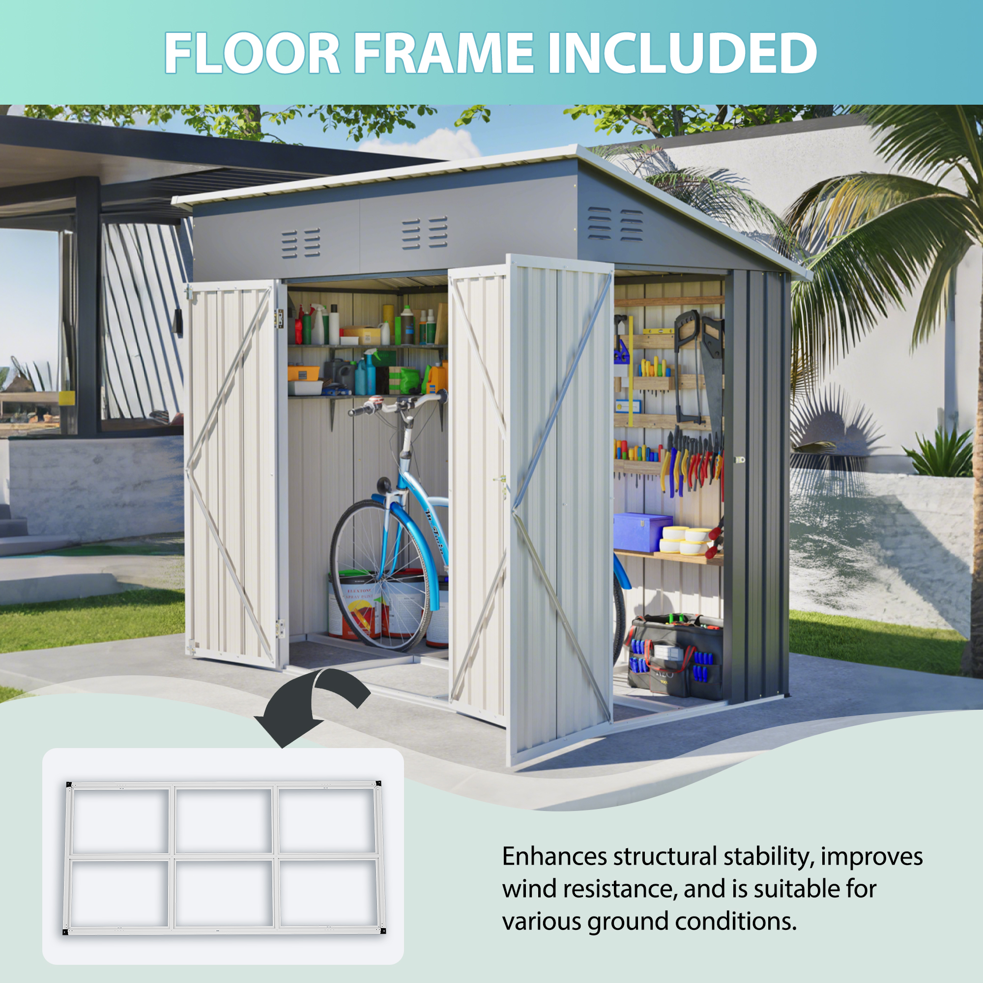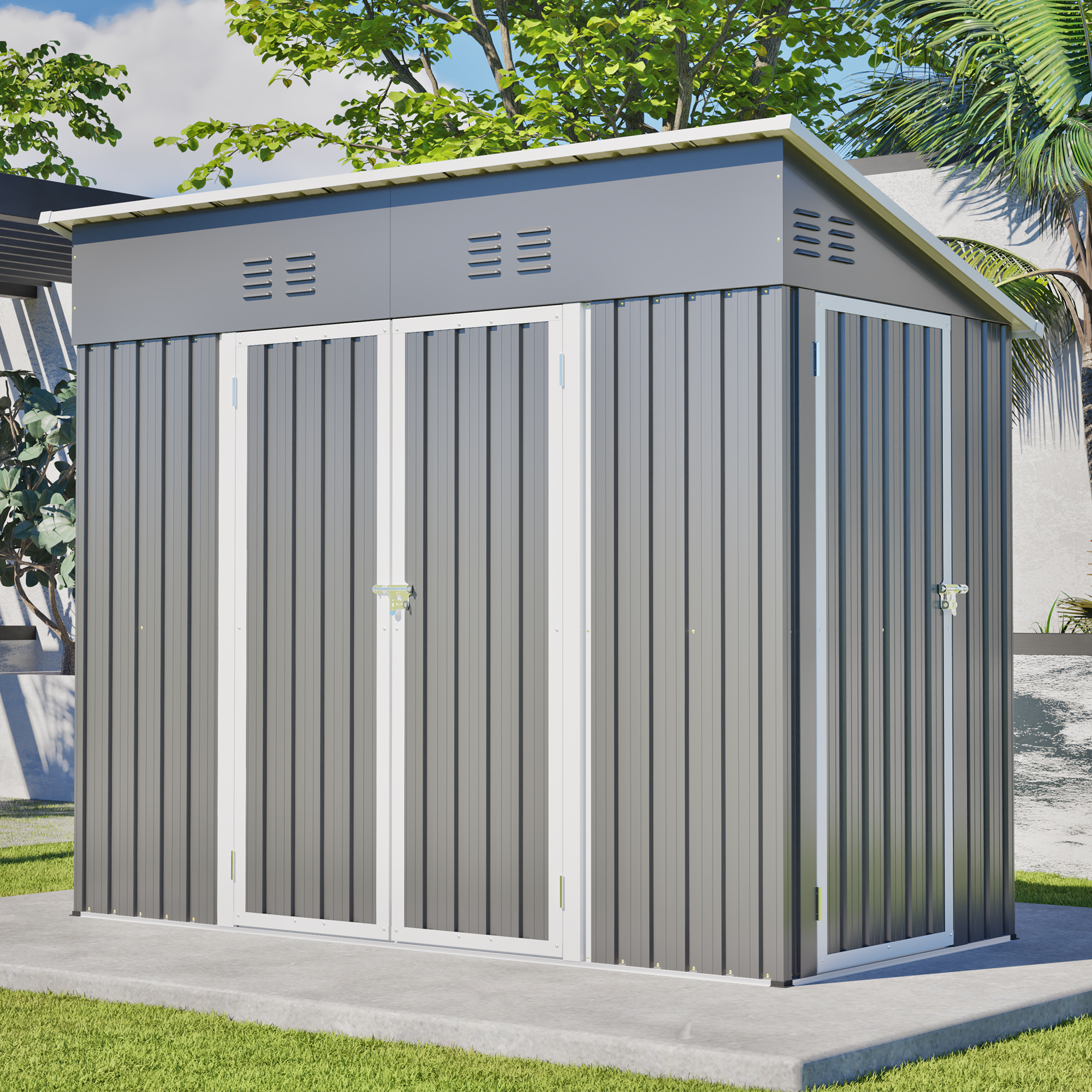 • 【Core Features Overview】This 4x8 ft slope-roof reinforced outdoor storage shed features a heavy-duty metal frame and a water-shedding sloped roof design. It includes 4 air vents for continuous airflow, supports left/right door hinge installation, and comes with an integrated foundation frame for stable and easy setup. Ideal for tool storage, garden organization, pet shelter, and more.