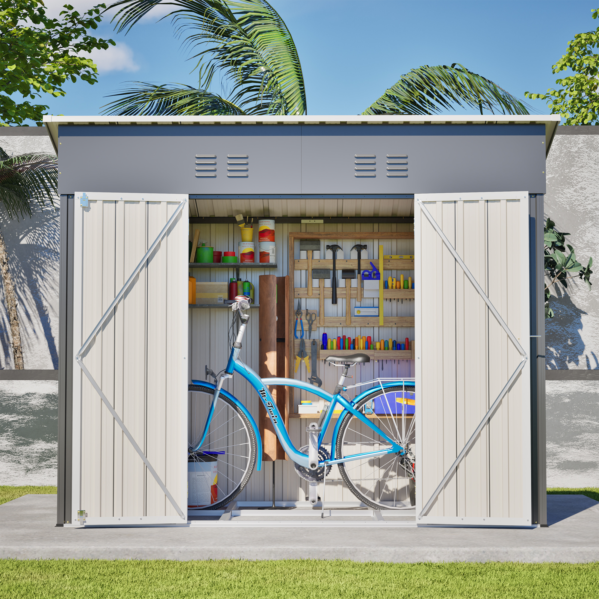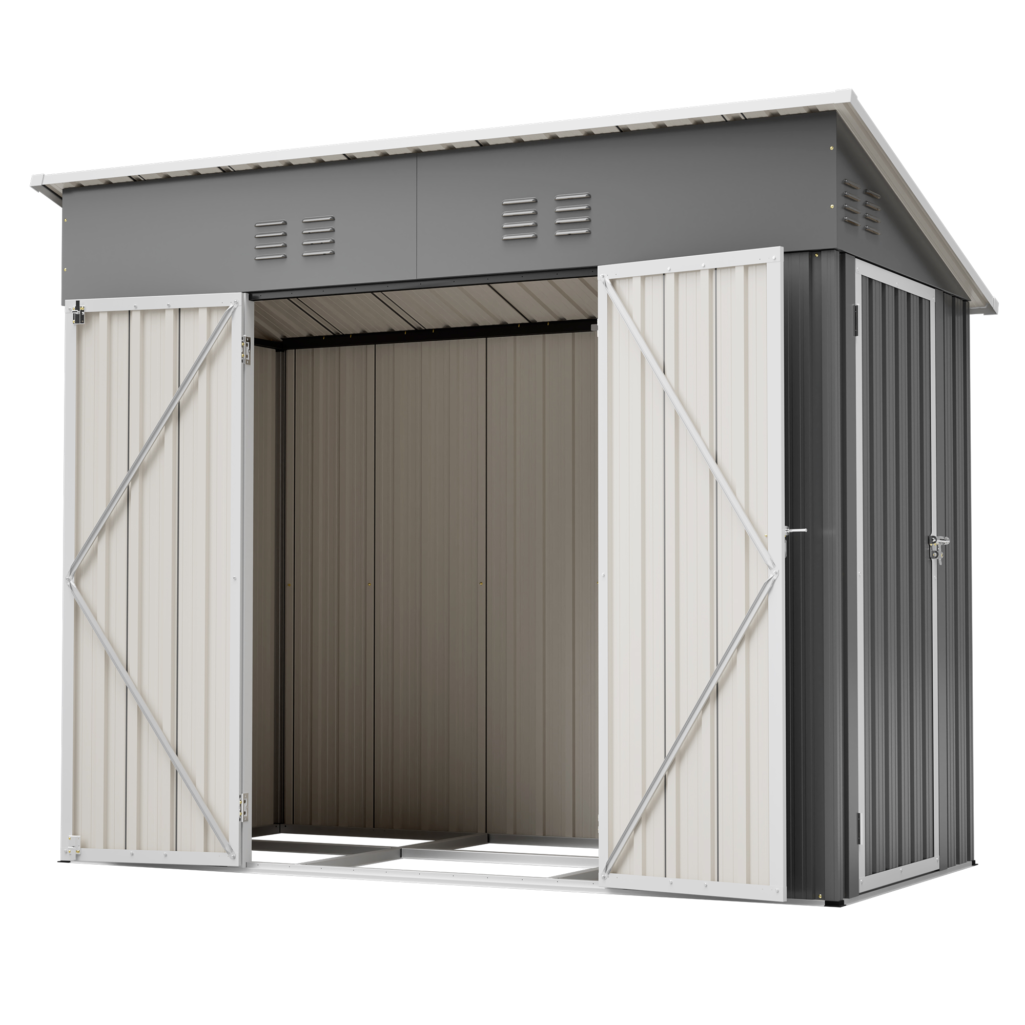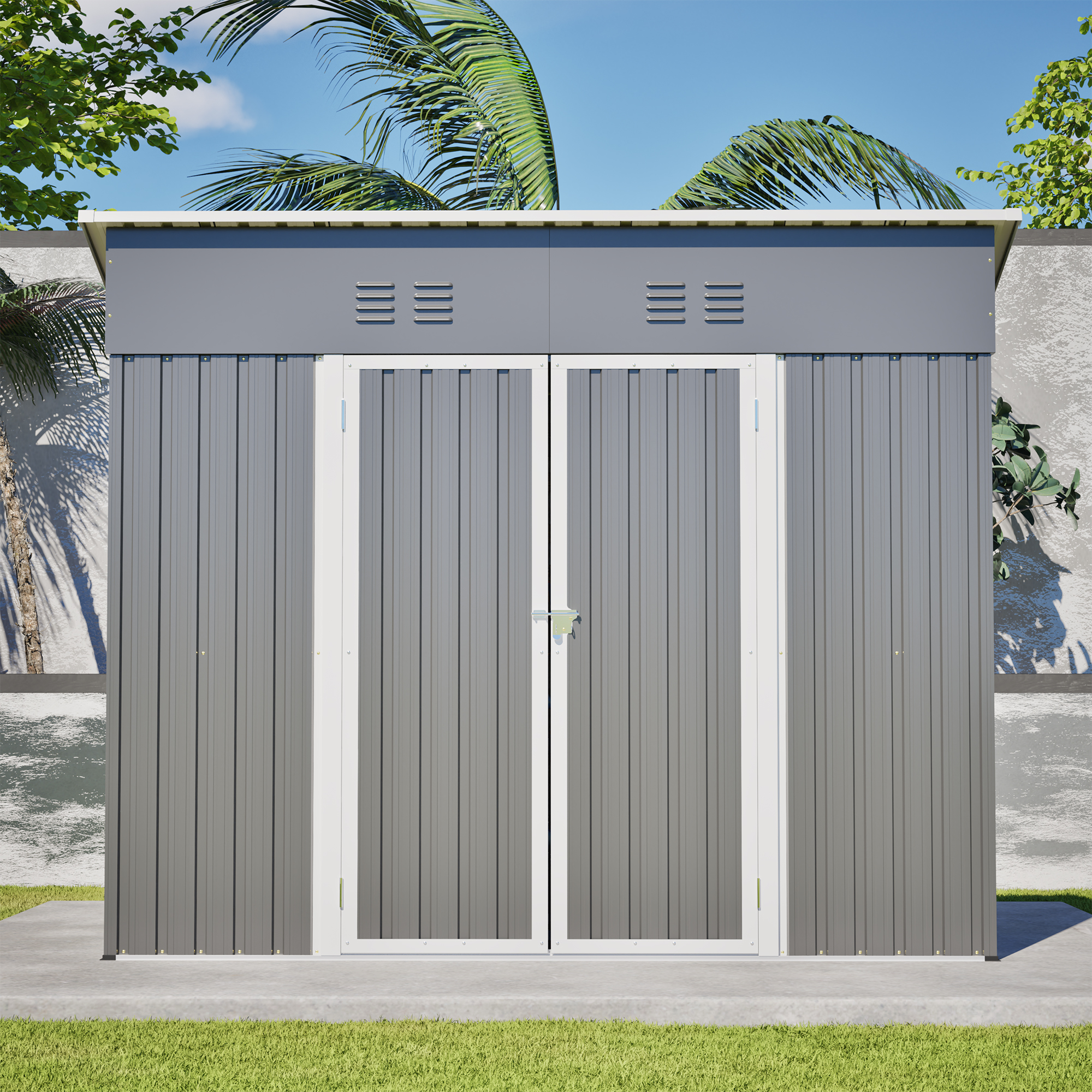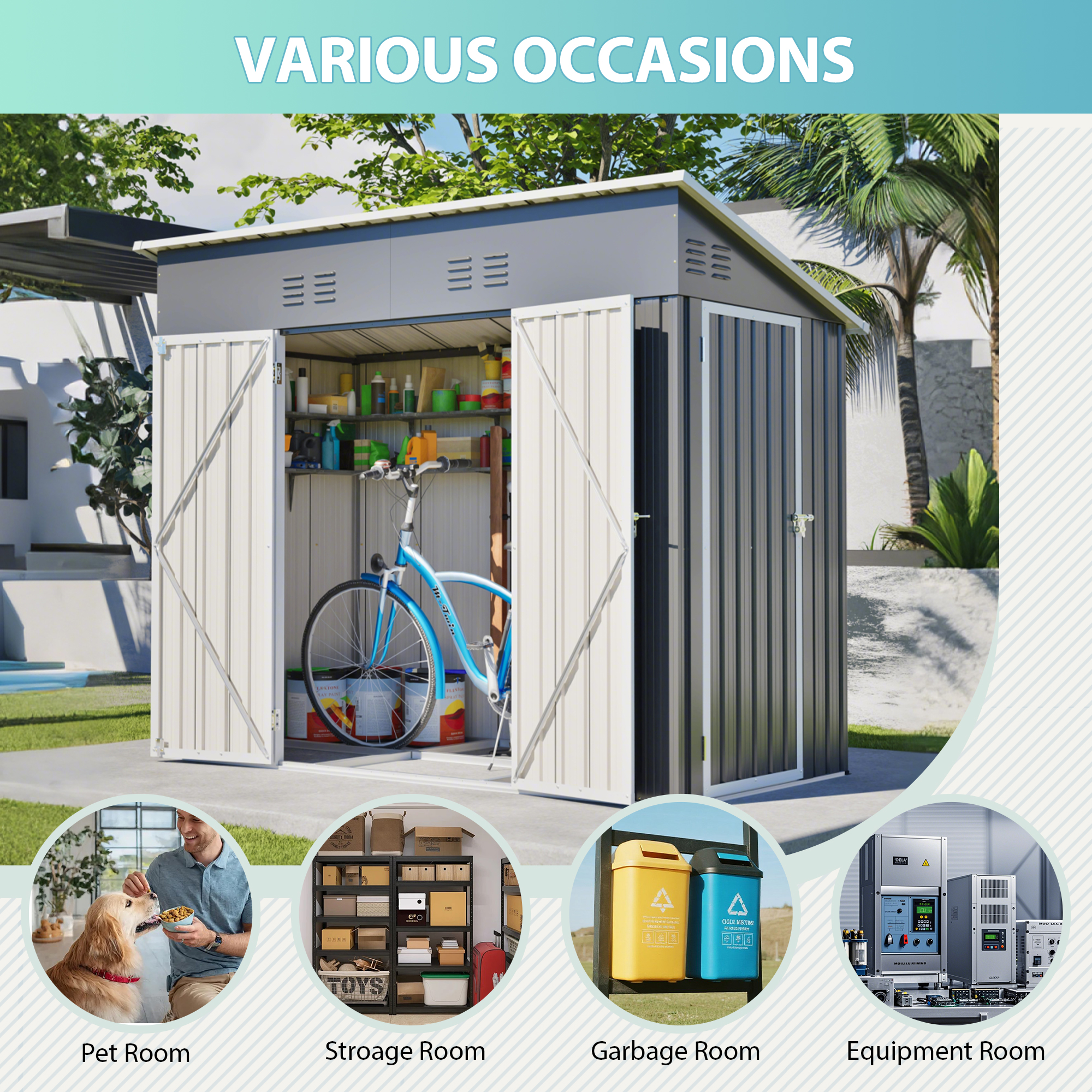 • 【Core Features Overview】This 4x8 ft slope-roof reinforced outdoor storage shed features a heavy-duty metal frame and a water-shedding sloped roof design. It includes 4 air vents for continuous airflow, supports left/right door hinge installation, and comes with an integrated foundation frame for stable and easy setup. Ideal for tool storage, garden organization, pet shelter, and more.
