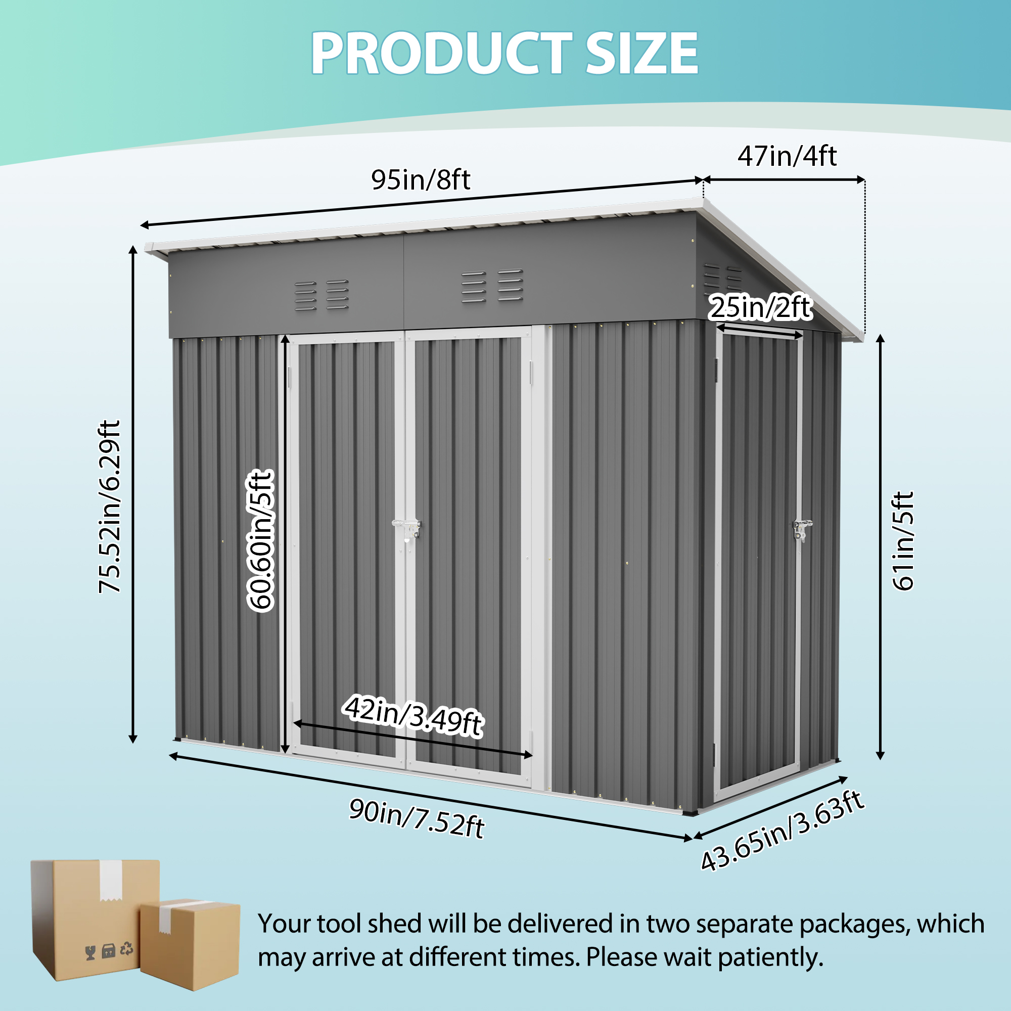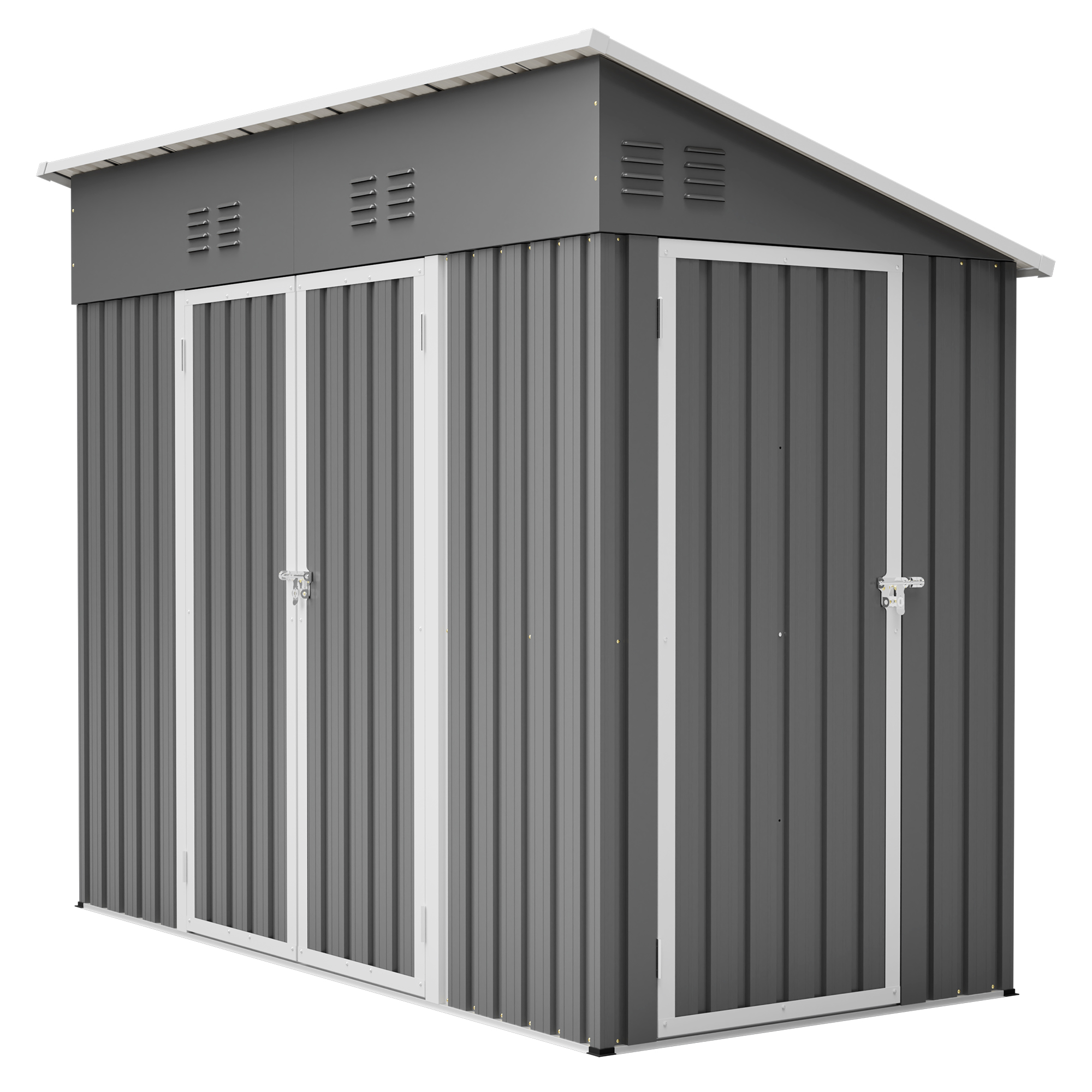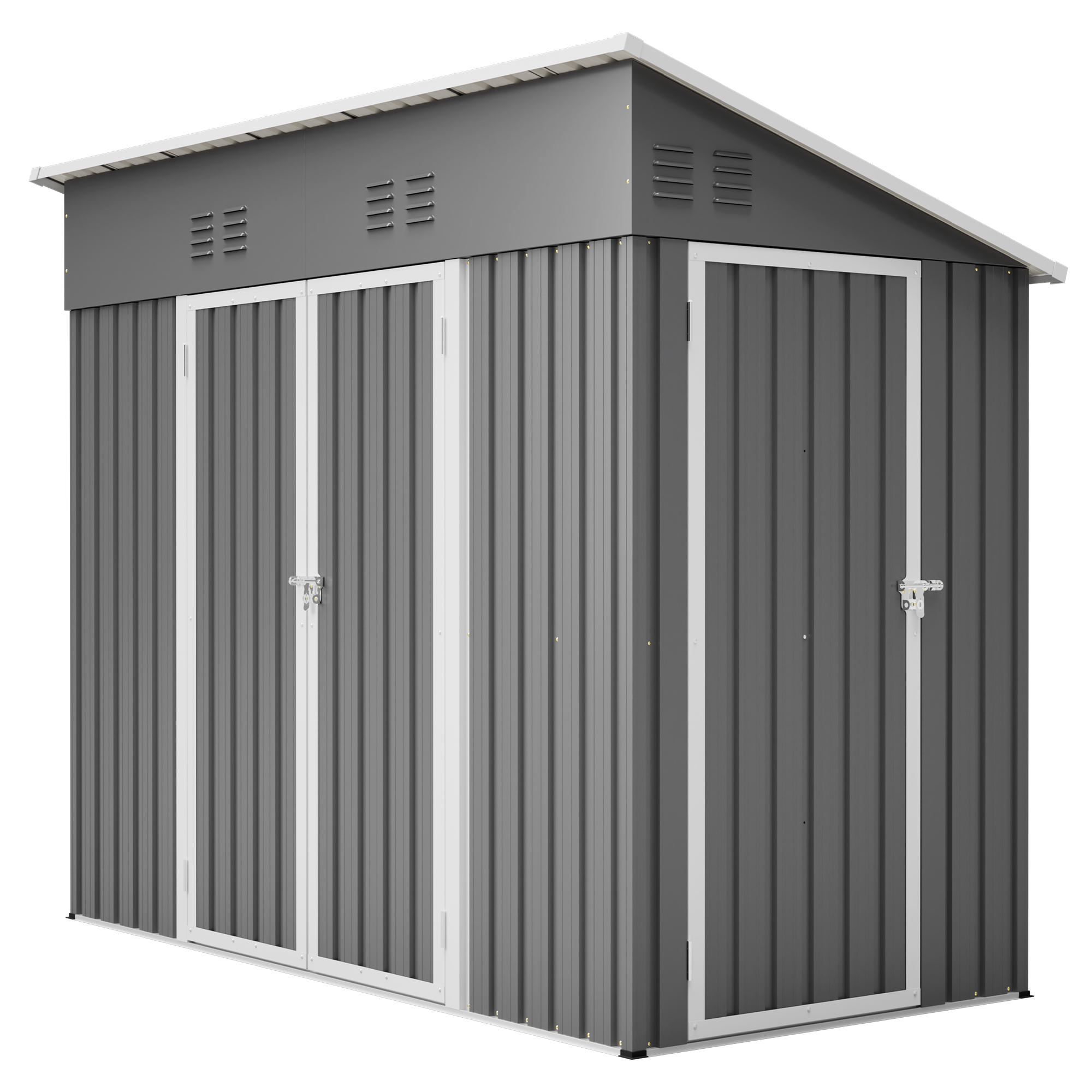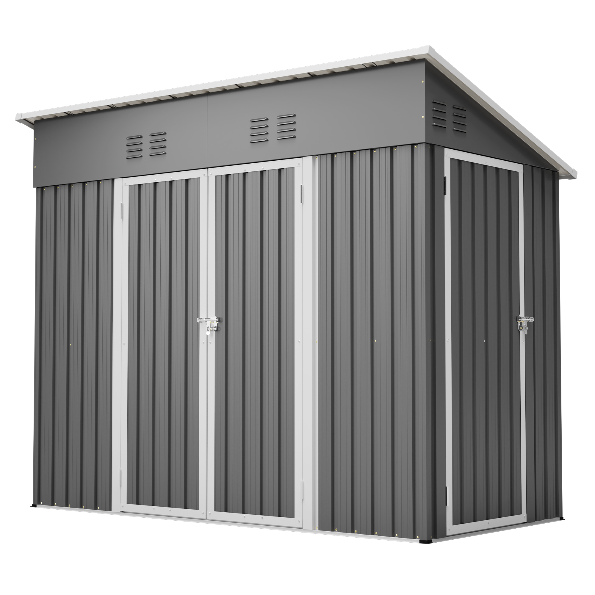 • 【Core Features Overview】This 4x8 ft slope-roof reinforced outdoor storage shed features a heavy-duty metal frame and a water-shedding sloped roof design. It includes 4 air vents for continuous airflow, supports left/right door hinge installation, and comes with an integrated foundation frame for stable and easy setup. Ideal for tool storage, garden organization, pet shelter, and more.
