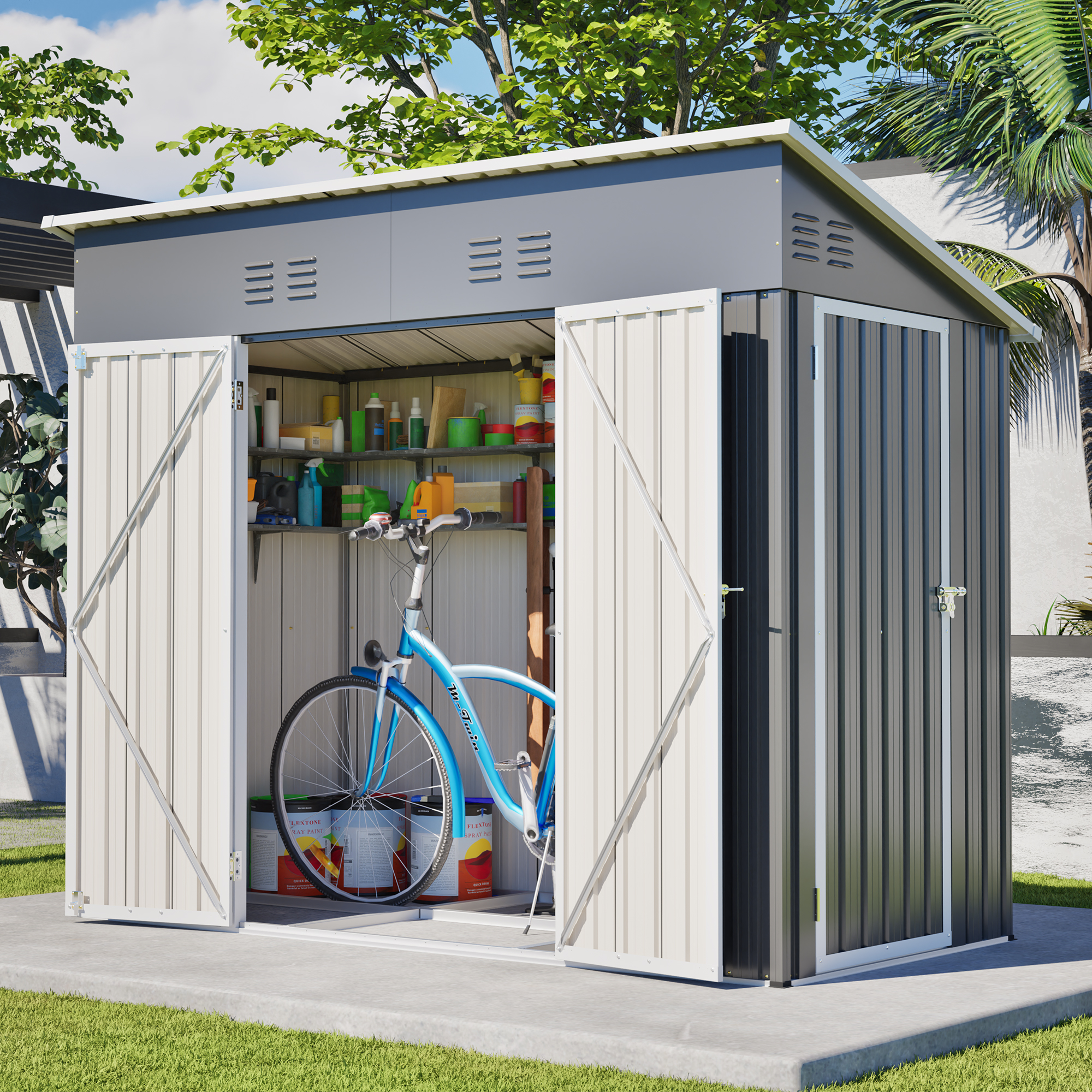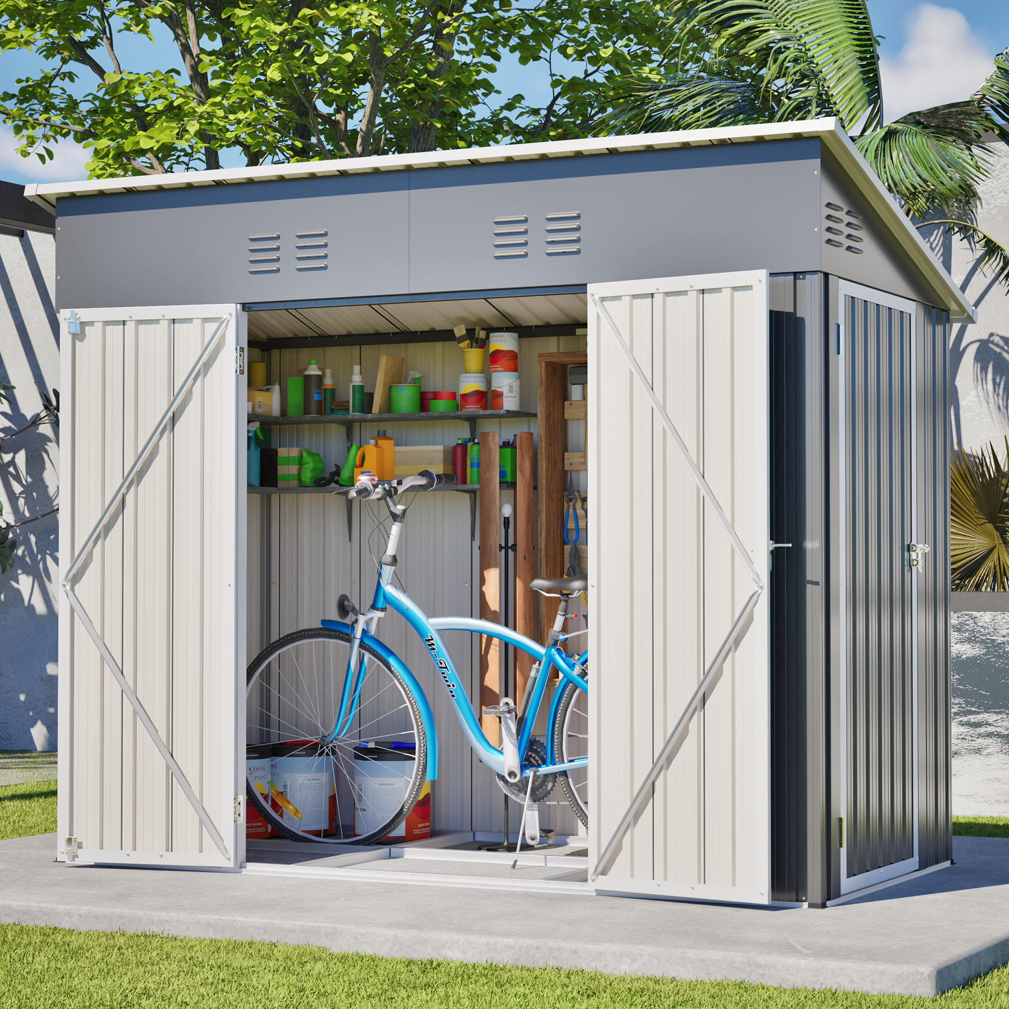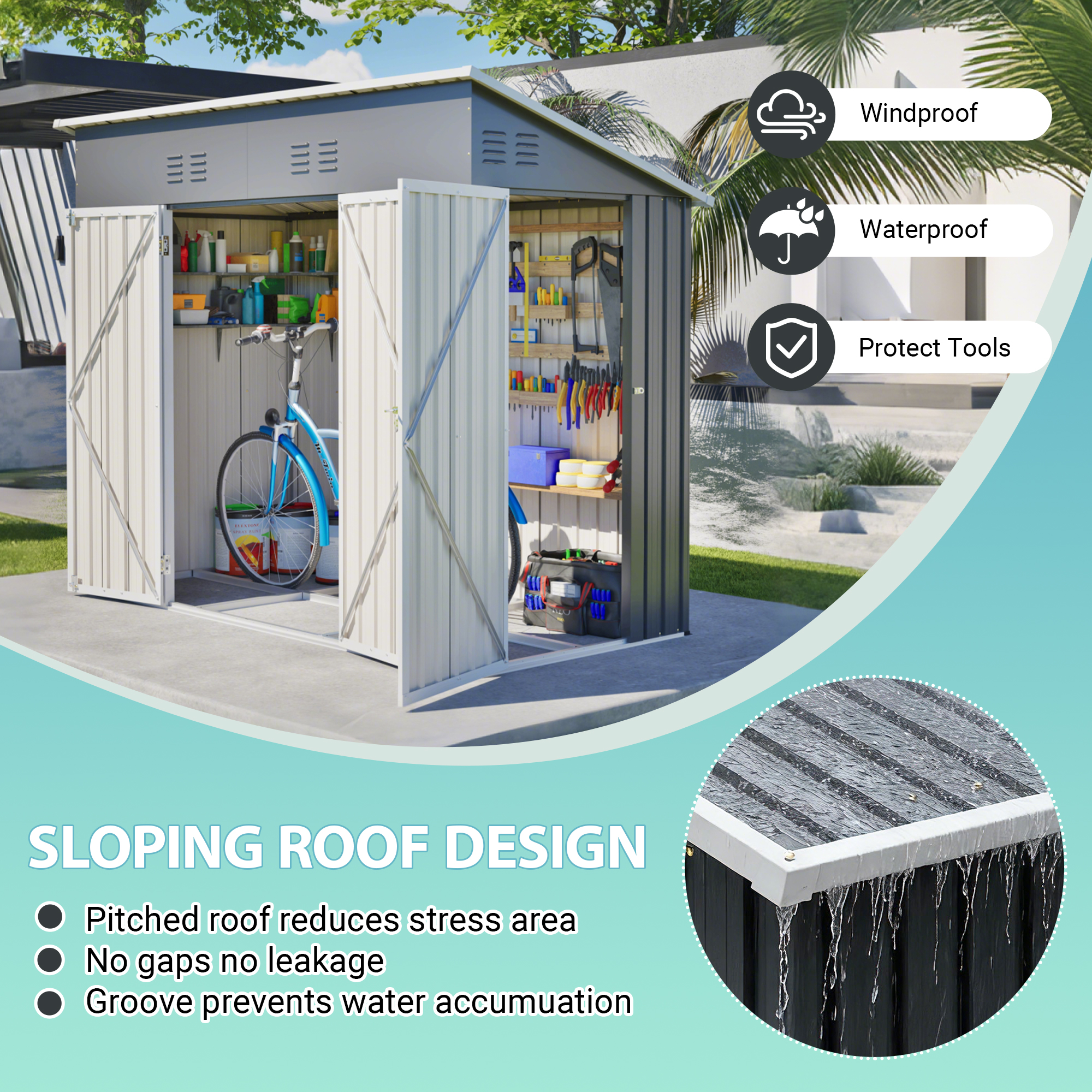• 【Durable Structure for All-Weather Use】Constructed with thickened metal and reinforced panels, this shed offers excellent wind resistance and load-bearing capacity. The sloped roof efficiently drains rainwater, prevents pooling, and maintains structural integrity in rain, snow, and windy conditions.
