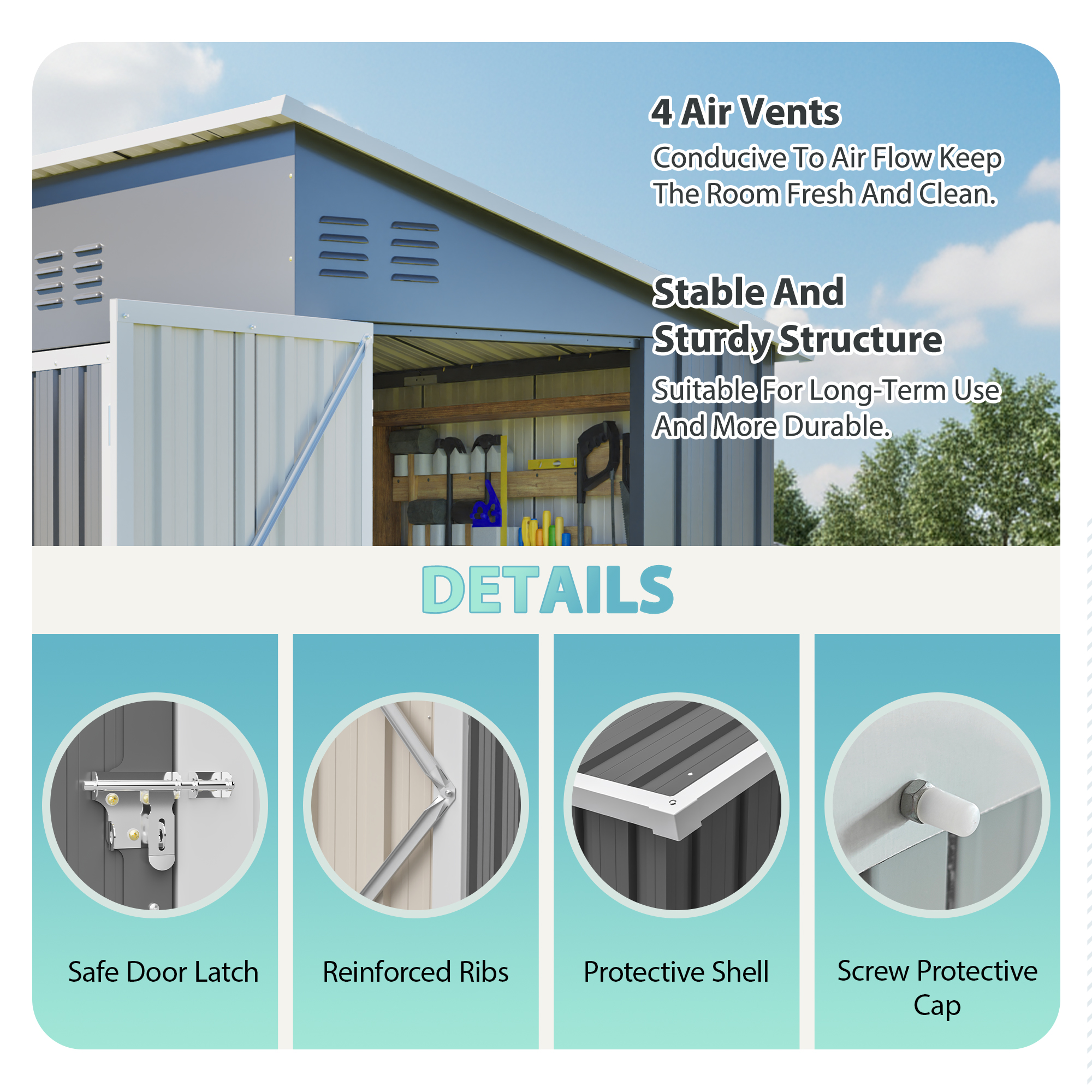 • 【Ventilation & Moisture Protection】Four integrated air vents promote constant air circulation, reducing humidity and preventing mold. The roof and seams are tightly sealed to keep the interior completely dry and your belongings well-protected.