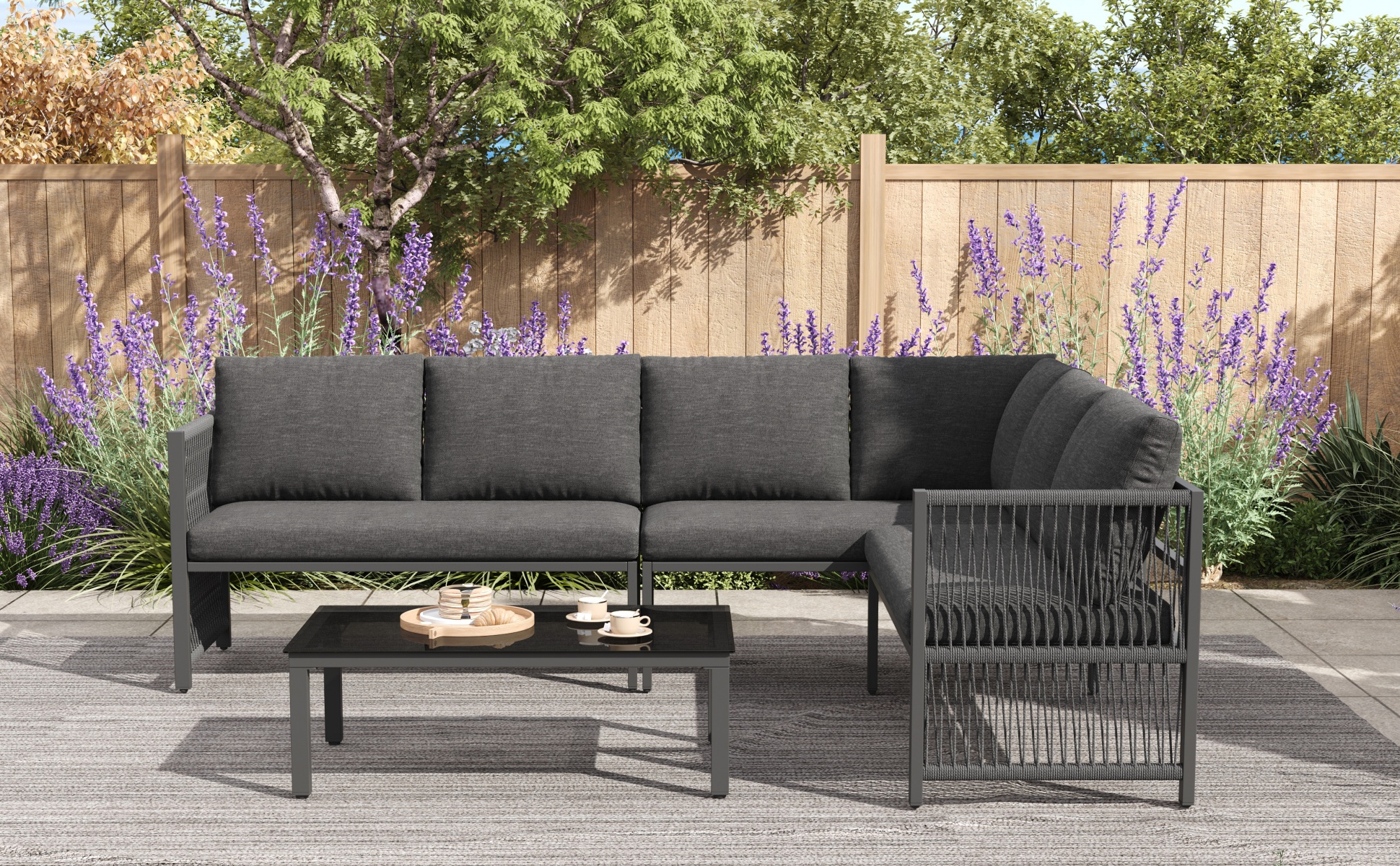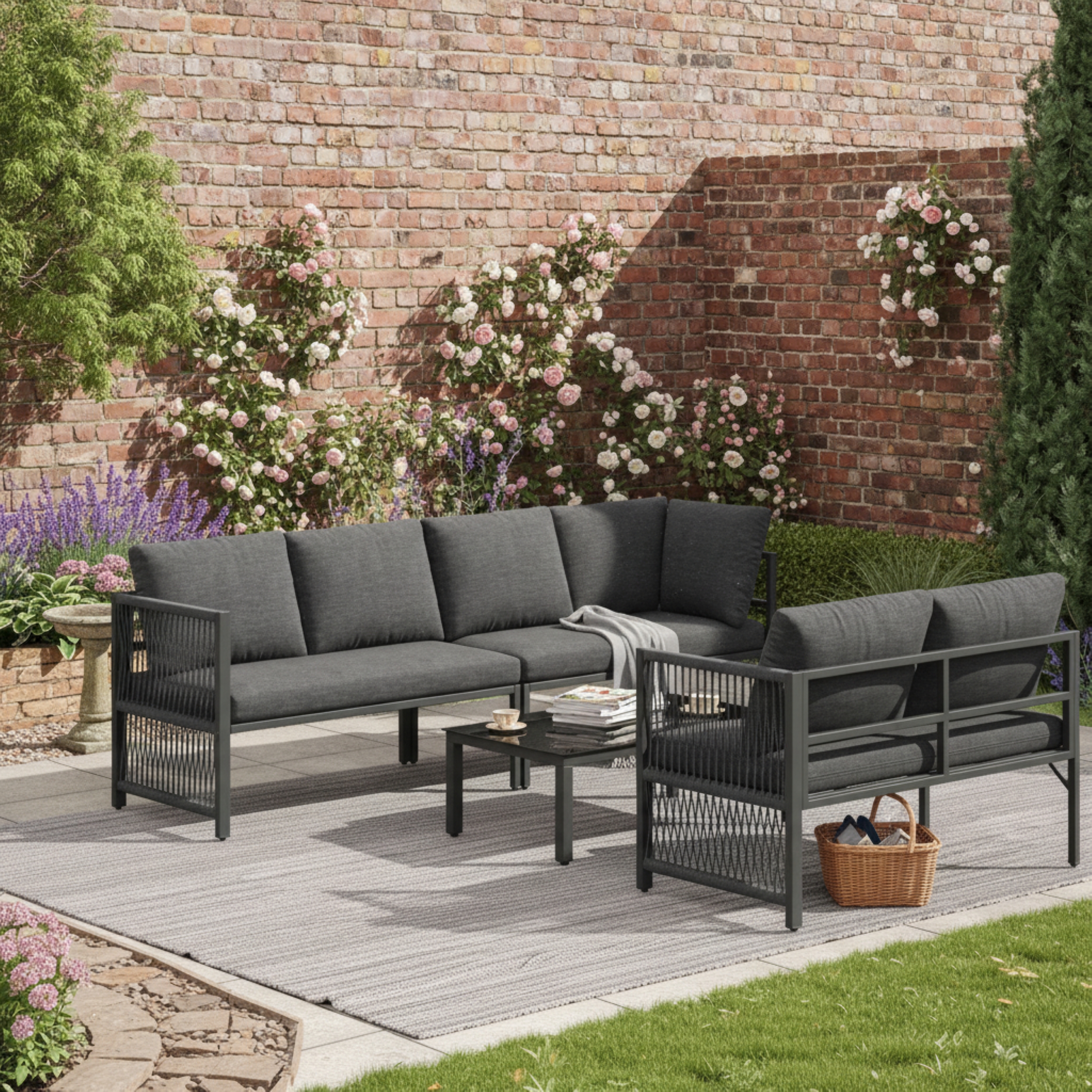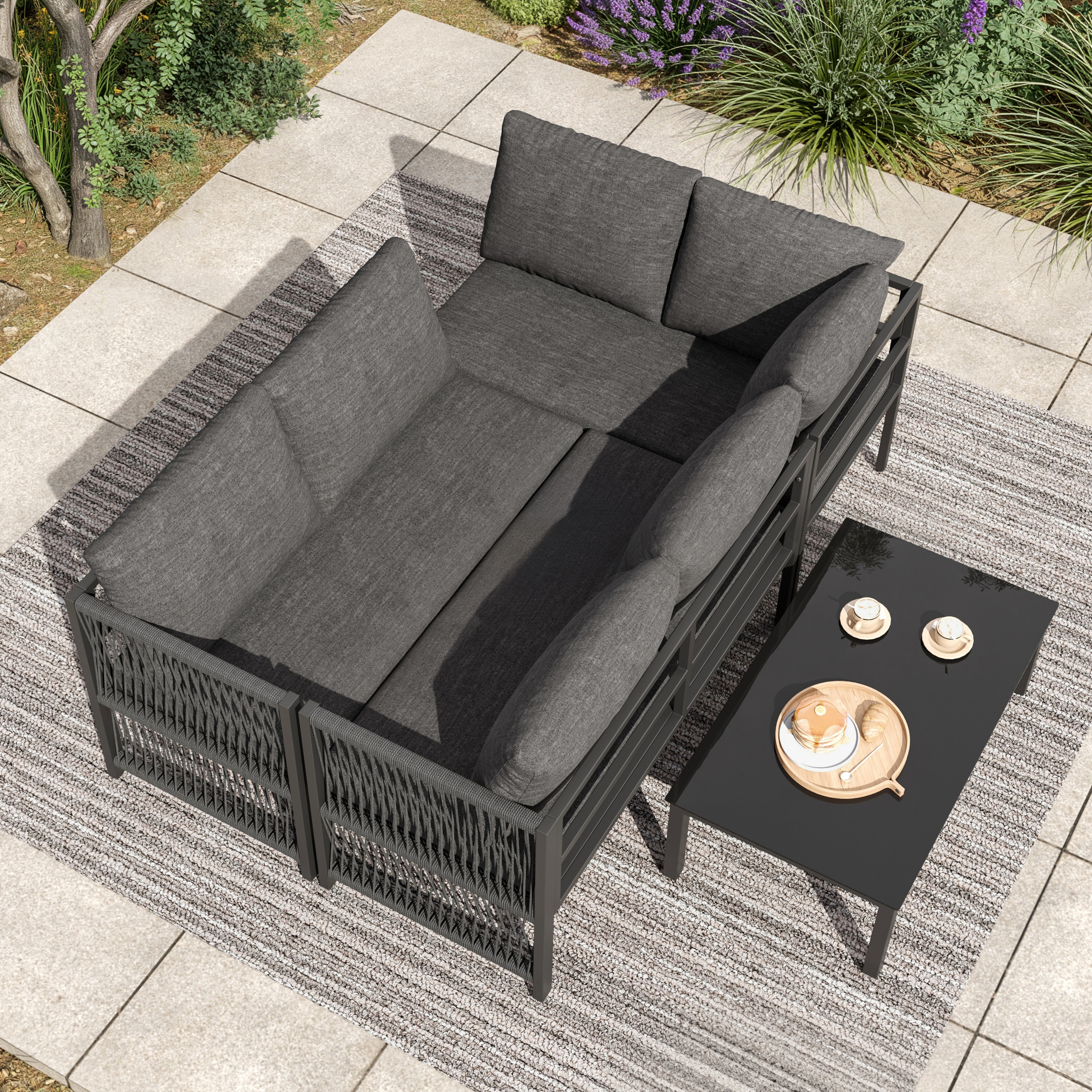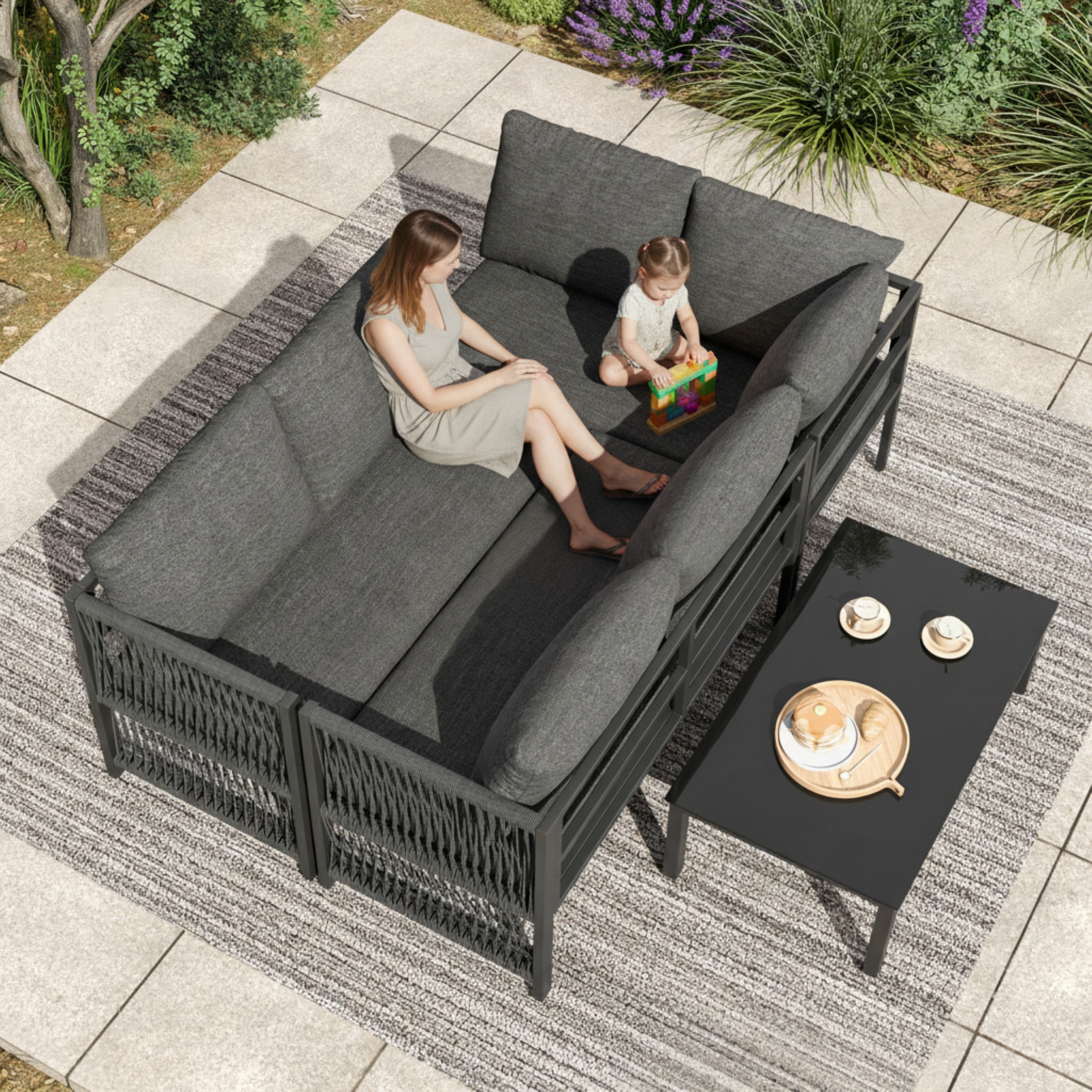 - Tempered glass coffee table ( Please note that coasters should be used when drinking hot beverages) - Convertible 5-6 seater modular arrangement - Weatherproof linen fabric & high density cushion - Hand woven all weather polyester rope - Modern appearance suitable for suitable for balconies, terraces, gardens and other settings