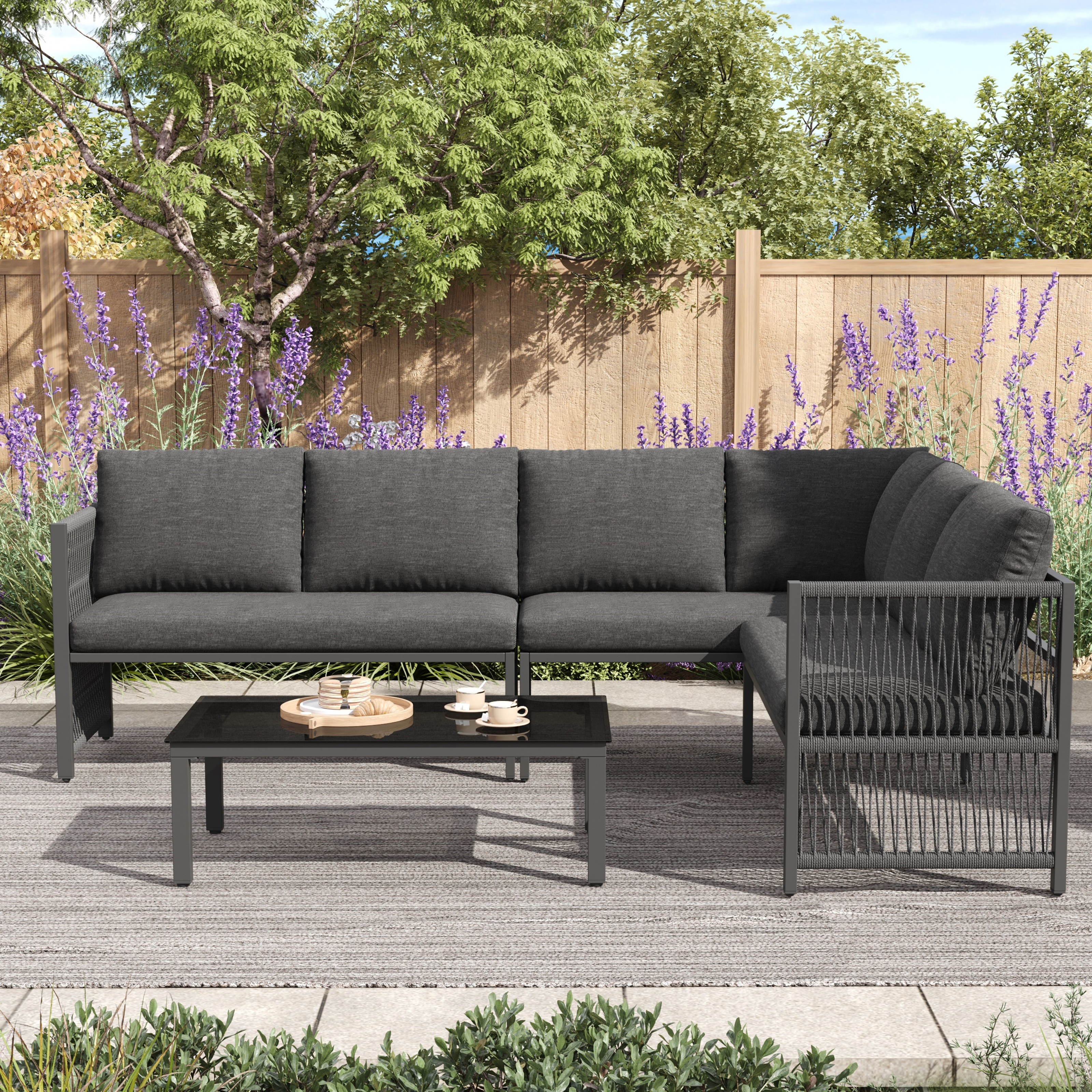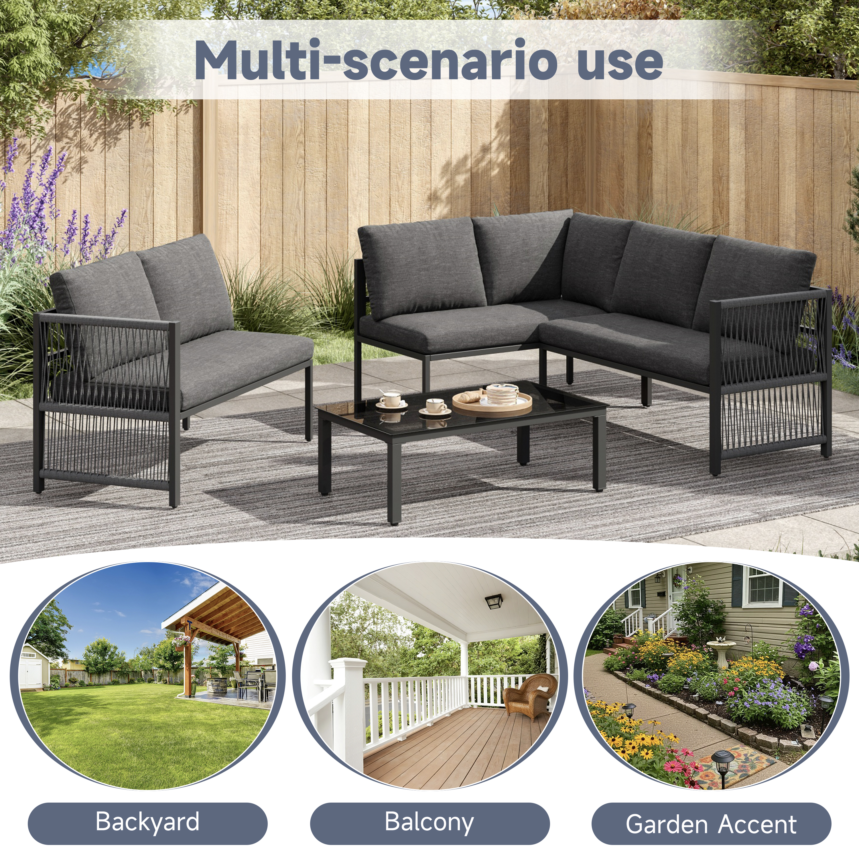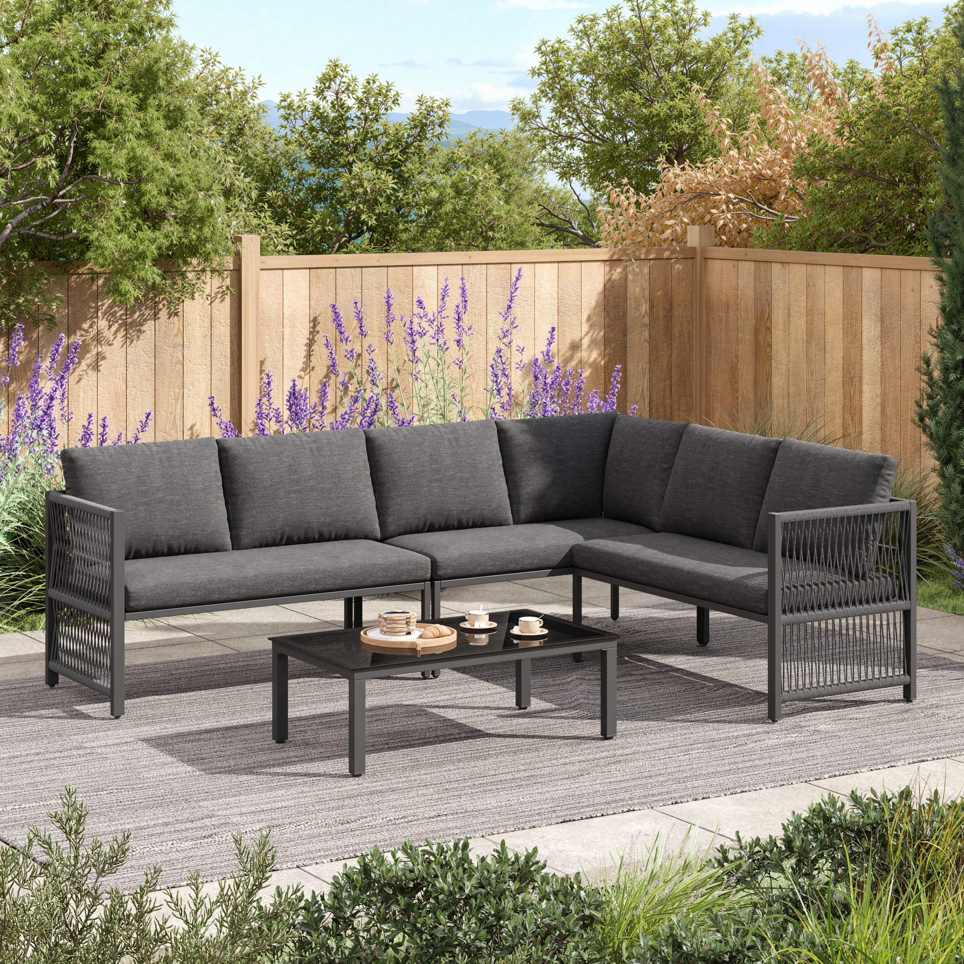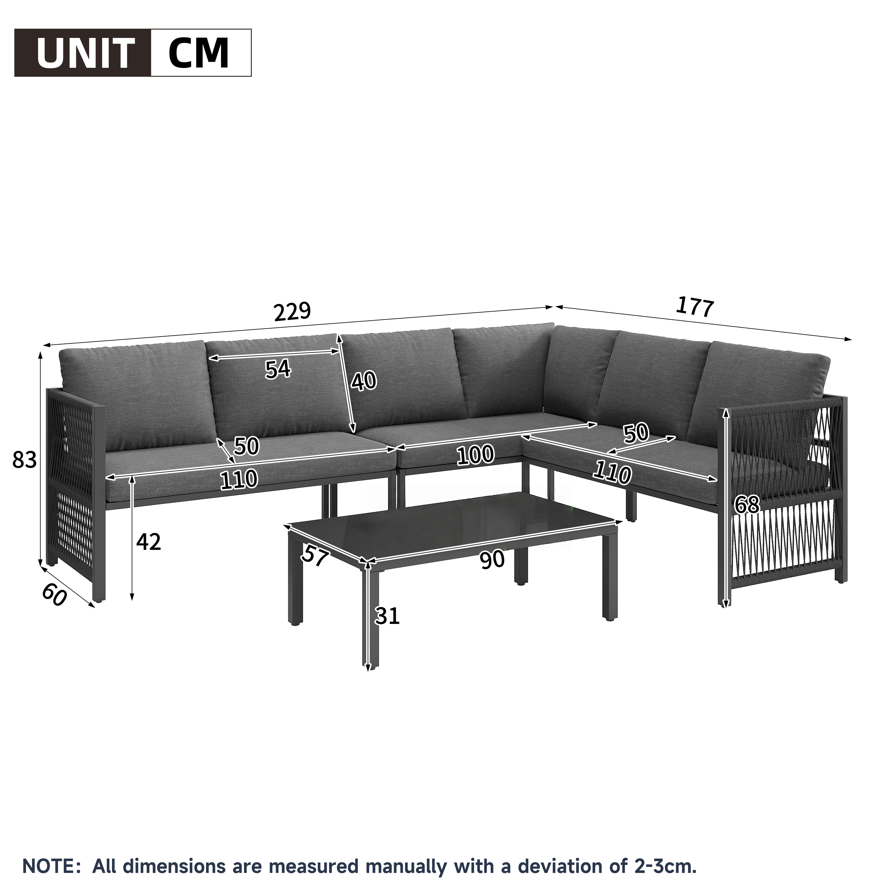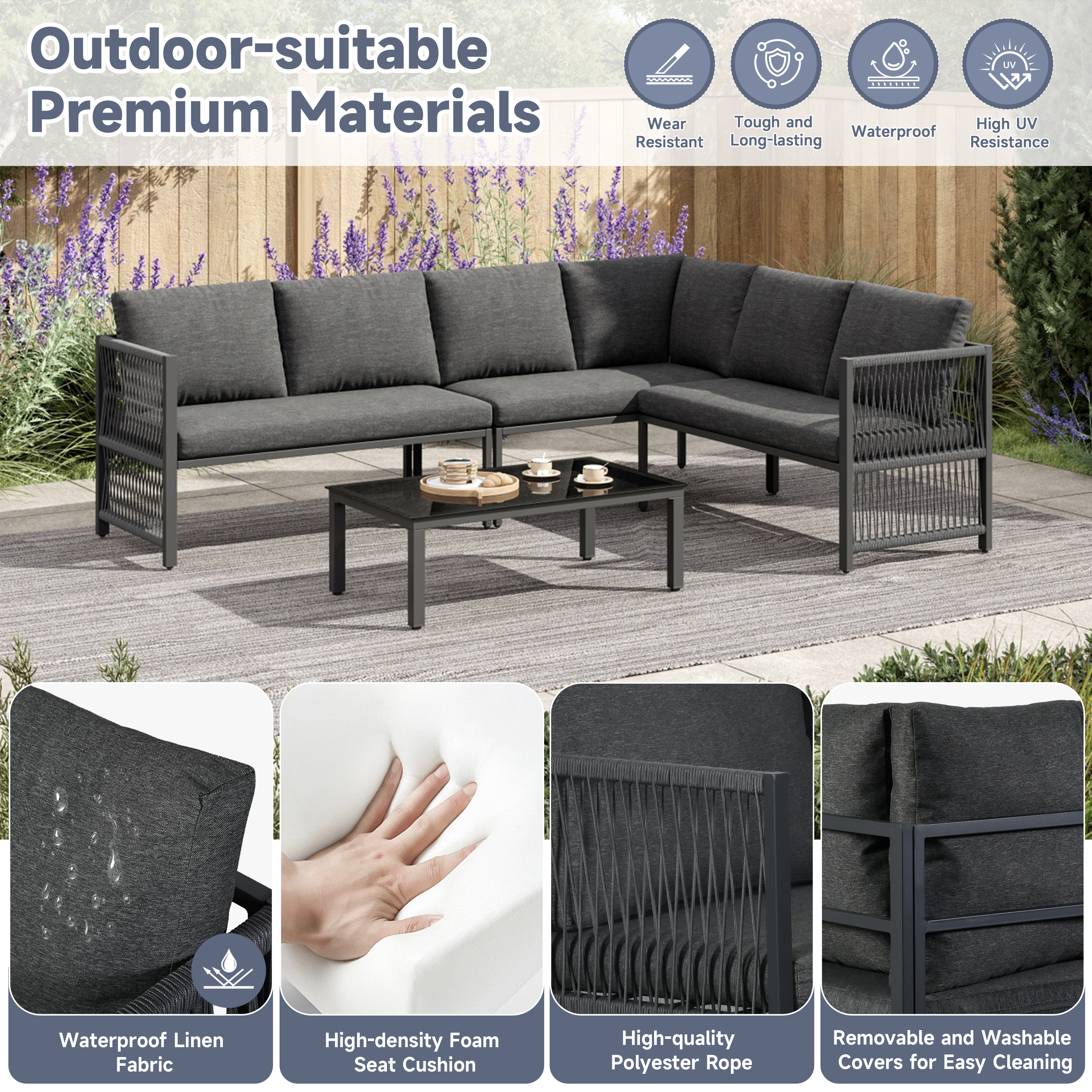 Product Name:5-6 Seater Garden Furniture Set with Tempered Glass Coffee Table, L-Shaped Corner Sofa with Polyester Rope, Weatherproof Outdoor Patio Dining Lounge Set for Balcony and Terrace, Linen, Grey