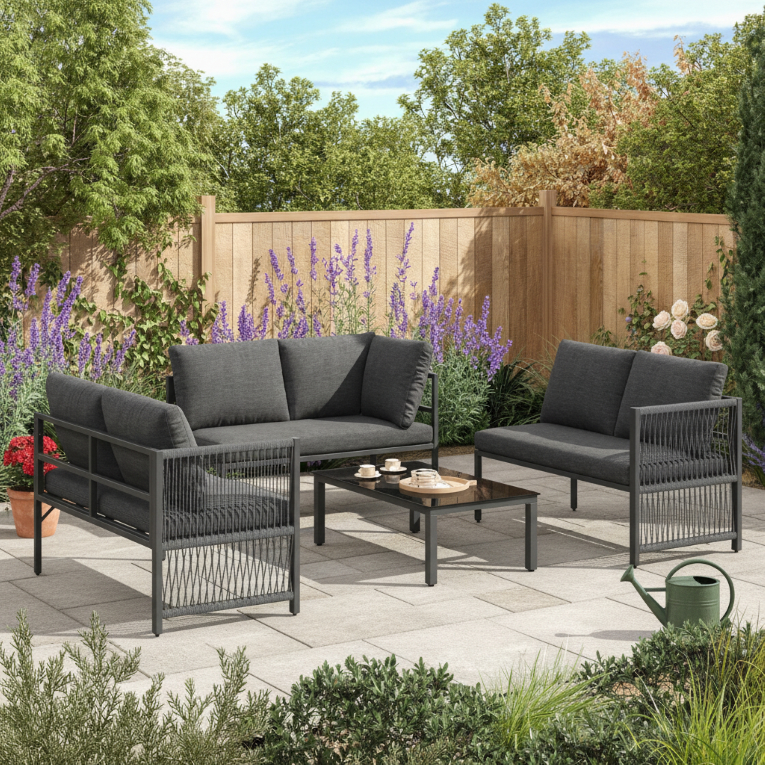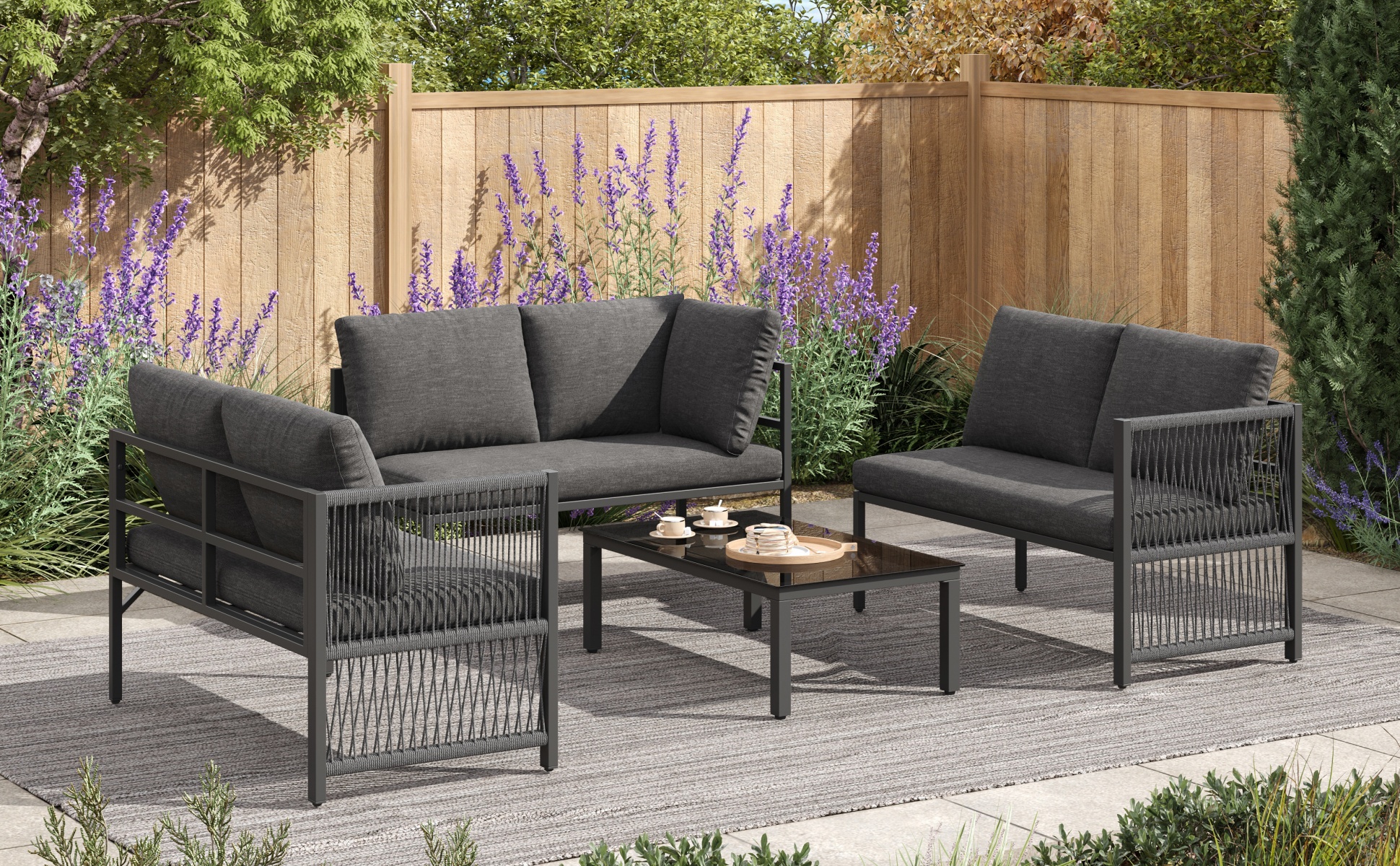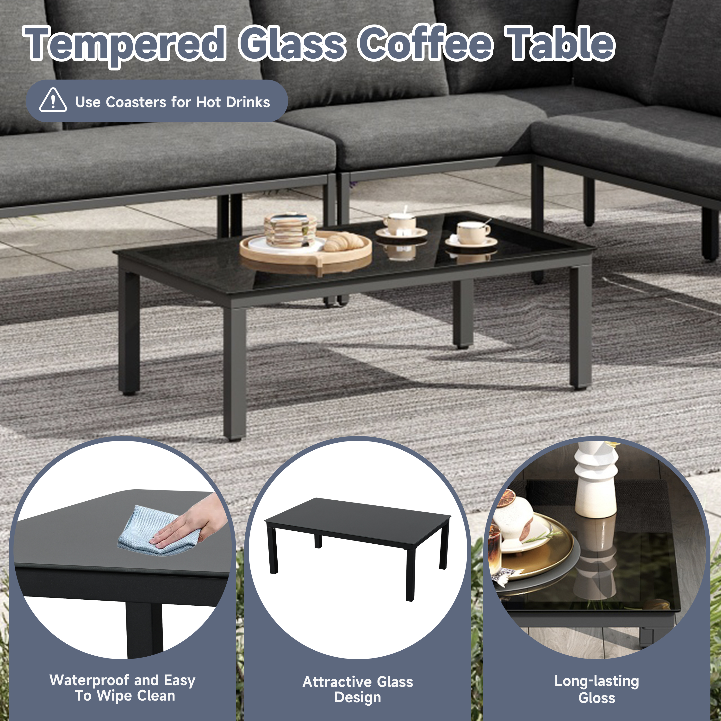 • [Tempered Glass Coffee Table] The set includes a matching coffee table with a sleek tempered glass top, providing a stable and attractive surface for drinks and snacks. The glass is securely fixed and is easy to wipe clean after daily use, supporting a low-maintenance outdoor lifestyle. Please note that coasters should be used when drinking hot beverages.