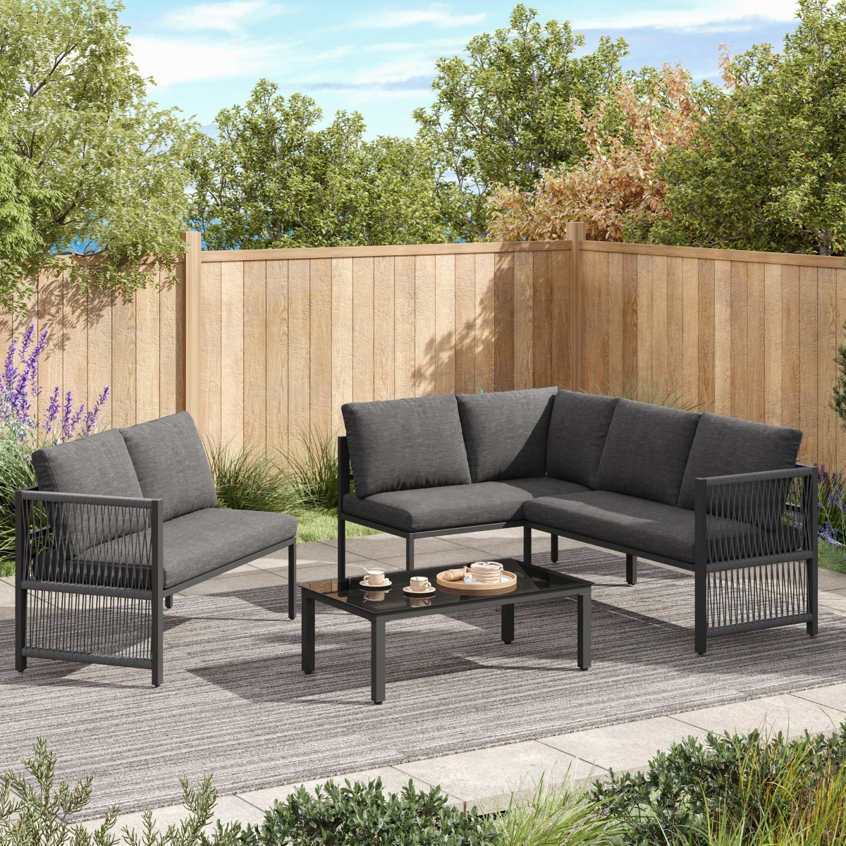 5-6 Seater Garden Furniture Set With Tempered Glass Coffee Table, L-Shaped Corner Sofa With Polyester Rope, Weatherproof Outdoor Patio Dining Lounge Set For Balcony And Terrace, Linen, Grey