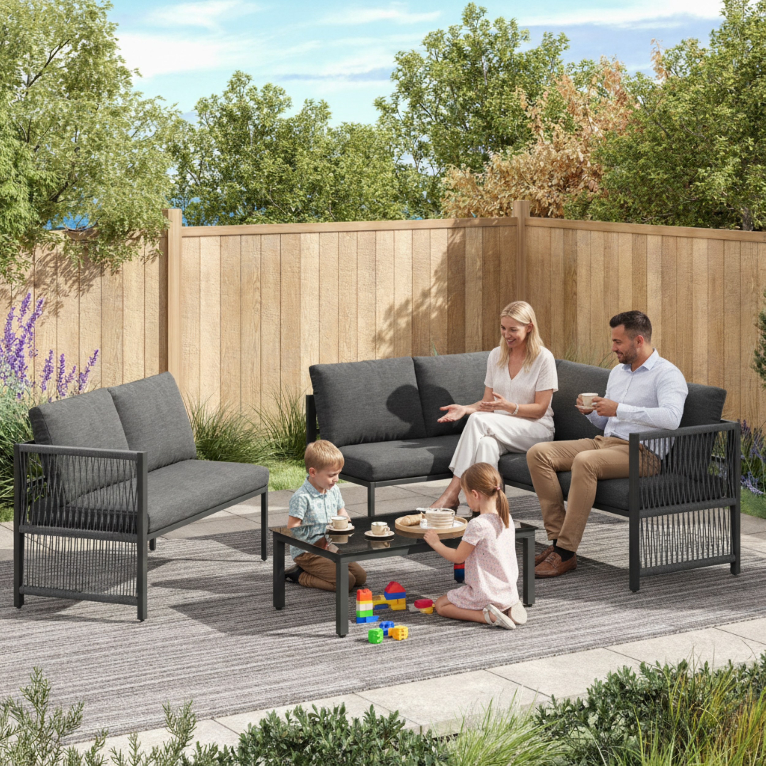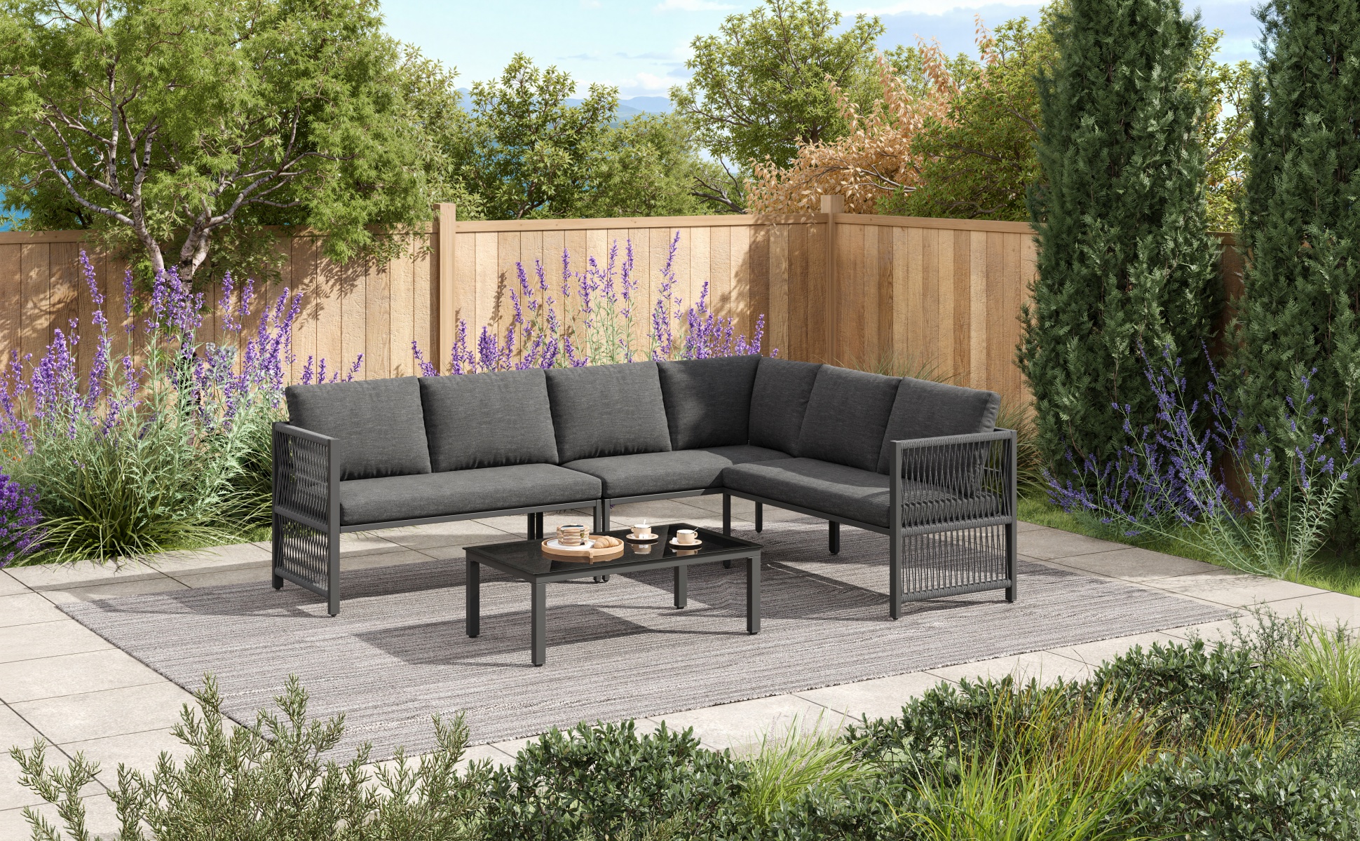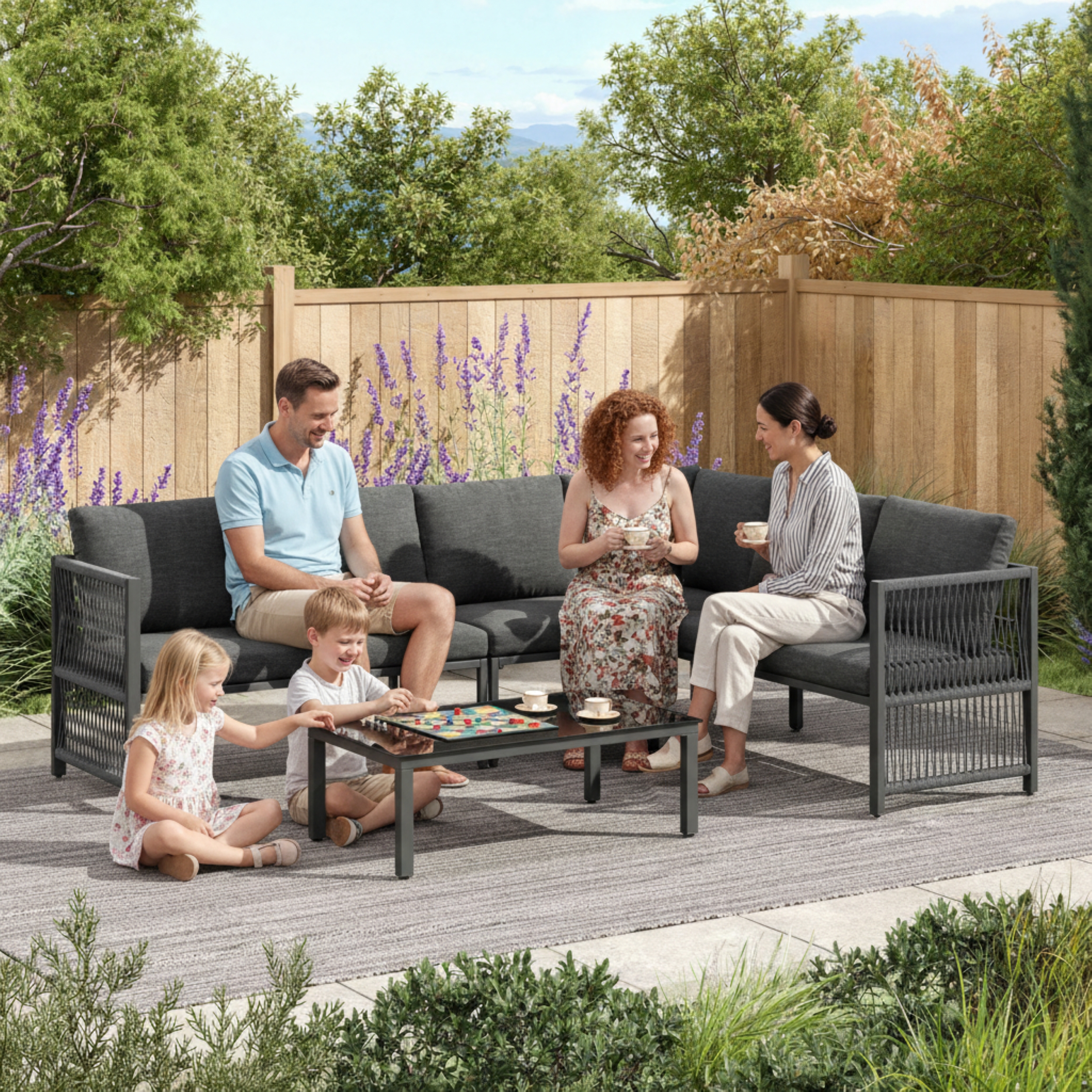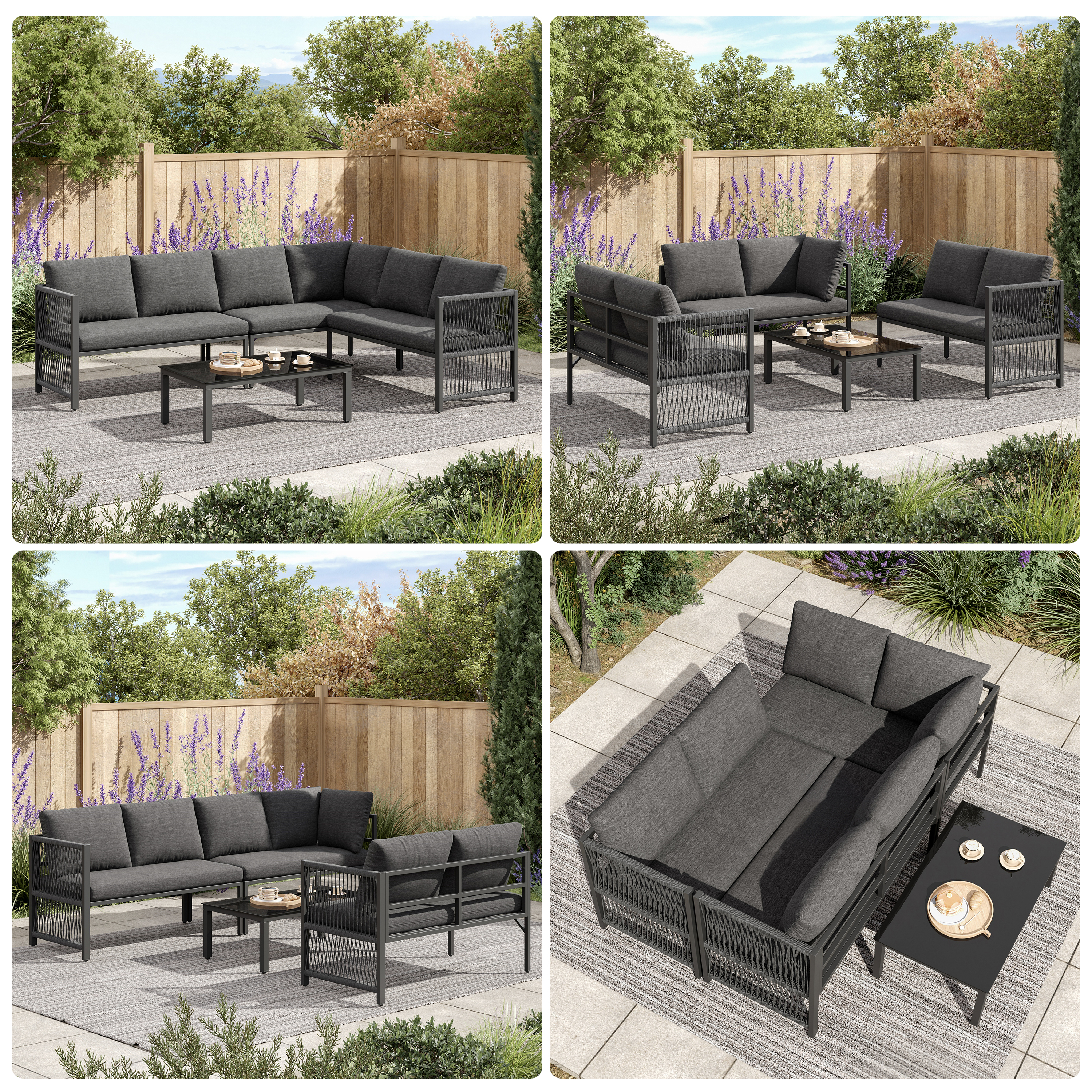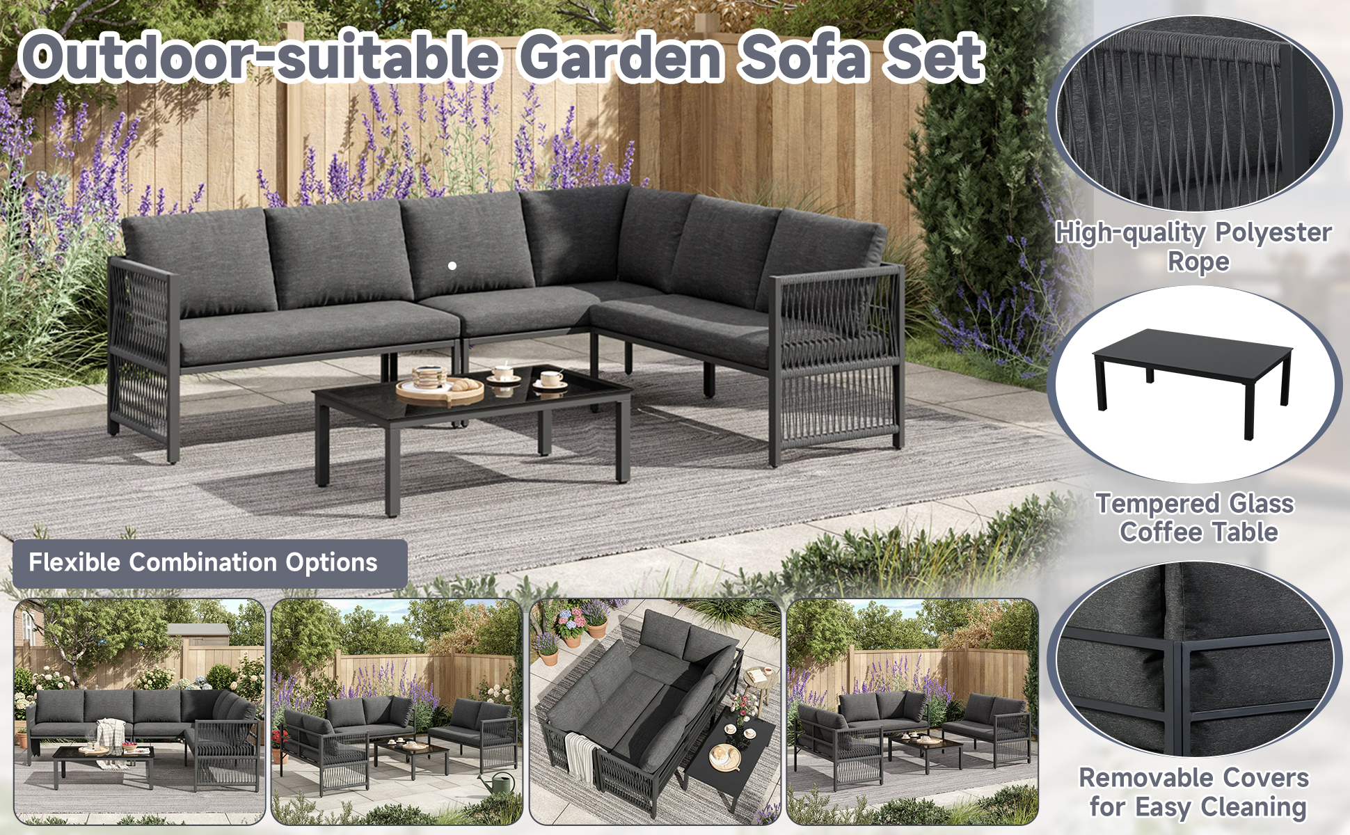 • [Flexible 5-6 Seater Modular Arrangement] Designed with versatility in mind, this 5-6 seater modular set can be easily rearranged to suit different outdoor scenes and layouts. Whether you need a classic L-shaped corner sofa for social gatherings or a more spread-out seating plan for sunbathing, this set adapts to your specific needs. It can be flexibly converted into various modules such as two-seater armrests sofas, lounge sofa and corner sofas. Paired with a coffee table.