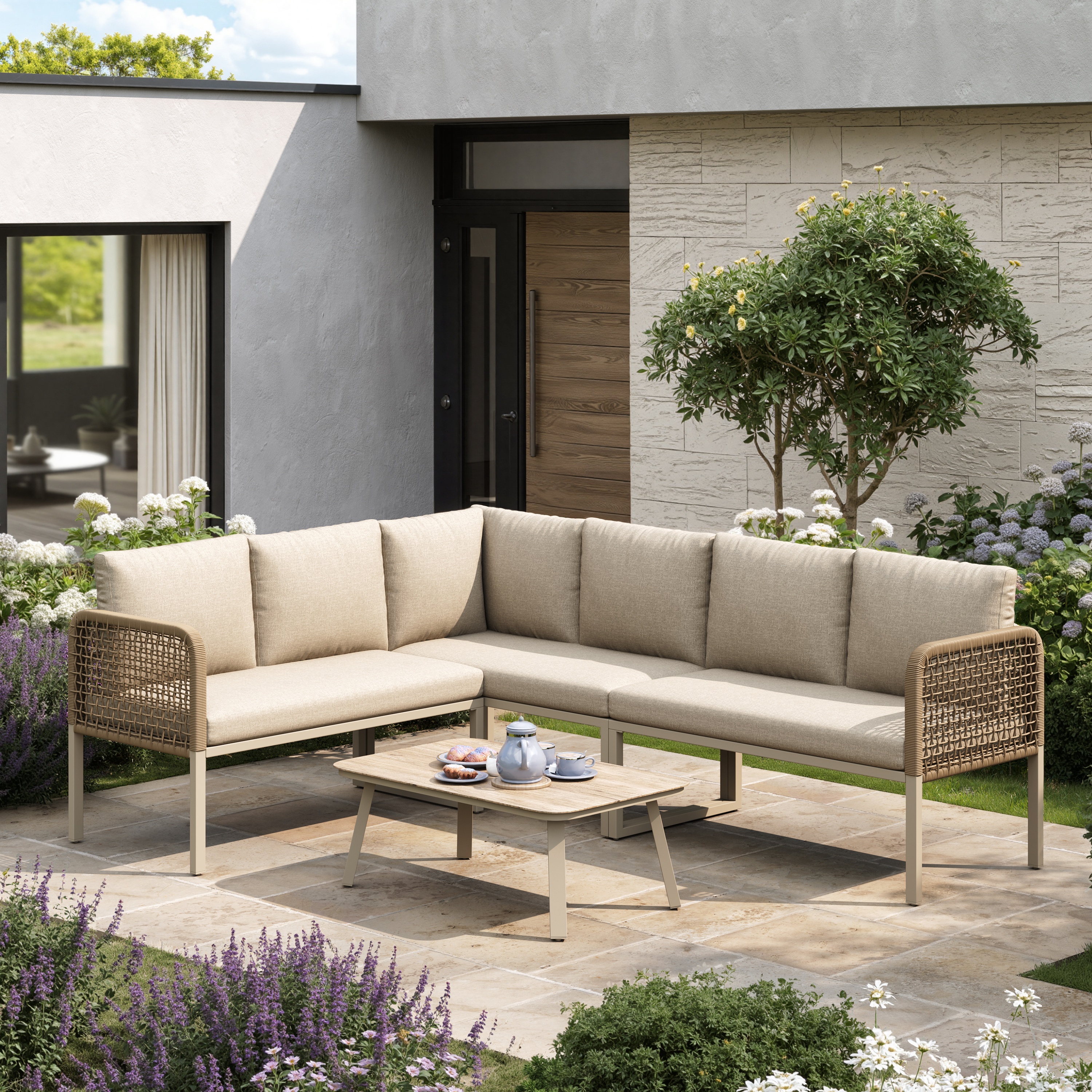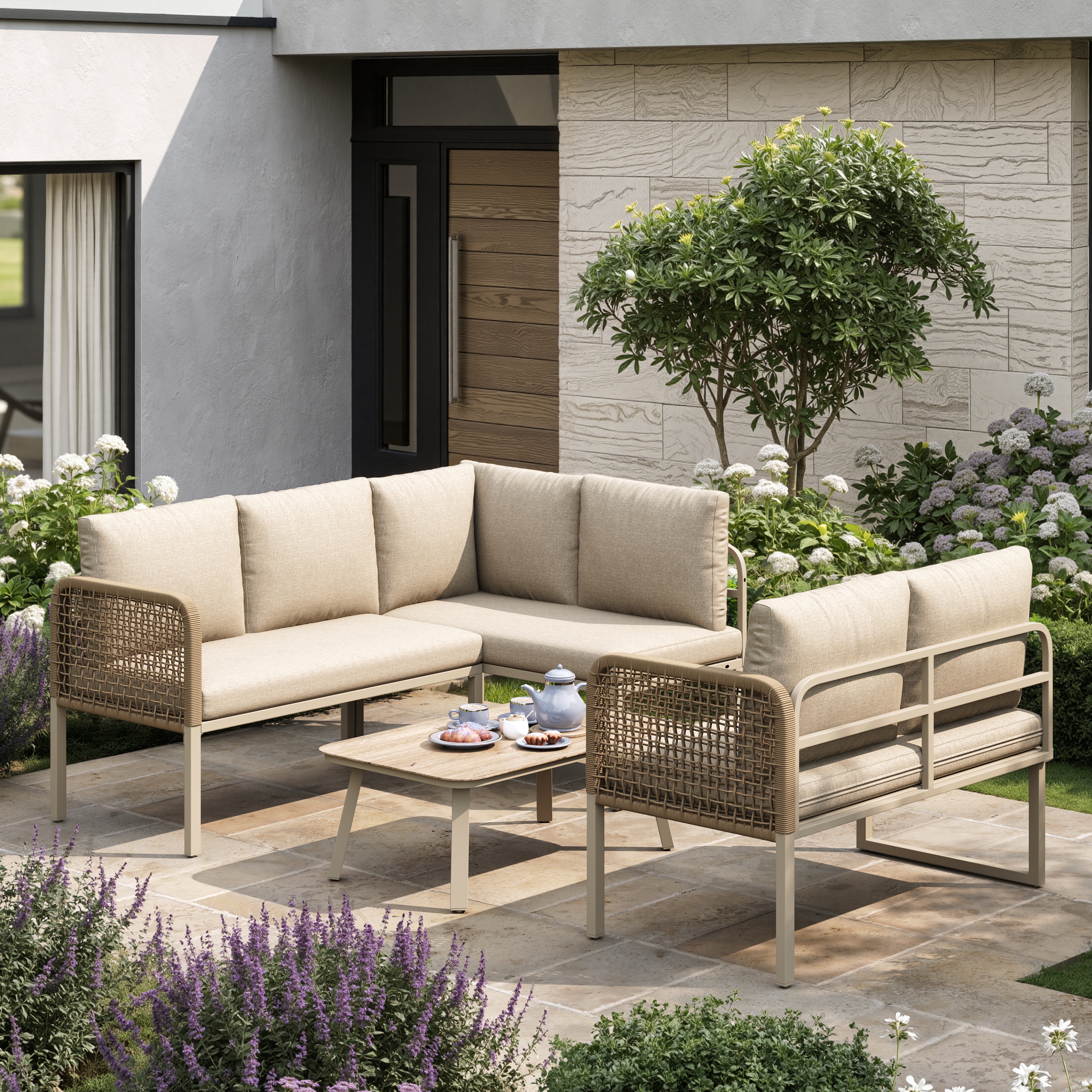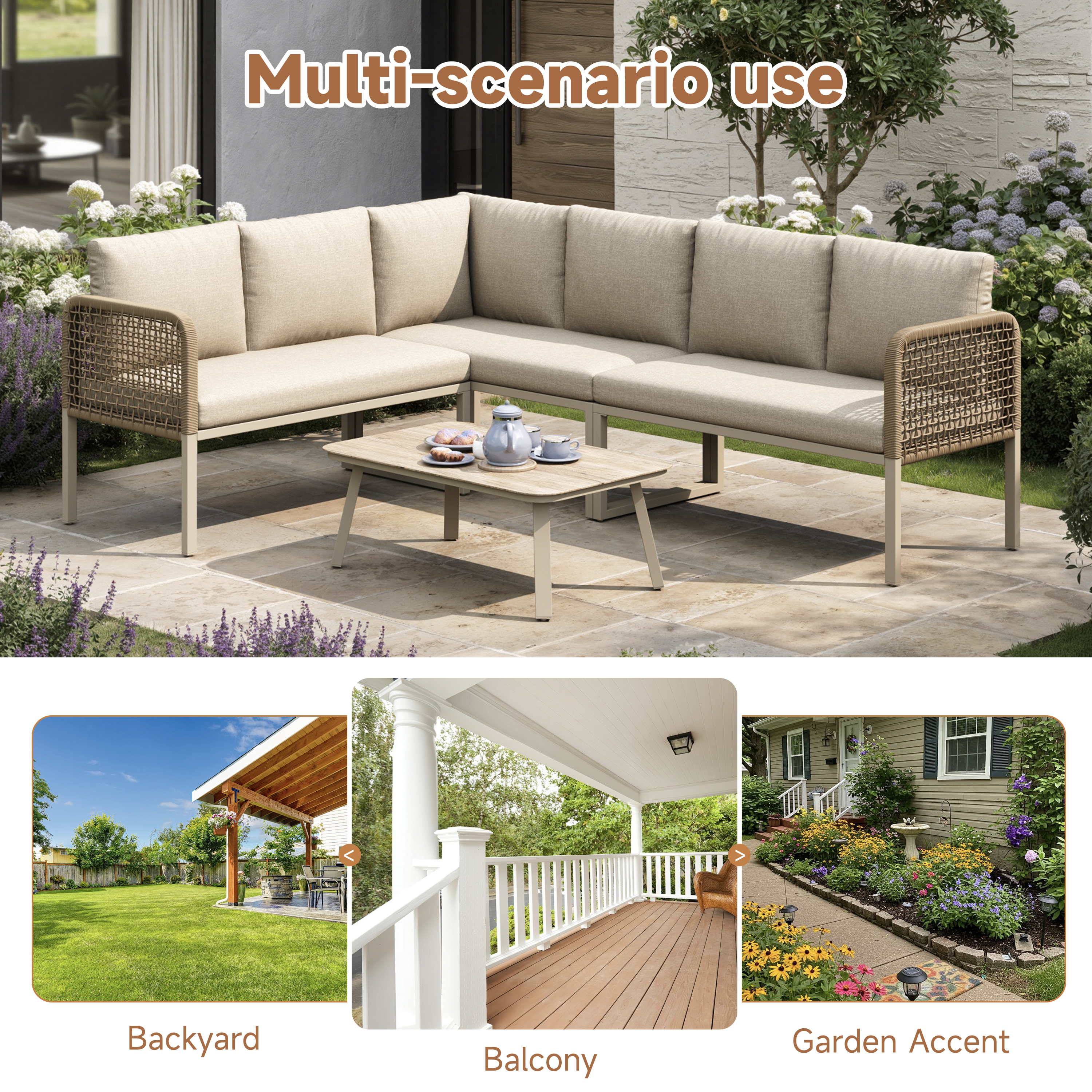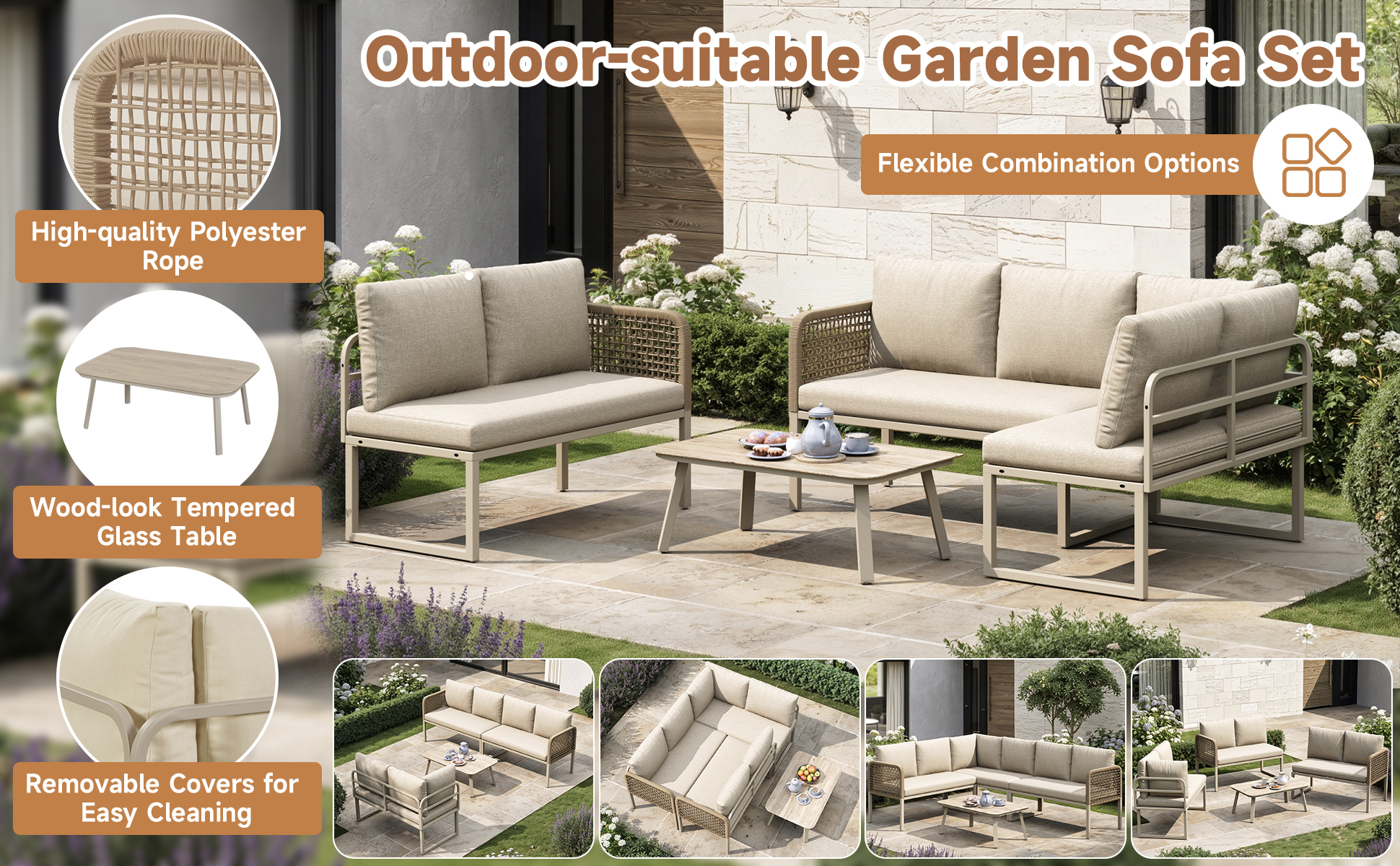5-6 Seater Garden Furniture Set With Wood-look Tempered Glass Coffee Table, L-Shaped Corner Sofa With Polyester Rope, Weatherproof Outdoor Patio Dining Lounge Set For Balcony And Terrace, Linen, Beige