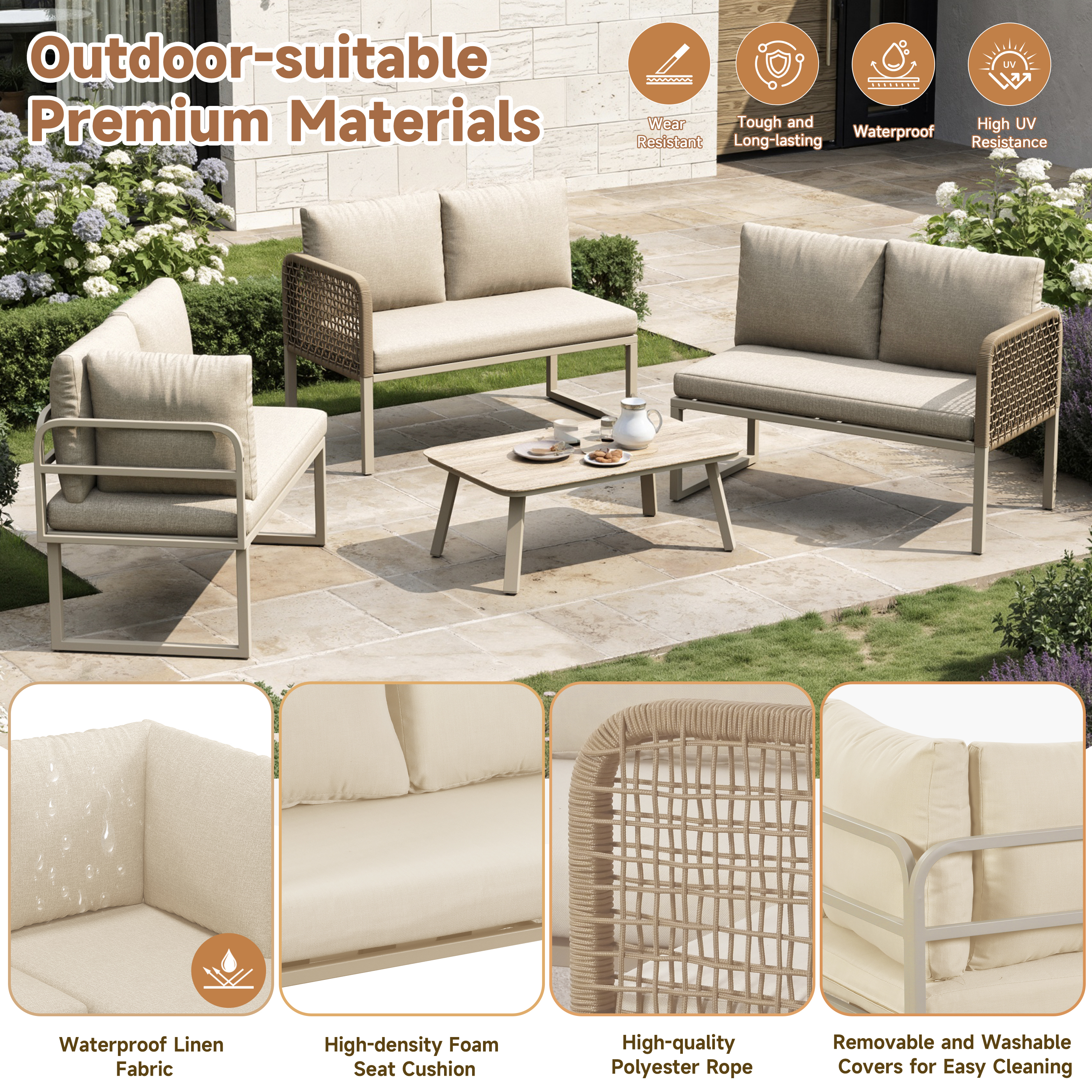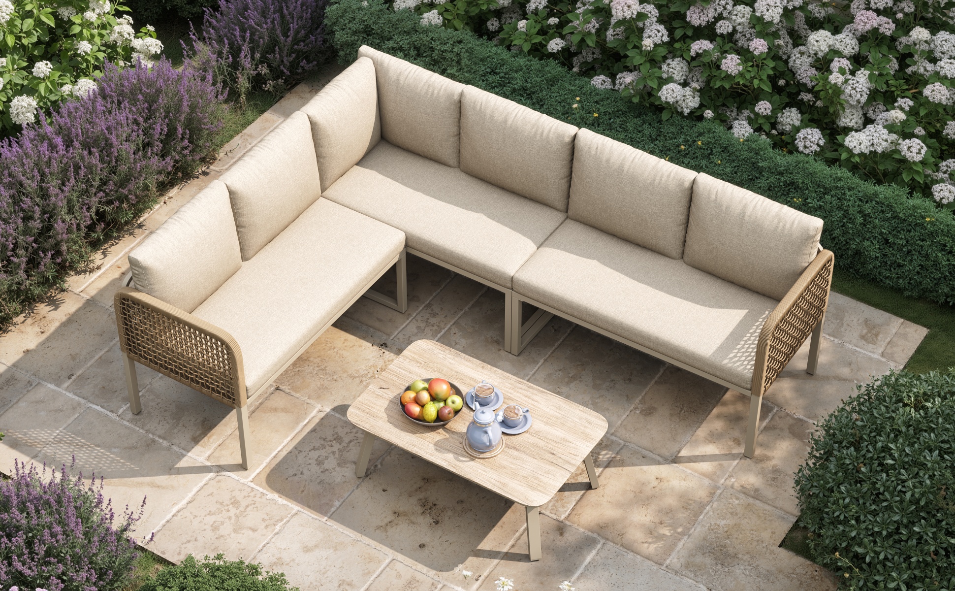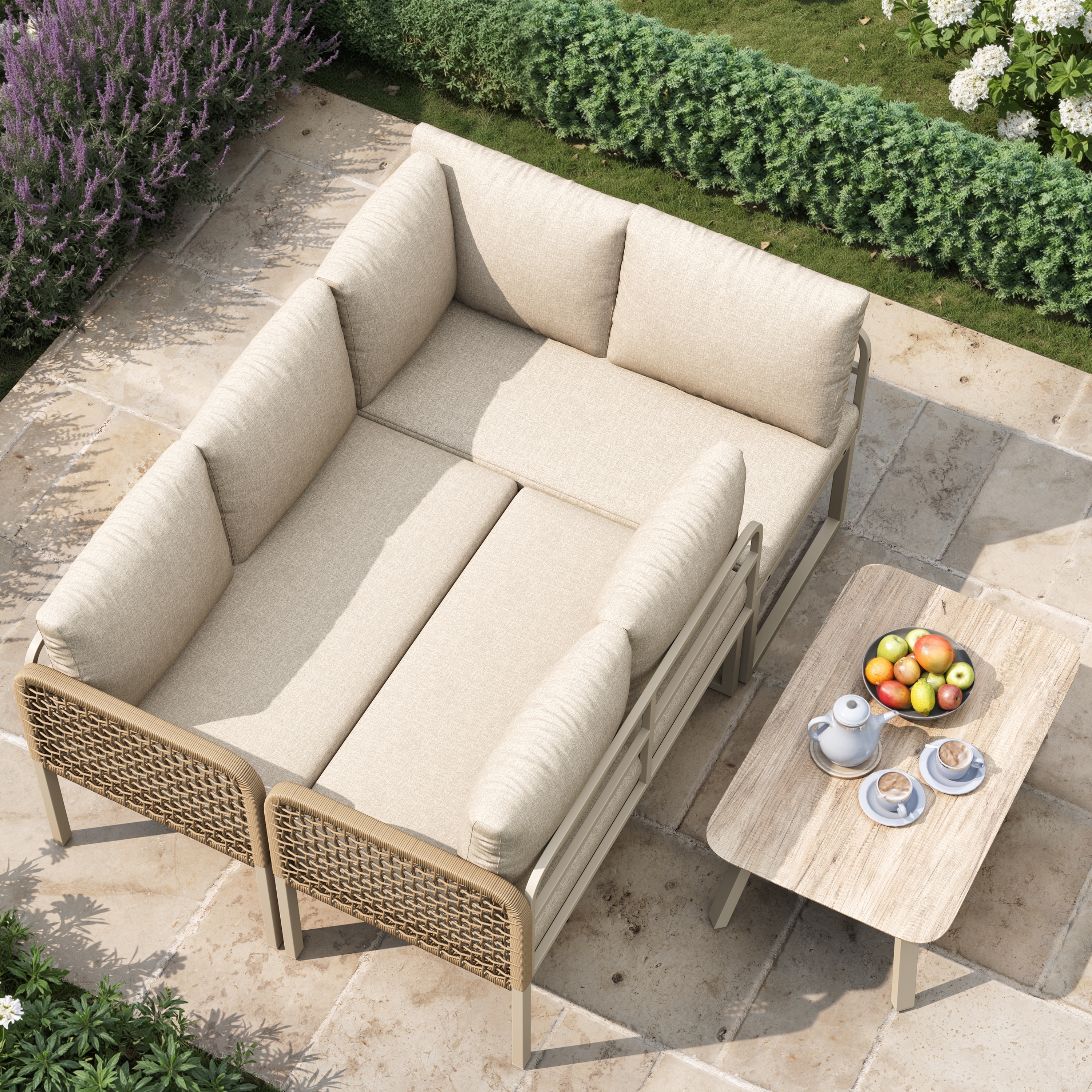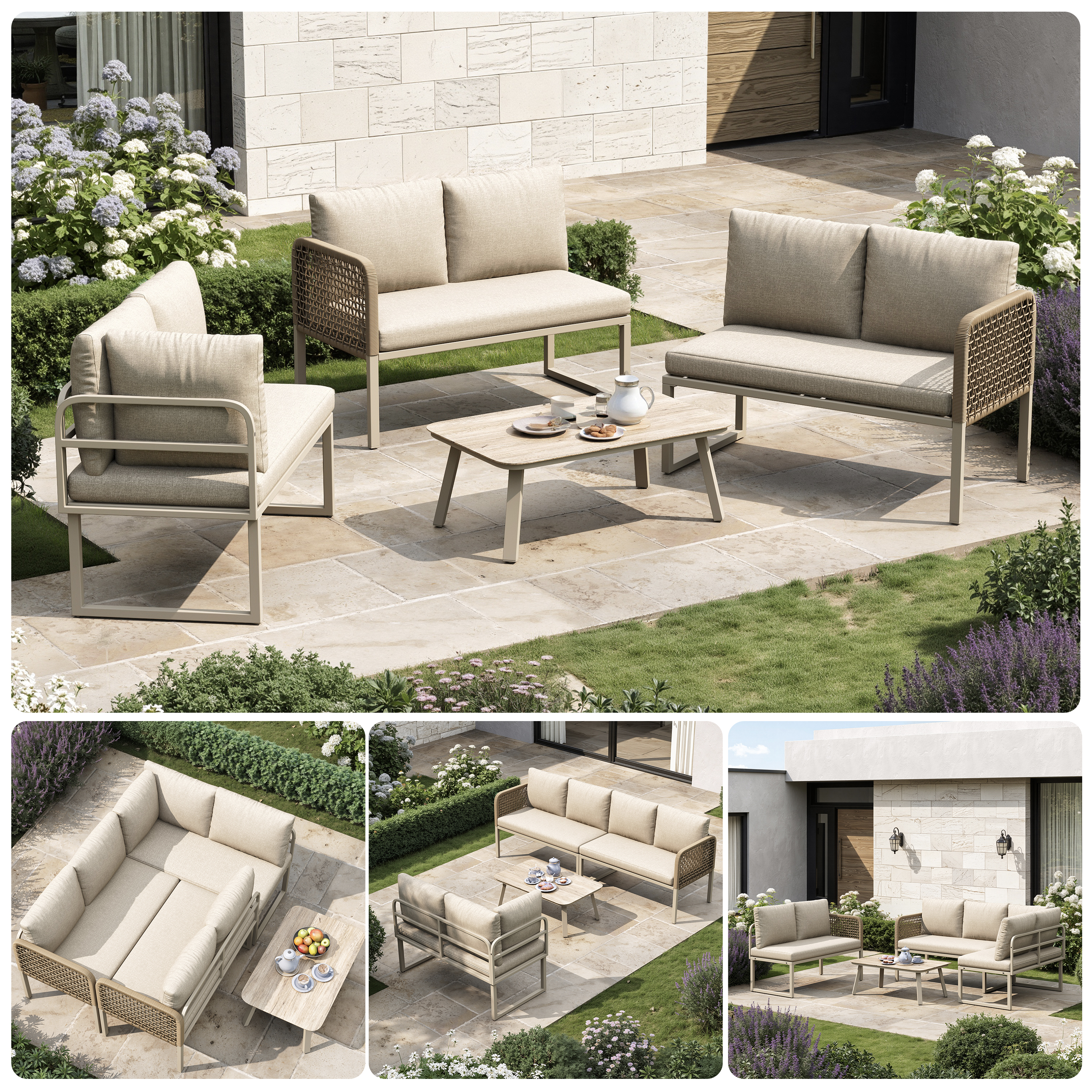- Wood-look tempered glass coffee table ( Please note that coasters should be used when drinking hot beverages) - Convertible 5-6 seater modular arrangement - Weatherproof linen fabric & high density cushion - Hand woven all weather polyester rope - Modern appearance suitable for suitable for balconies, terraces, gardens and other settings
