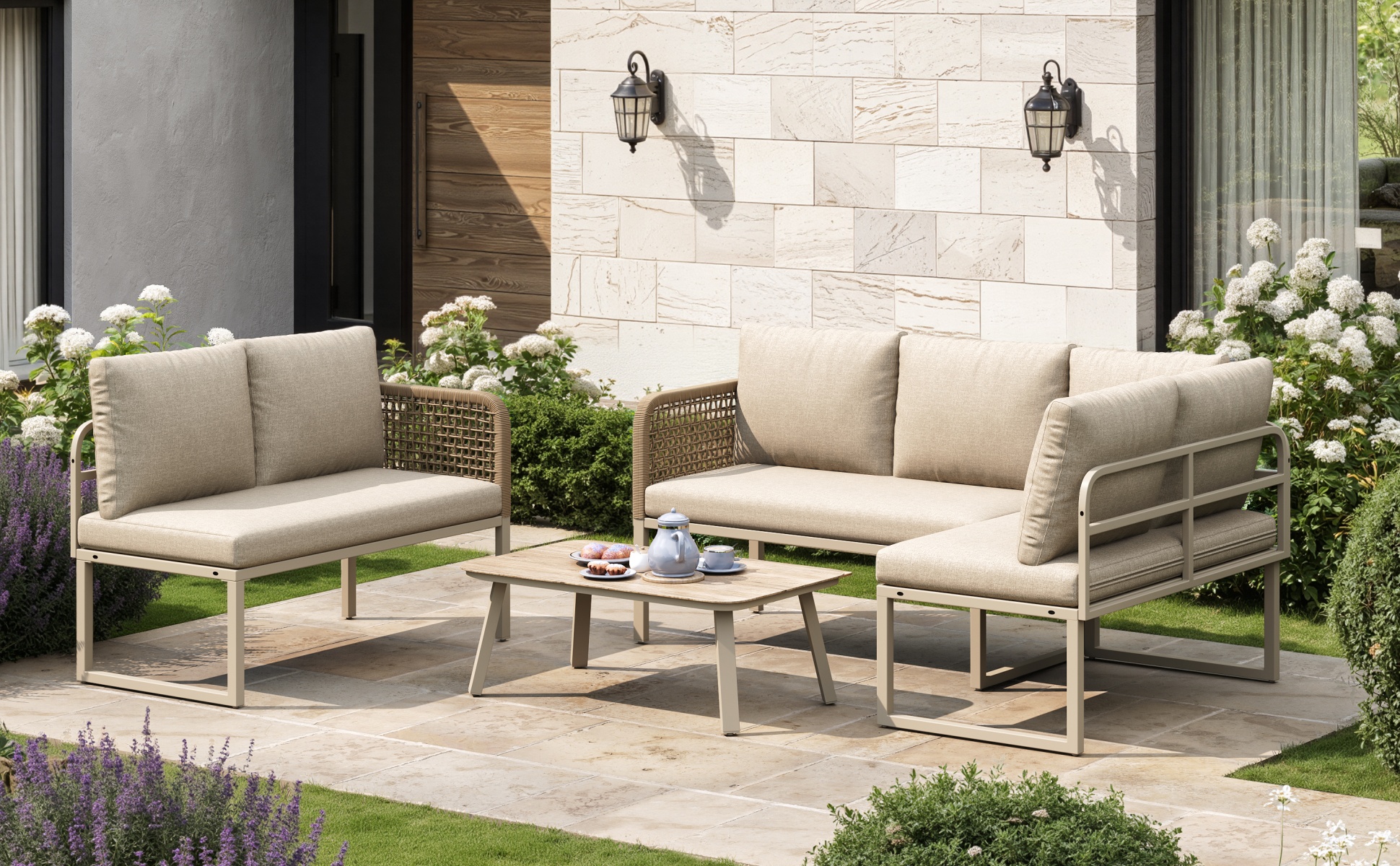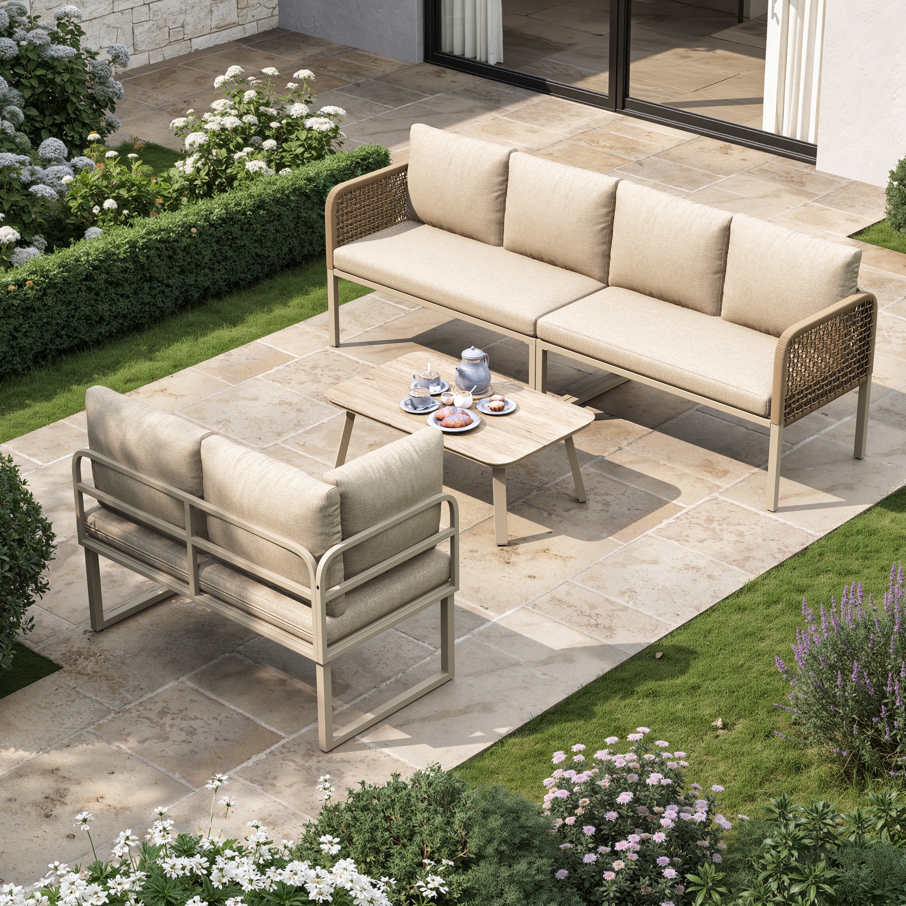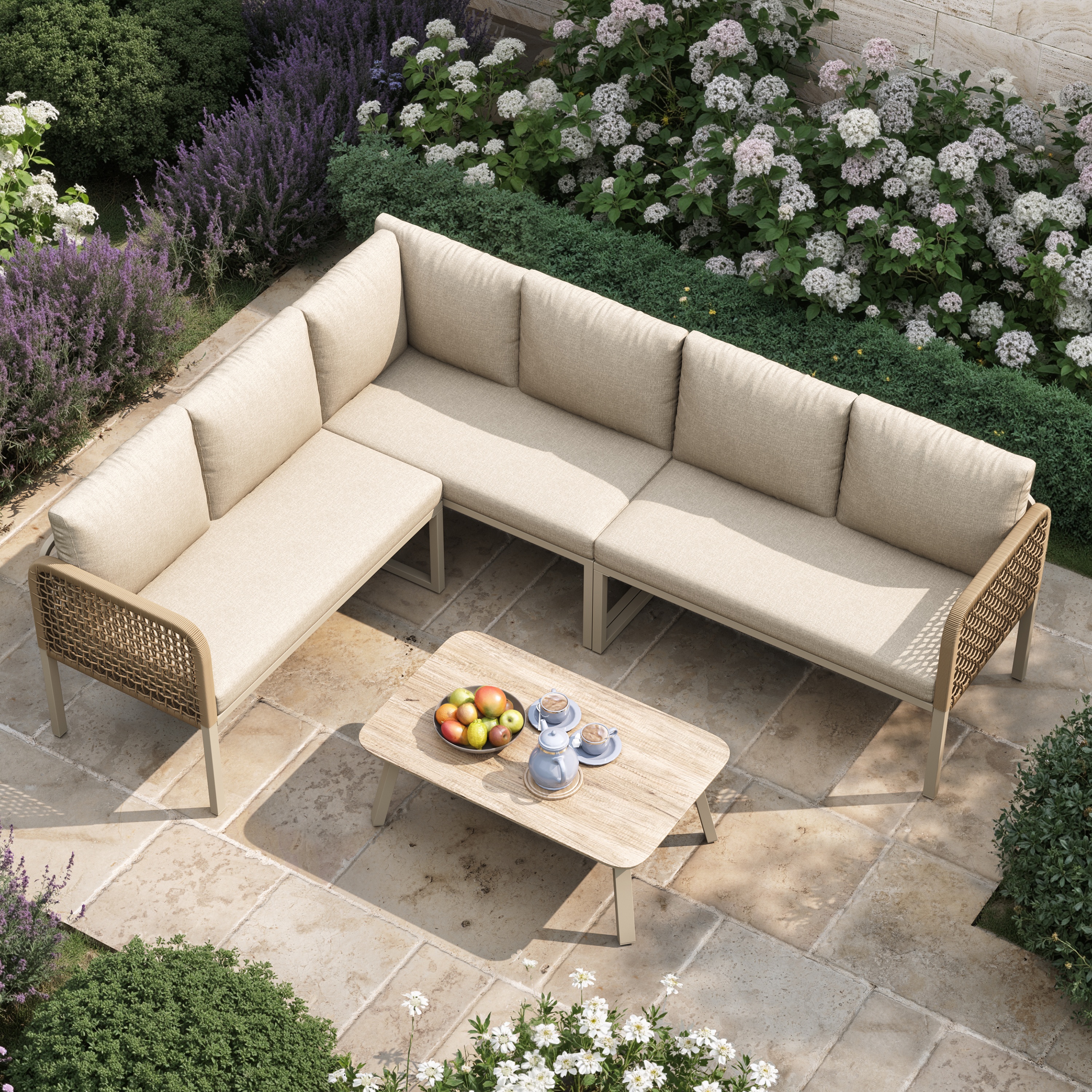 • [Flexible 5-6 Seater Modular Arrangement] Designed with versatility in mind, this 5-6 seater modular set can be easily rearranged to suit different outdoor scenes and layouts. Whether you need a classic L-shaped corner sofa for social gatherings or a more spread-out seating plan for sunbathing, this set adapts to your specific needs. It can be flexibly converted into various modules such as two-seater armrests sofas, lounge sofa and corner sofas. Paired with a coffee table.