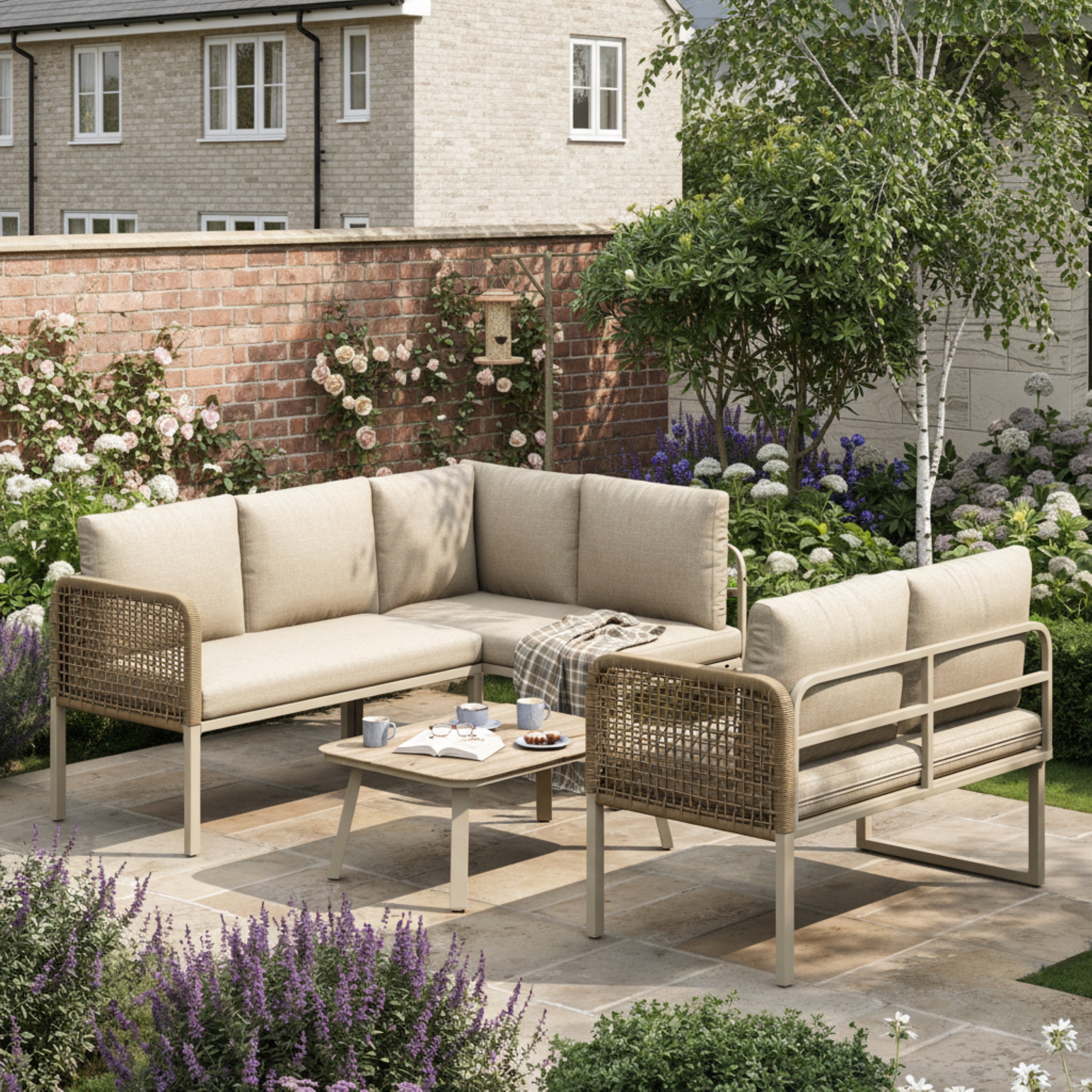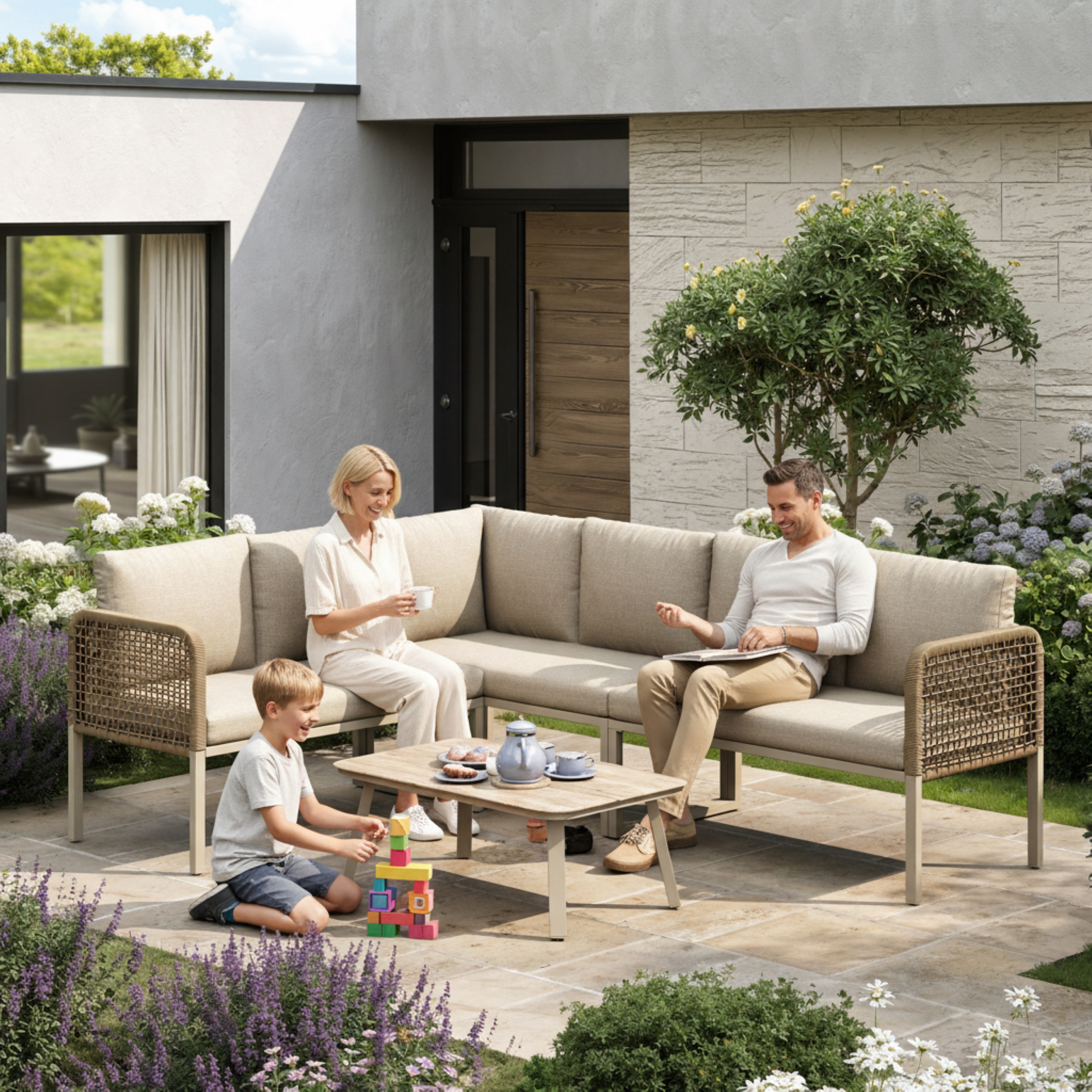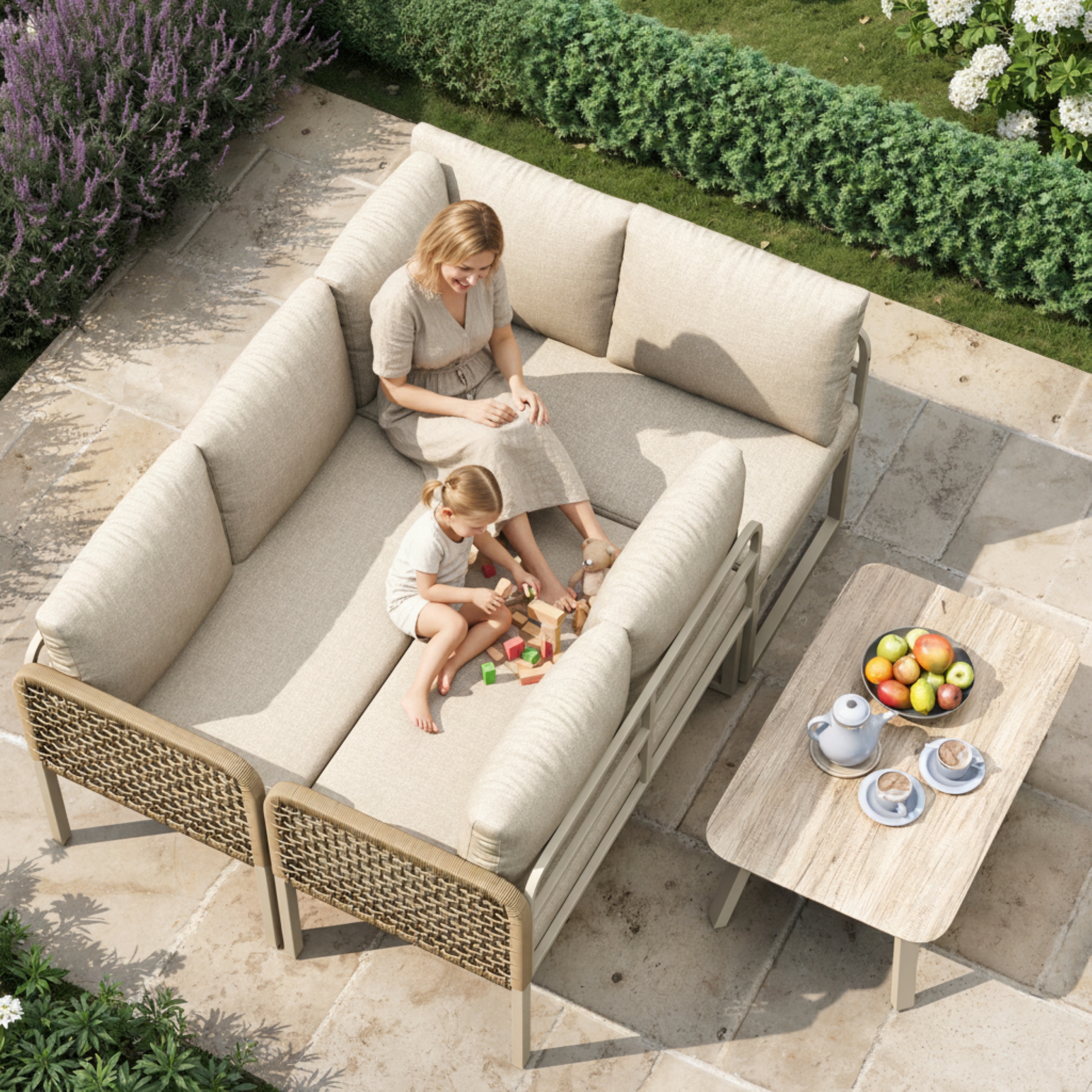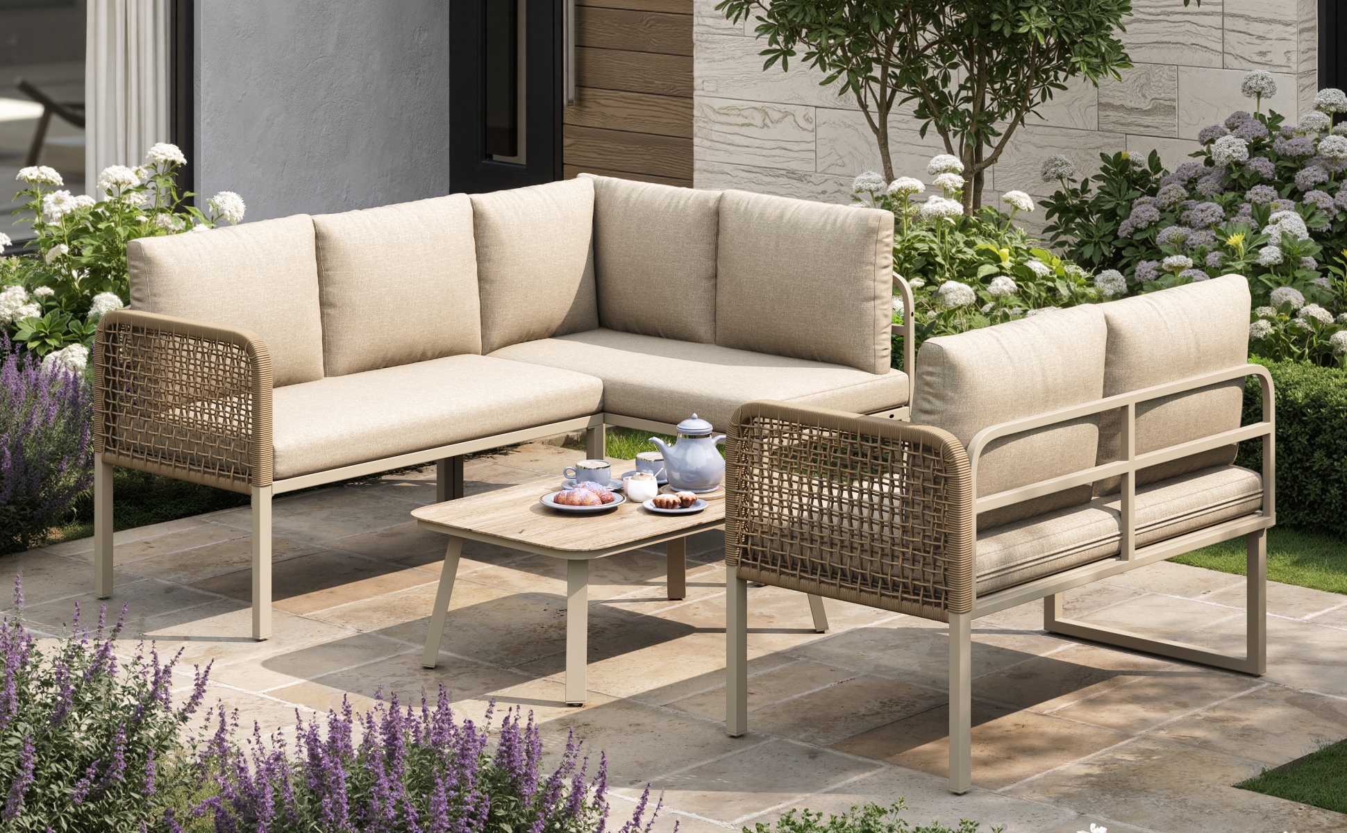 • [Flexible 5-6 Seater Modular Arrangement] Designed with versatility in mind, this 5-6 seater modular set can be easily rearranged to suit different outdoor scenes and layouts. Whether you need a classic L-shaped corner sofa for social gatherings or a more spread-out seating plan for sunbathing, this set adapts to your specific needs. It can be flexibly converted into various modules such as two-seater armrests sofas, lounge sofa and corner sofas. Paired with a coffee table.