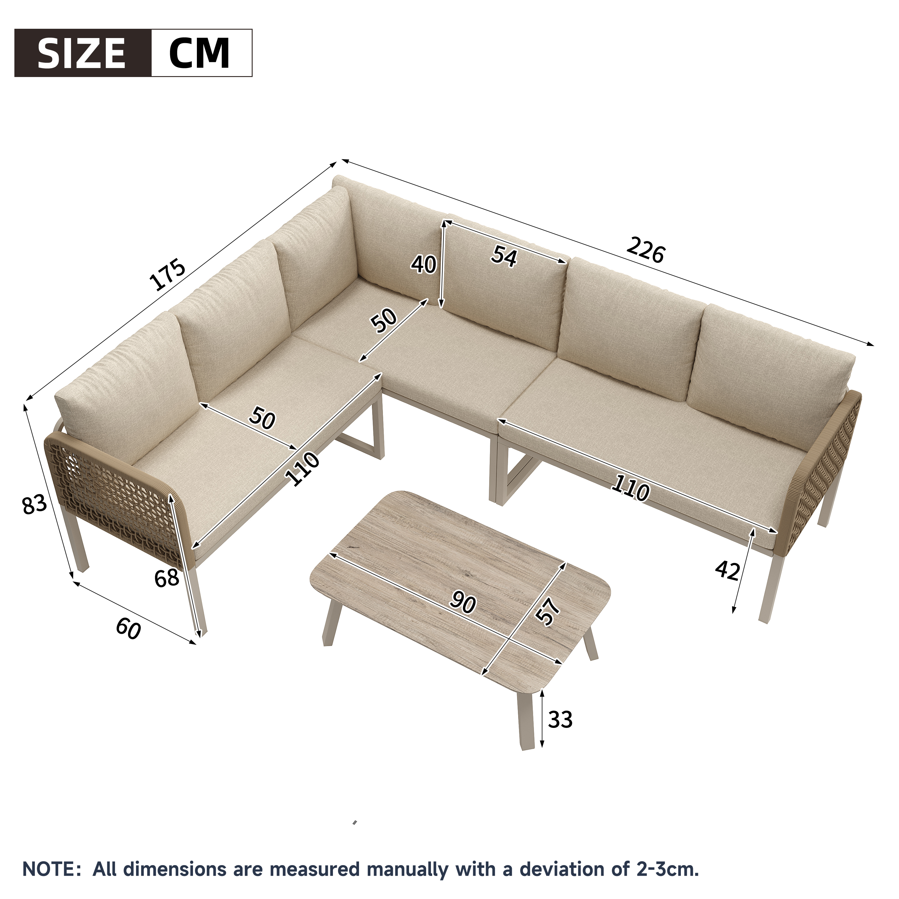 Product Name:5-6 Seater Garden Furniture Set with Wood-look Tempered Glass Coffee Table, L-Shaped Corner Sofa with Polyester Rope, Weatherproof Outdoor Patio Dining Lounge Set for Balcony and Terrace, Linen, Beige
