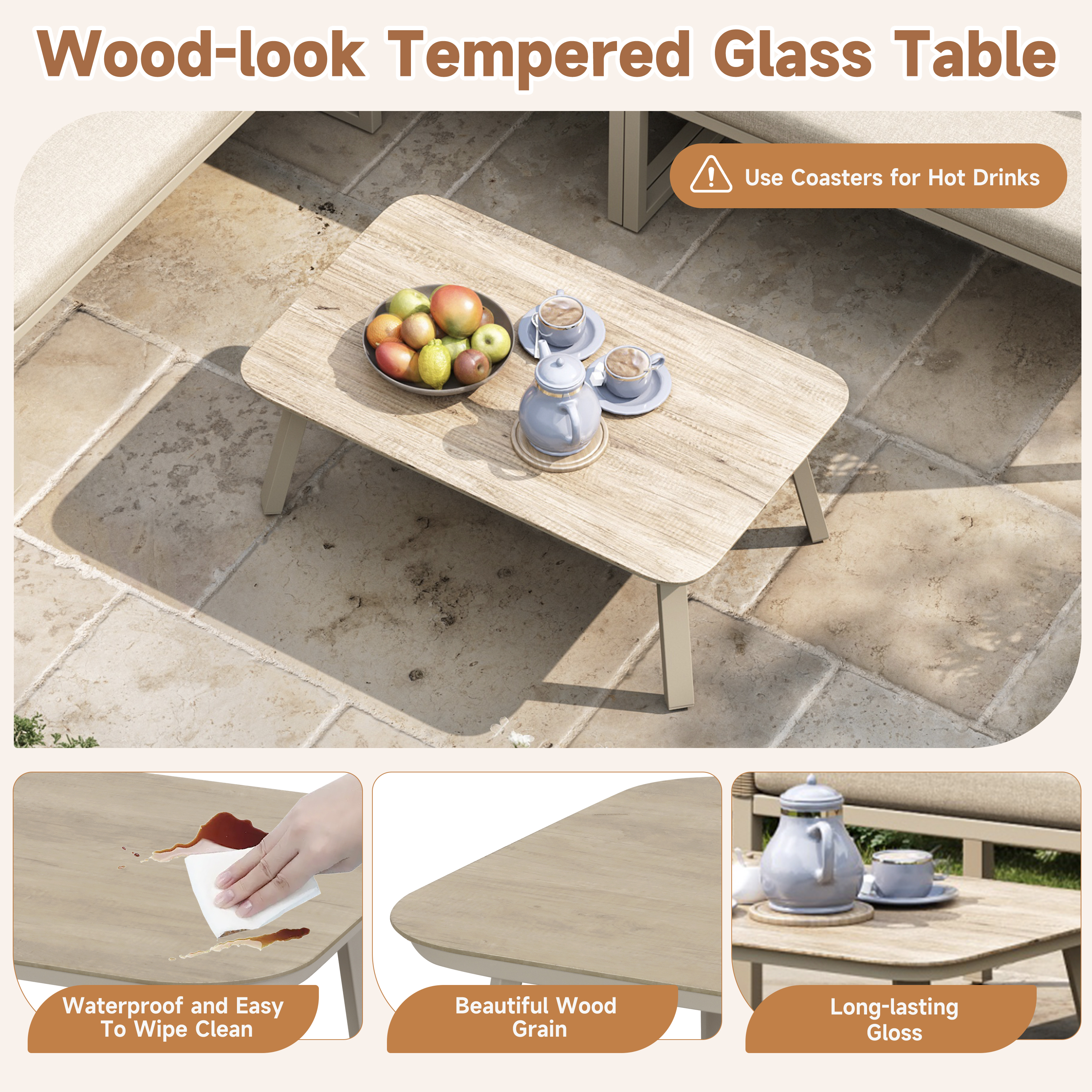 • [Sophisticated Wood-look Tempered Glass Table] The set includes a matching coffee table with a premium wood-look tempered glass top. It combines the natural aesthetic of wood with the superior durability and easy maintenance of tempered glass, providing a stable and stylish surface for drinks and snacks while incorporating outdoor elements. Please note that coasters should be used when drinking hot beverages.